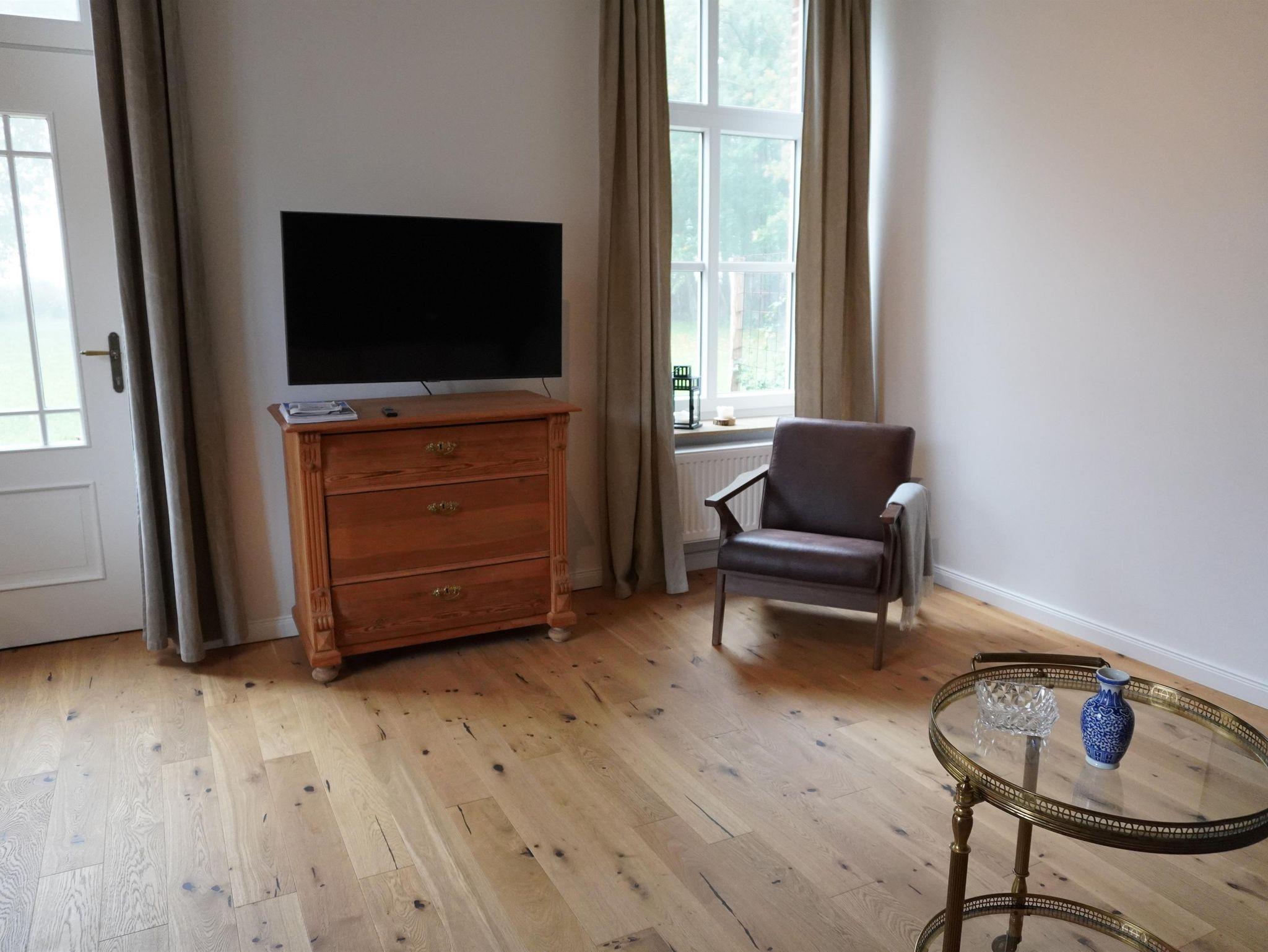 Kaarnhaus: Das alte Kaarnhaus stellt ehemals die Verbindung zwischen Wirtschafts- und Wohngebäude da. Jetzt ist hier eine 79m² gemütliche Wohnung für vier Personen entstanden. Im Erdgeschoss befindet sich der Wohn- und Essbereich mit einem gemütlichen Kamin, einer vollausgestatteten Küche, eine Couch und ein Sat-Tv. Im Obergeschoss ist ein Doppelzimmer sowie ein Zweibettzimmer vorhanden. Außerdem befindet sichim Obergeschoss das Badezimmer mit einem WC und einer Dusche. Die Terrasse ist nach Südwesten ausgerichtet.