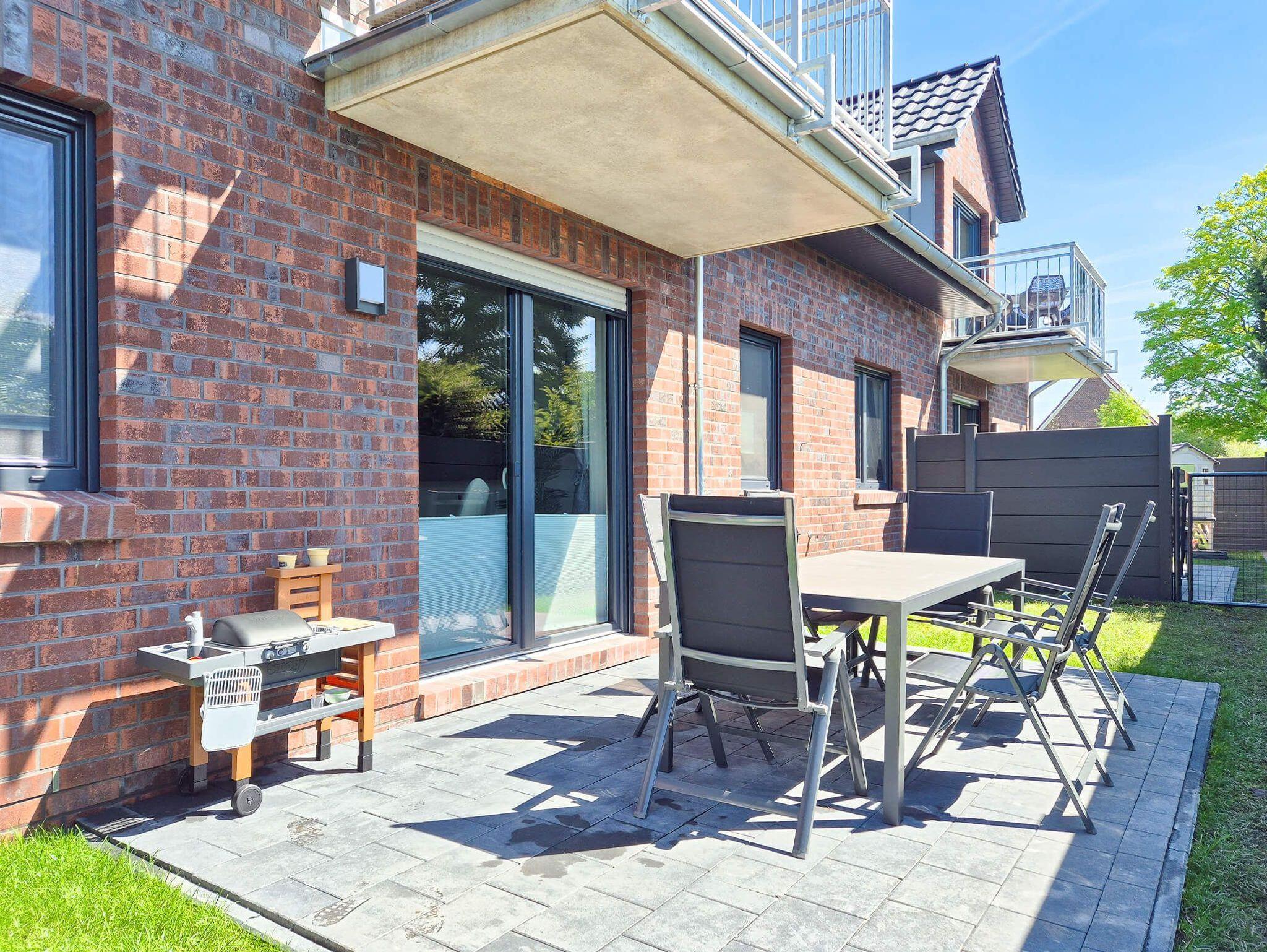 Im eigenen Garten, der komplett eingezäunt ist (Hunde können frei laufen), ist neben einem tollen Sandkasten für Kinder auch eine einladende Terrasse mit Holzkohlegrill zu finden.
