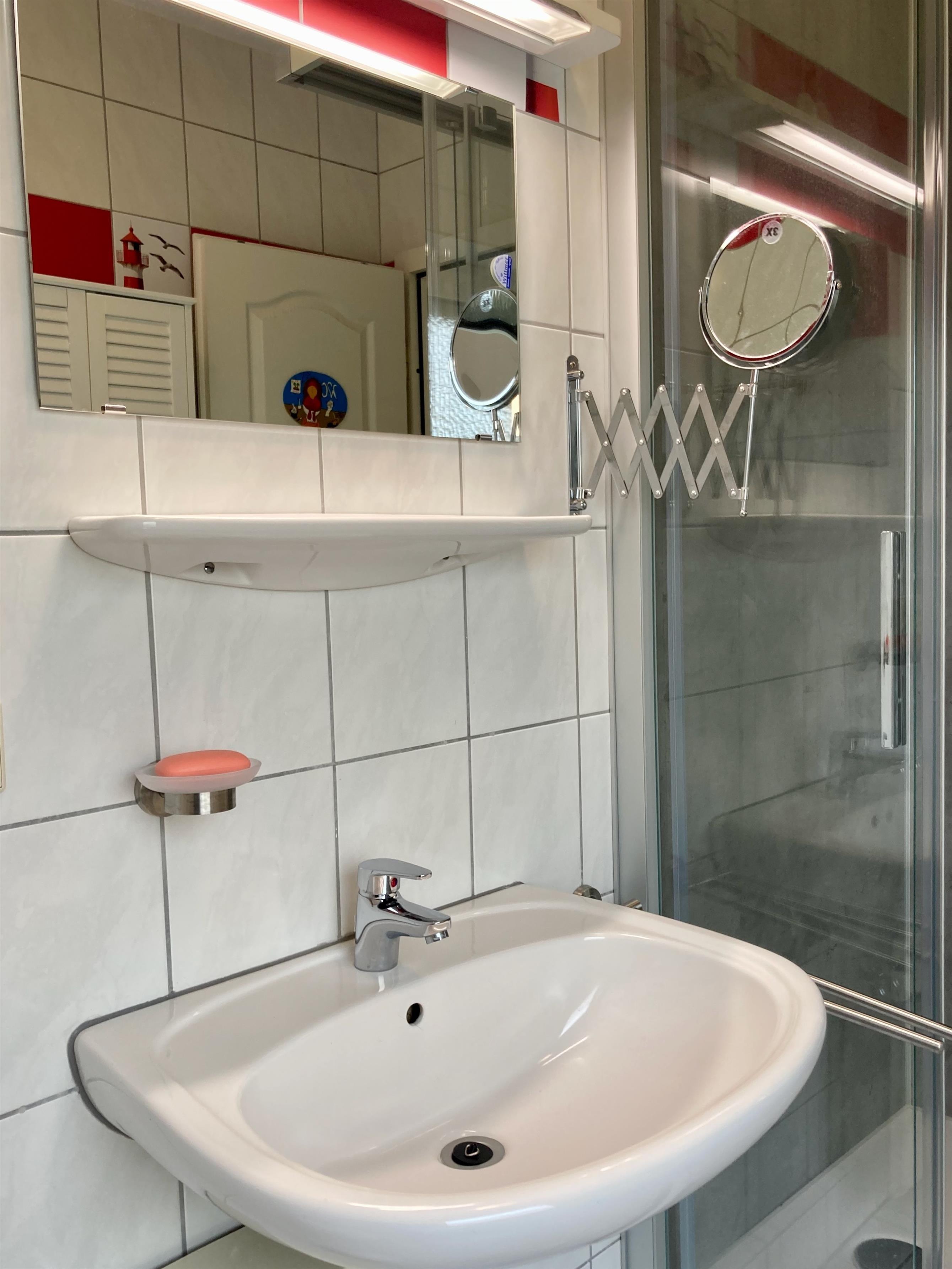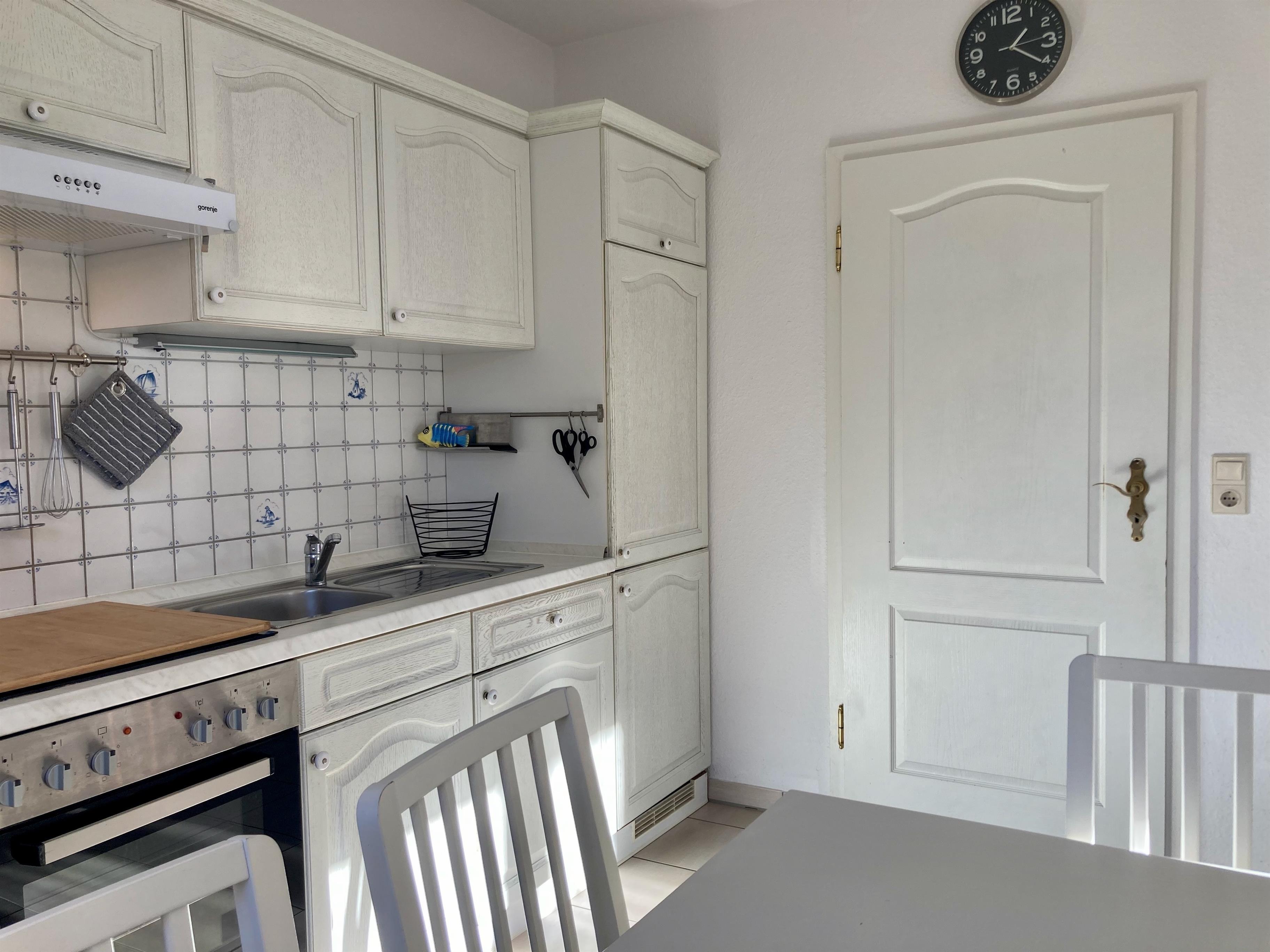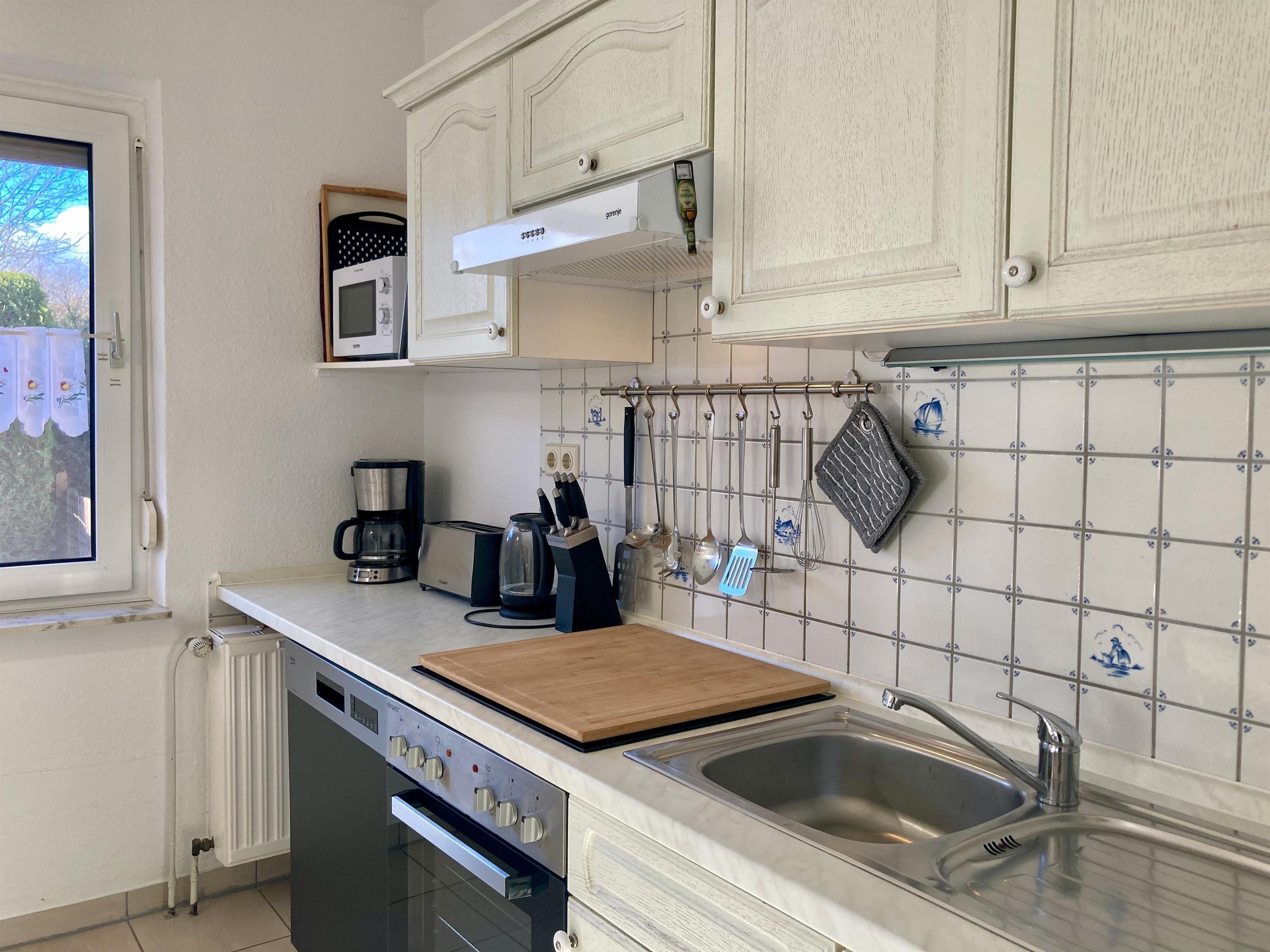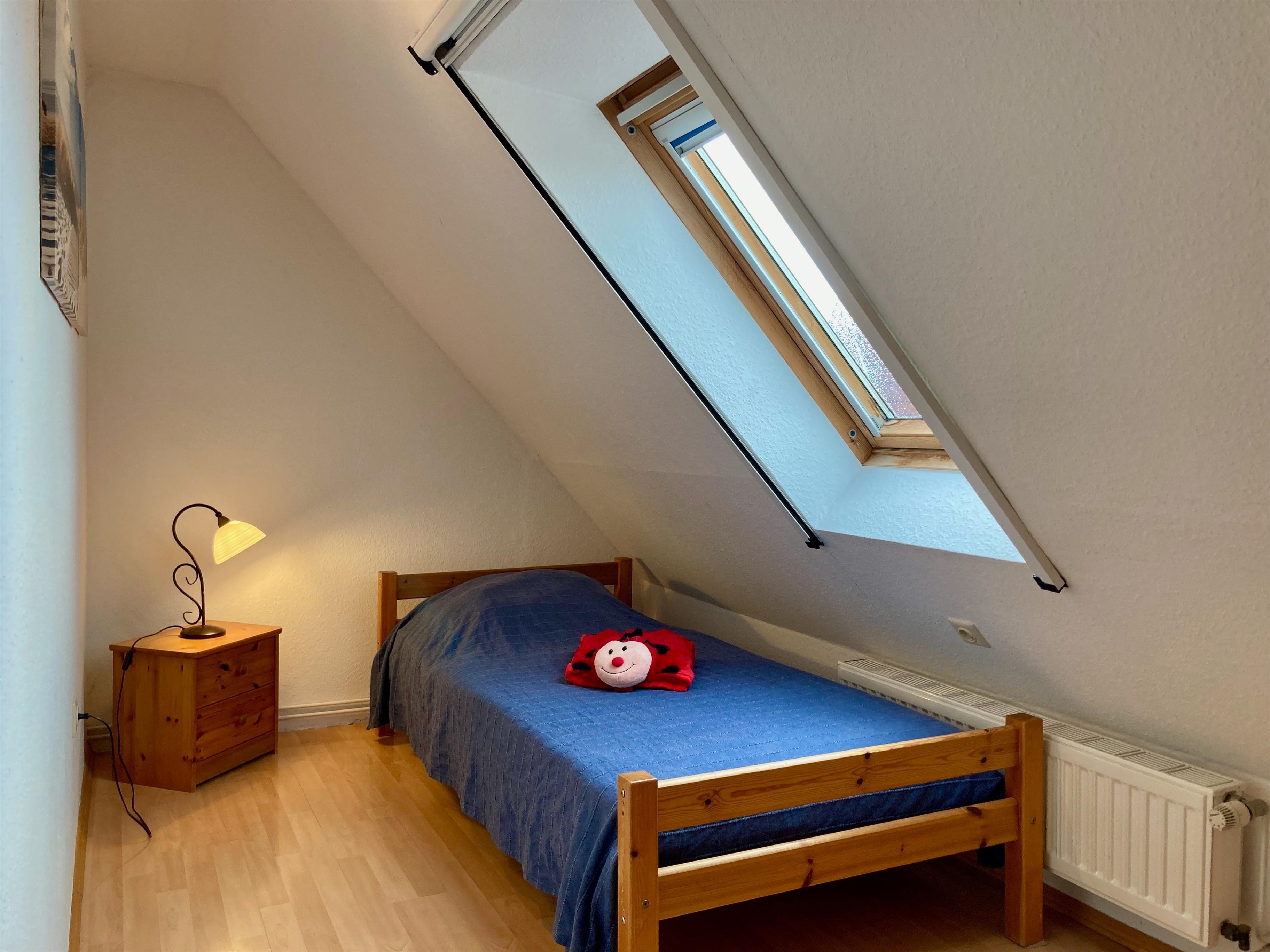 Erdgeschoss: Flur. Wohnraum mit Sitzgruppe, Sat-TV (Amazon-Fire-TV), Radio/CD, Internetzugang (wlan, gratis), Terrassenausgang. Zum Wohnraum offene Küche mit Einbauherd (4 Ceranfelder, Backofen), Geschirrspüler, Kühlschrank, Mikrowelle, Airfryer, Kaffeemaschine, Toaster, Wasserkocher sowie Essplatz (Esstisch ausziehbar). Schlafzimmer mit Boxspringbett (1,40 m x 2 m), kleine Sitzecke. Dusche/WC mit Waschmaschine. Vom Flur Treppe ins Obergeschoss (Dachschrägen): Doppelzimmer mit kleiner Sitzecke. Einzelzimmer. WC. Abstellraum.