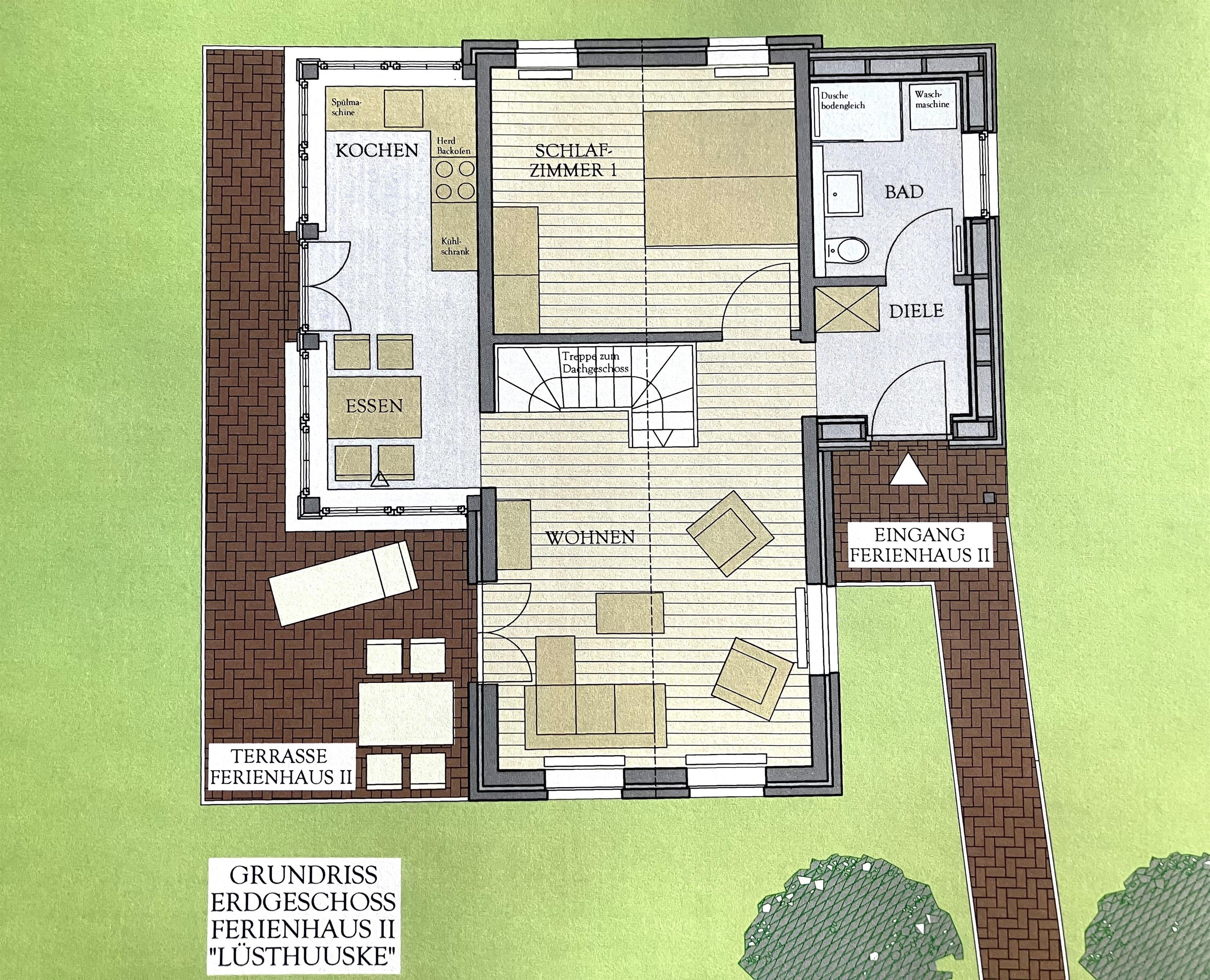 Ferienhaus Lüsthuuske (ca. 70 m² Wohnfläche) verfügt über ein Wohnzimmer und zwei Schlafzimmer. Die Küche befindet sich in einer typisch ostfriesischen Veranda mit Essplatz und wunderschöner Aussicht. Das Haus verfügt über ein modernes Tageslichtbad, eine sichtgeschützte Gartenterrasse mit hochwertigen Fermob- Gartenmöbeln und eine Spiel- und Liegewiese im großen Garten. Das freistehende Lüsthuuske bietet Platz für 4 Personen zur alleinigen Nutzung.