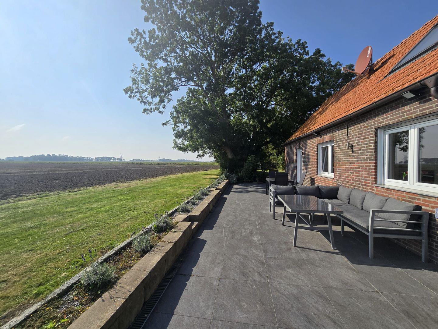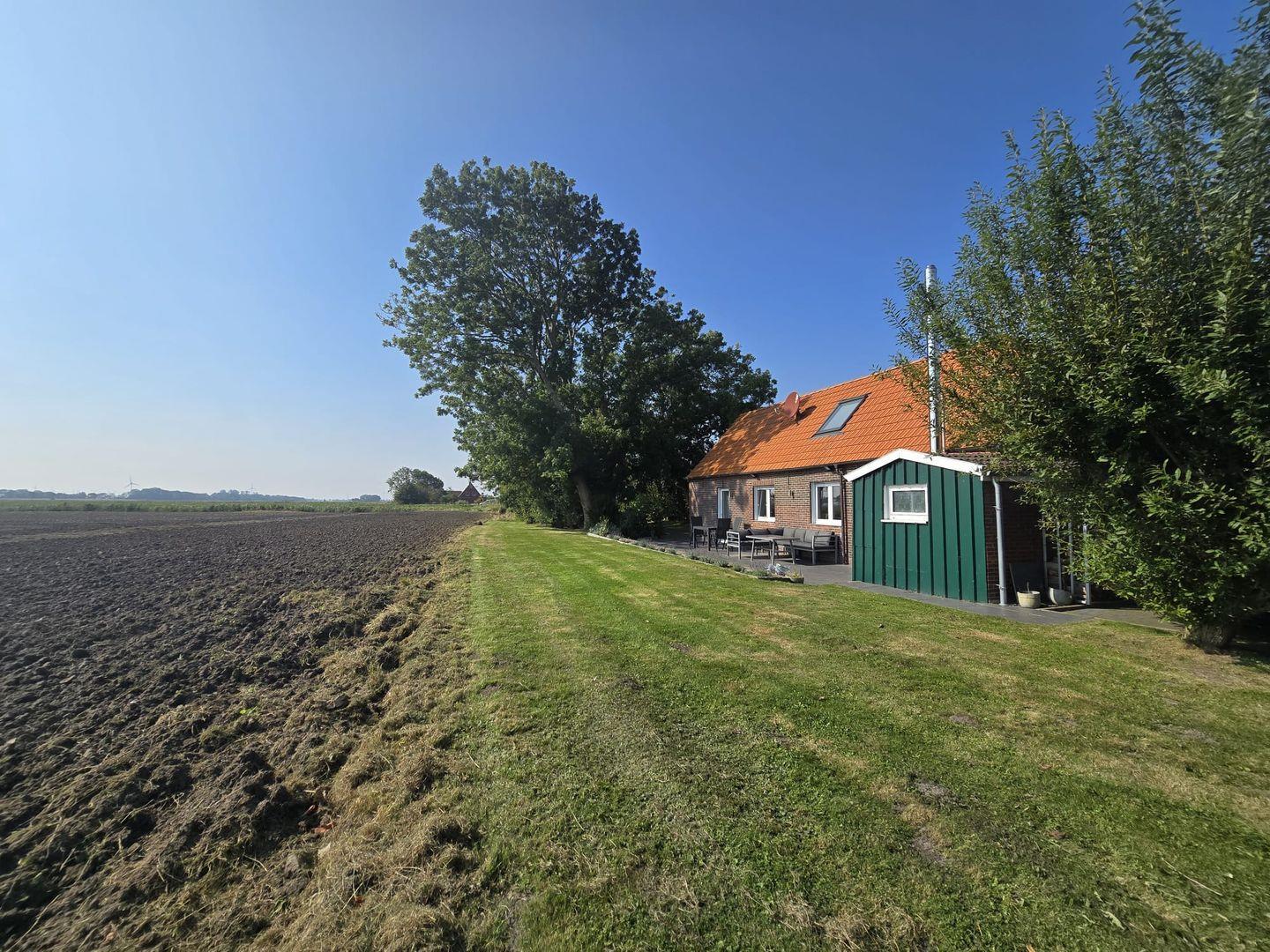Die sonnige Terrasse lädt zum Entspannen im Freien ein. Hier können Sie die Ruhe genießen, ein Buch lesen, die frische Nordseeluft einatmen oder gemeinsam mit Familie und Freunden grillen. Der Panoramablick über die Felder und das Umland macht jeden Moment im Freien besonders.