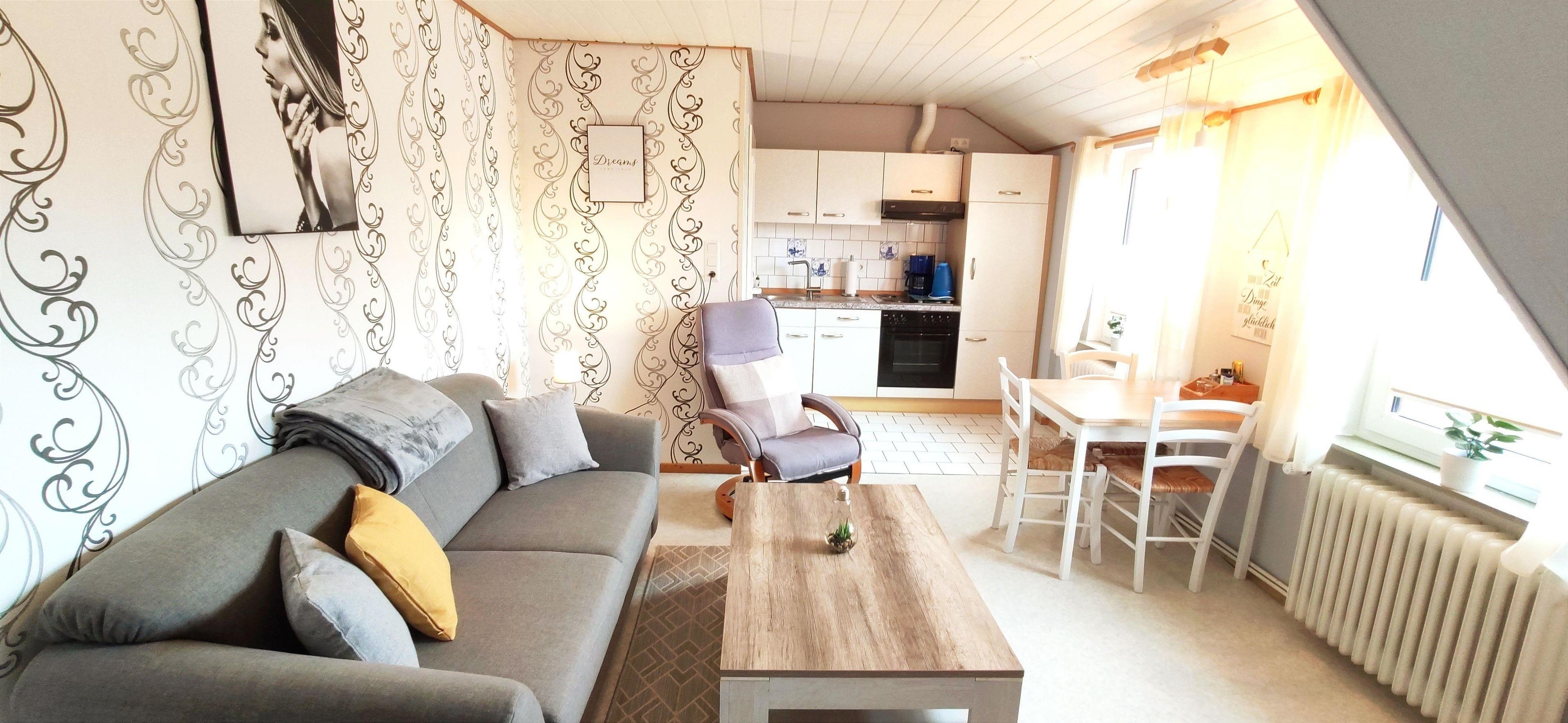Unsere helle und freundlich eingerichtete Nichtraucher-Ferienwohnung (ca. 47 qm) befindet sich im Obergeschoss unseres Gästehauses.