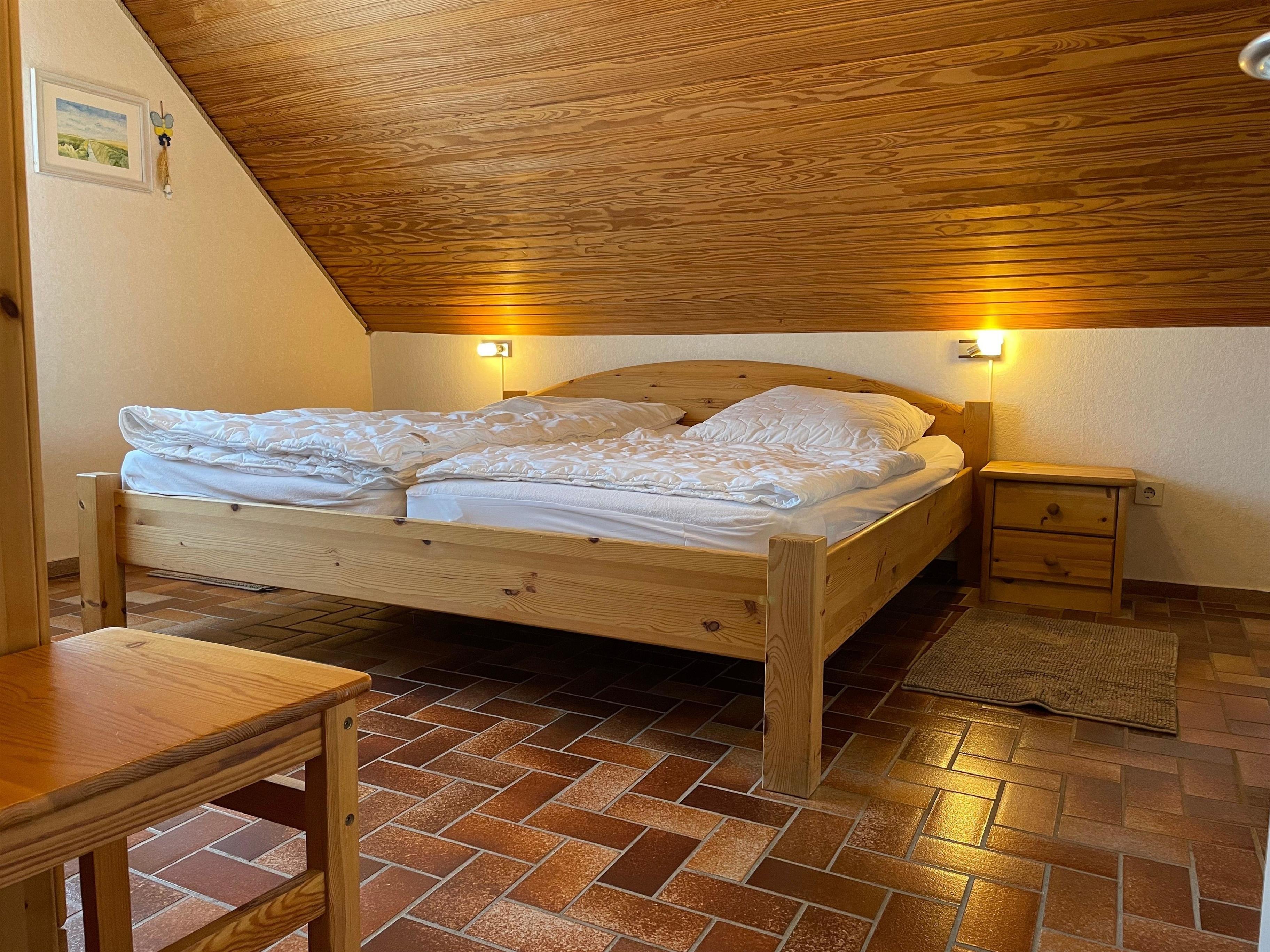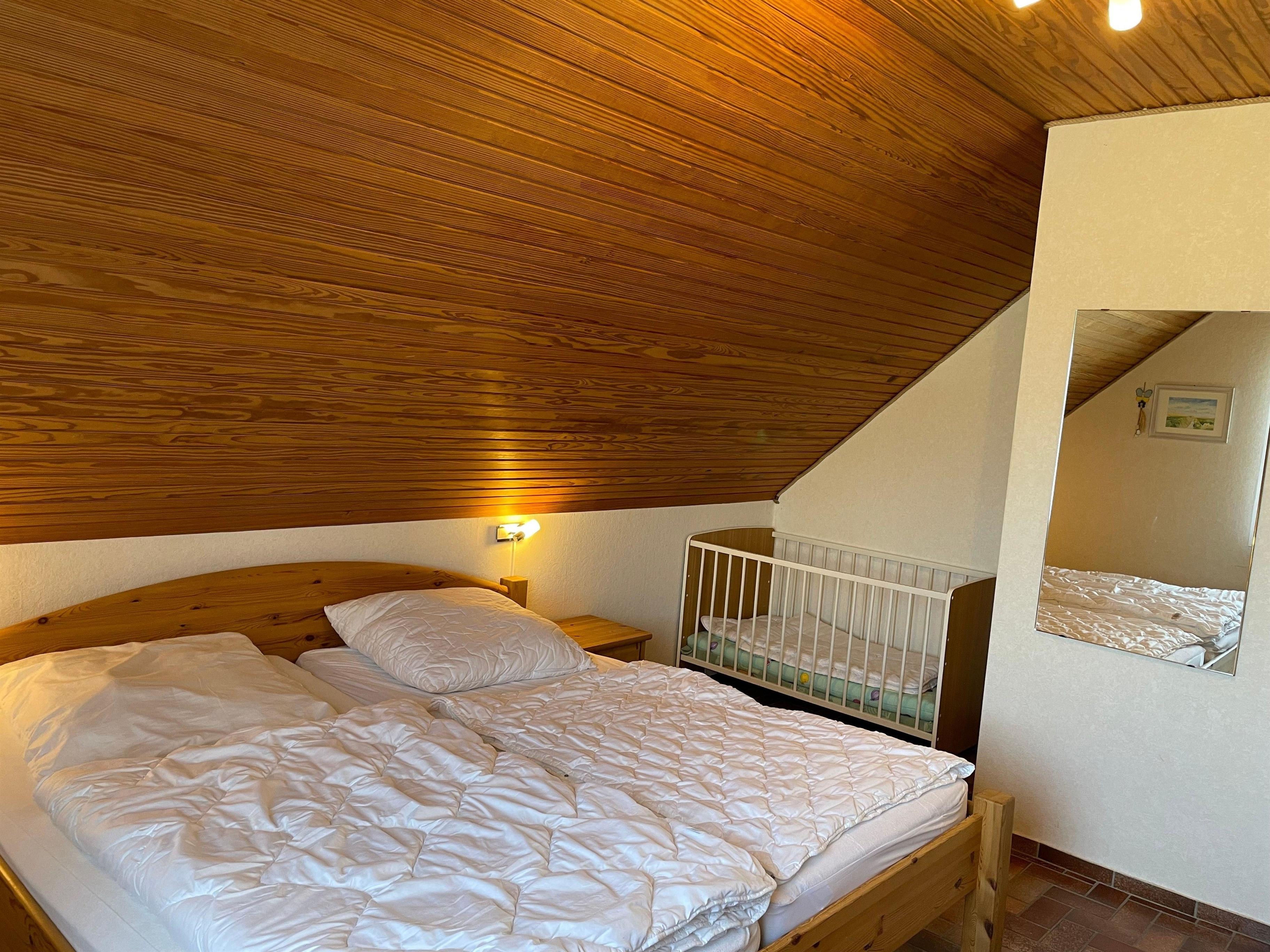Im Obergeschoss steht Ihnen das Elternschlafzimmer mit Doppelbett und einem Kinderbett sowie ein Schlaf-/Kinderzimmer mit 3 Einzelbetten, einem Tisch und Stühlen zur Verfügung. Des Weiteren ist im Obergeschoss ein Duschbad vorhanden.