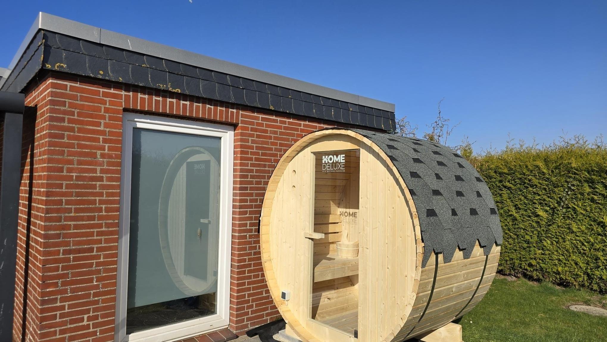 Im Garten finden Sie eine kleine Fass-Sauna.