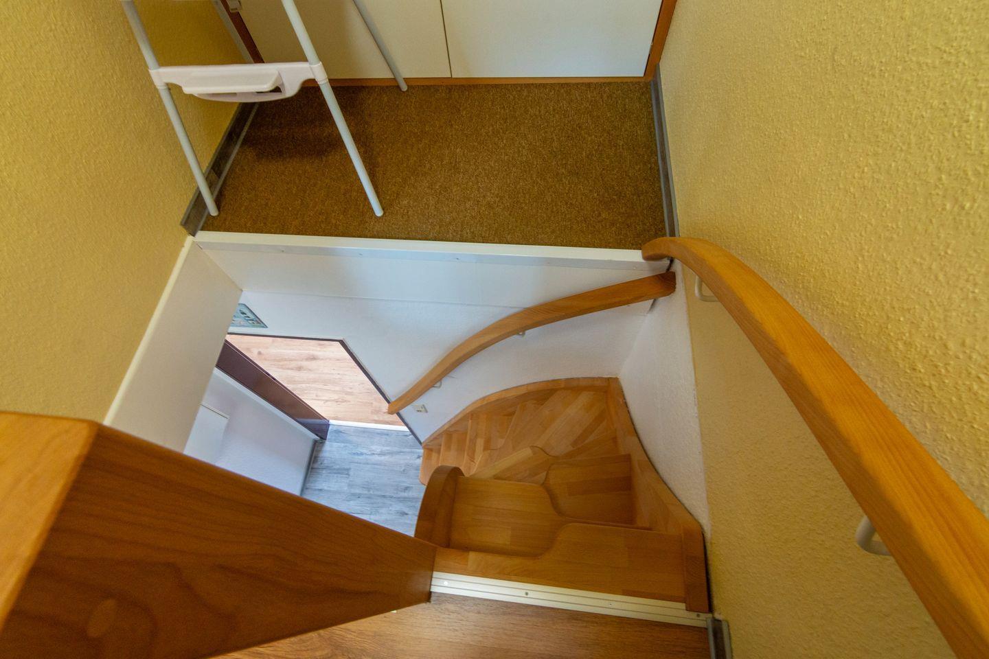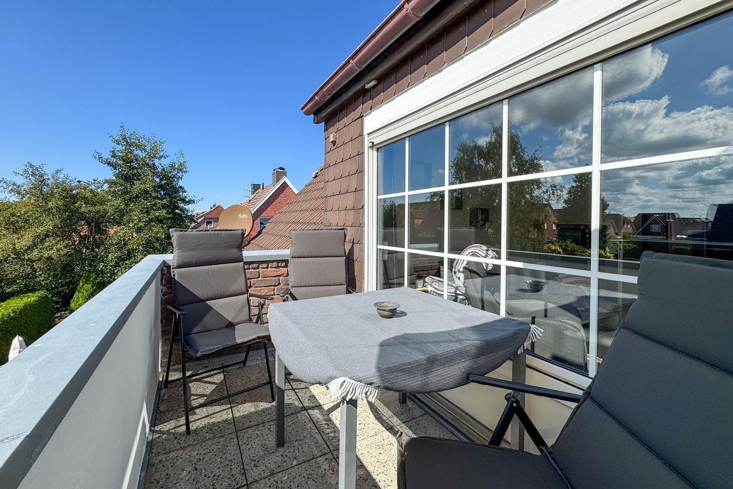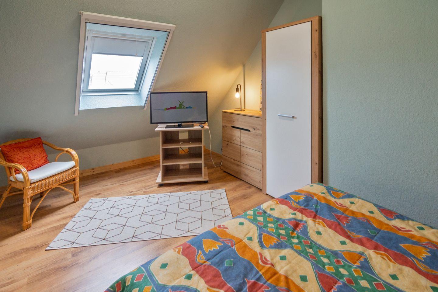 Die Wohnung umfasst drei Zimmer, darunter zwei Schlafzimmer mit Laminatböden. Im unteren Schlafzimmer steht ein Kinderreisebett bereit. Das zweite Schlafzimmer mit Ehebett befindet sich im ausgebauten Dachgeschoss, erreichbar über eine schmale Treppe. Der helle Wohnbereich ist offen gestaltet, mit Sitzecke, Essbereich und einem Balkon mit Gartenmöbeln und Sonnenschirm für entspannte Stunden.