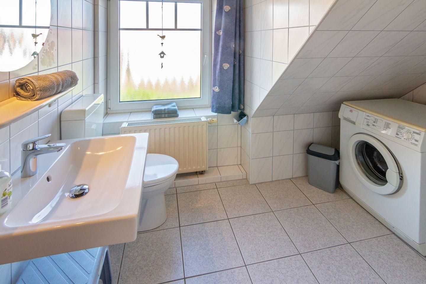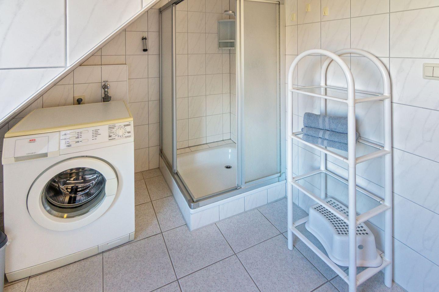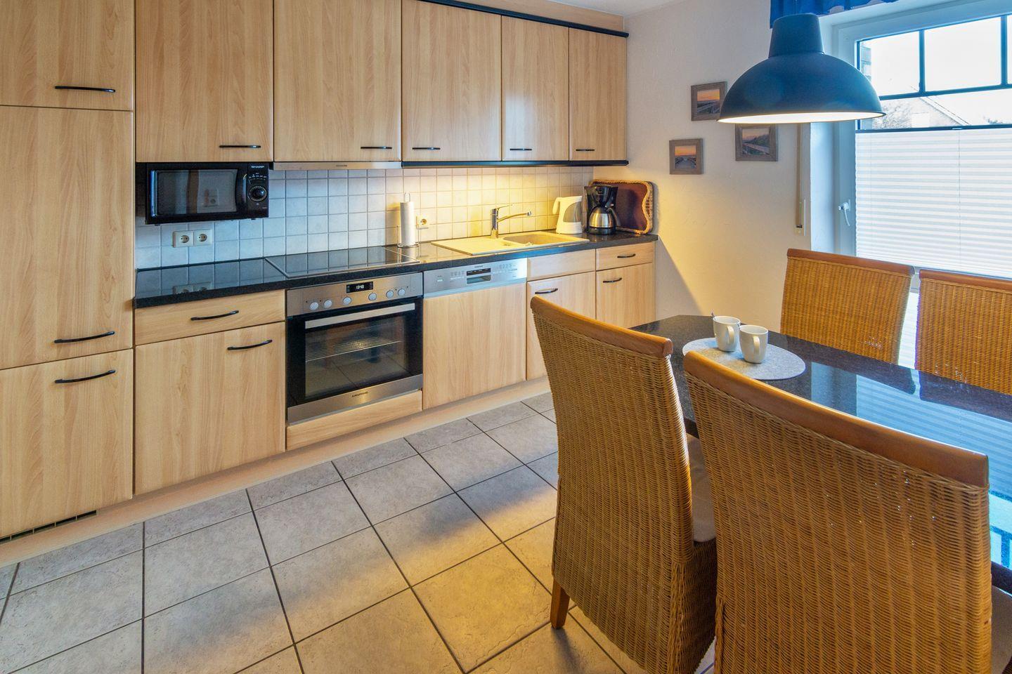 Die voll ausgestattete Küche lässt keine Wünsche offen: Ceranfeld, Backofen, Mikrowelle, Spülmaschine, Kühlschrank mit Gefrierfach, Kaffeemaschine, Toaster, Mixer und vieles mehr. Ein Bad mit Dusche sowie ein zusätzliches Gäste-WC sorgen für Komfort.