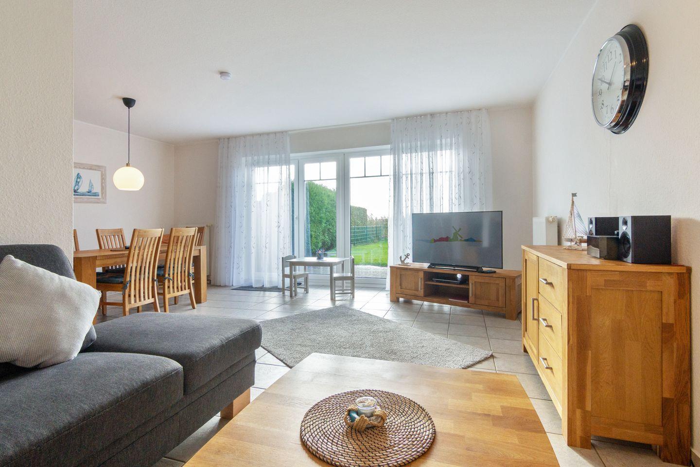 Innen empfängt Sie ein helles, modernes Ambiente mit Fußbodenheizung im gesamten Haus, drei gemütlichen Schlafzimmern und einem einladenden Wohnzimmer mit Sat-TV, DVD-/CD-Player, HiFi-Anlage, Büchern und Spielen. WLAN ist selbstverständlich inklusive.