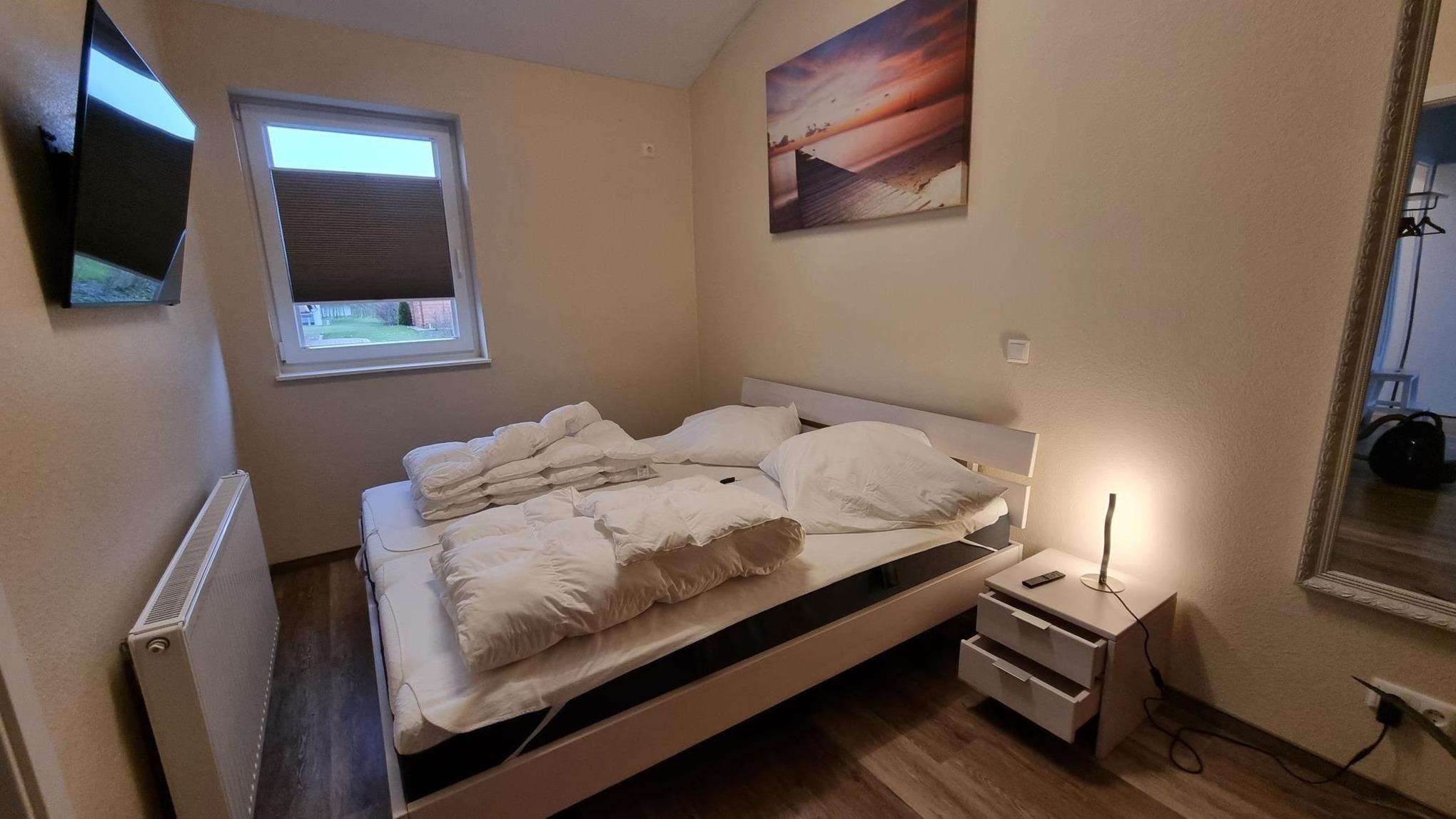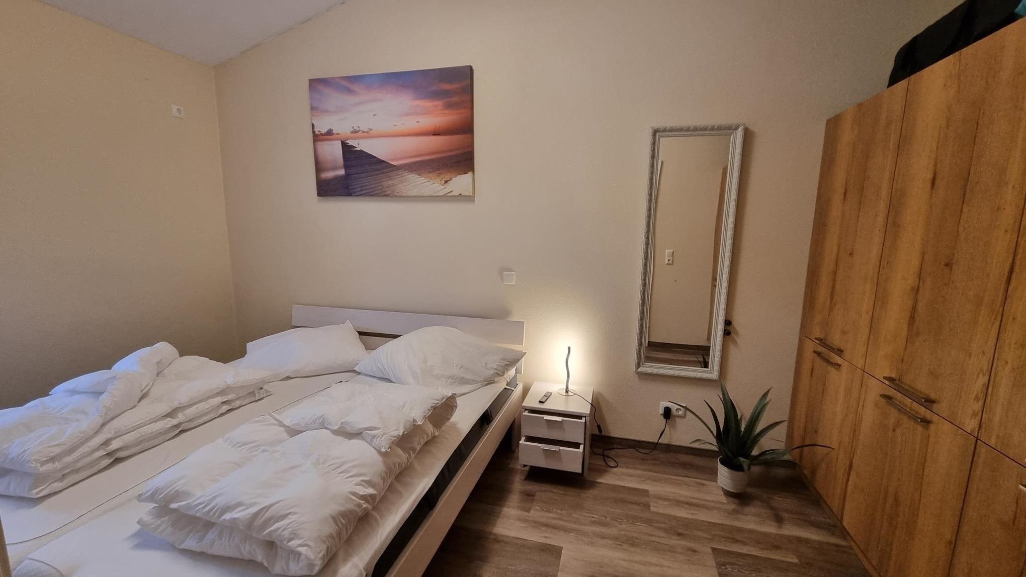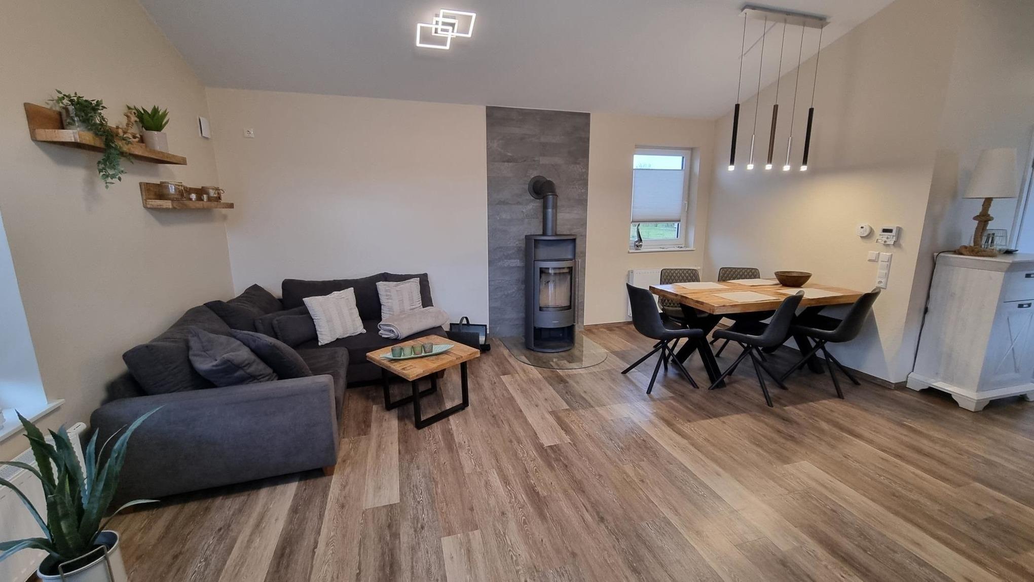 Die Betten in beiden Schlafzimmern sowie der Ess- und Couchtisch sind alle komplett aus Massivholz gefertigt, der 55" große Fernseher mit Sky Sendern lädt zum Verweilen auf dem Sofa ein. Dieses lässt sich ausziehen, sodass die gesamte Familie zum Kuscheln darauf Platz findet.