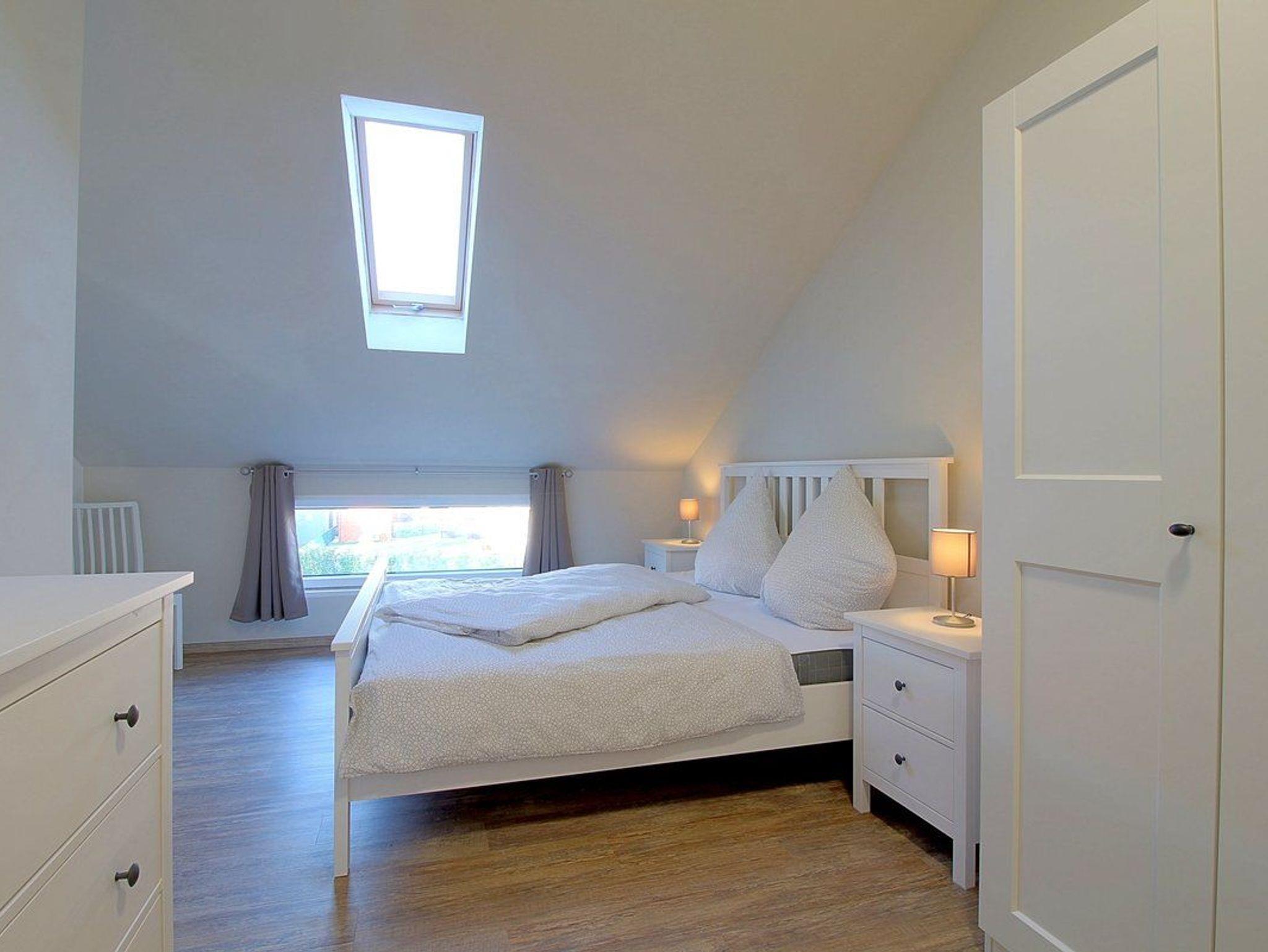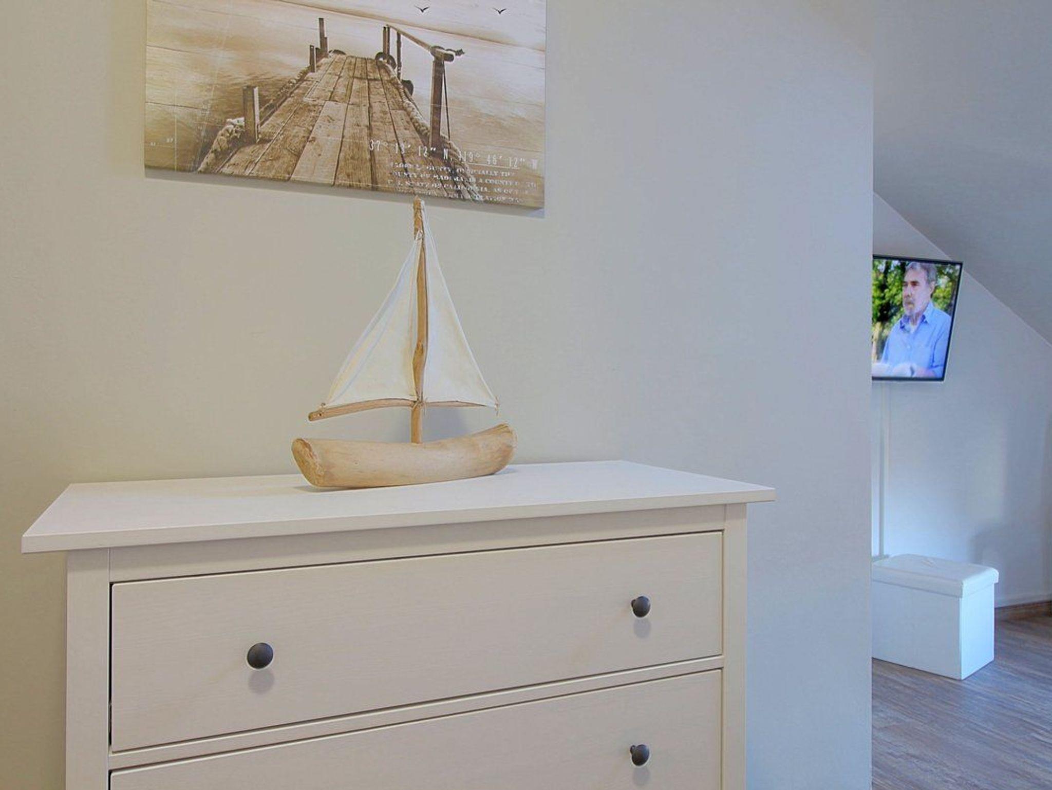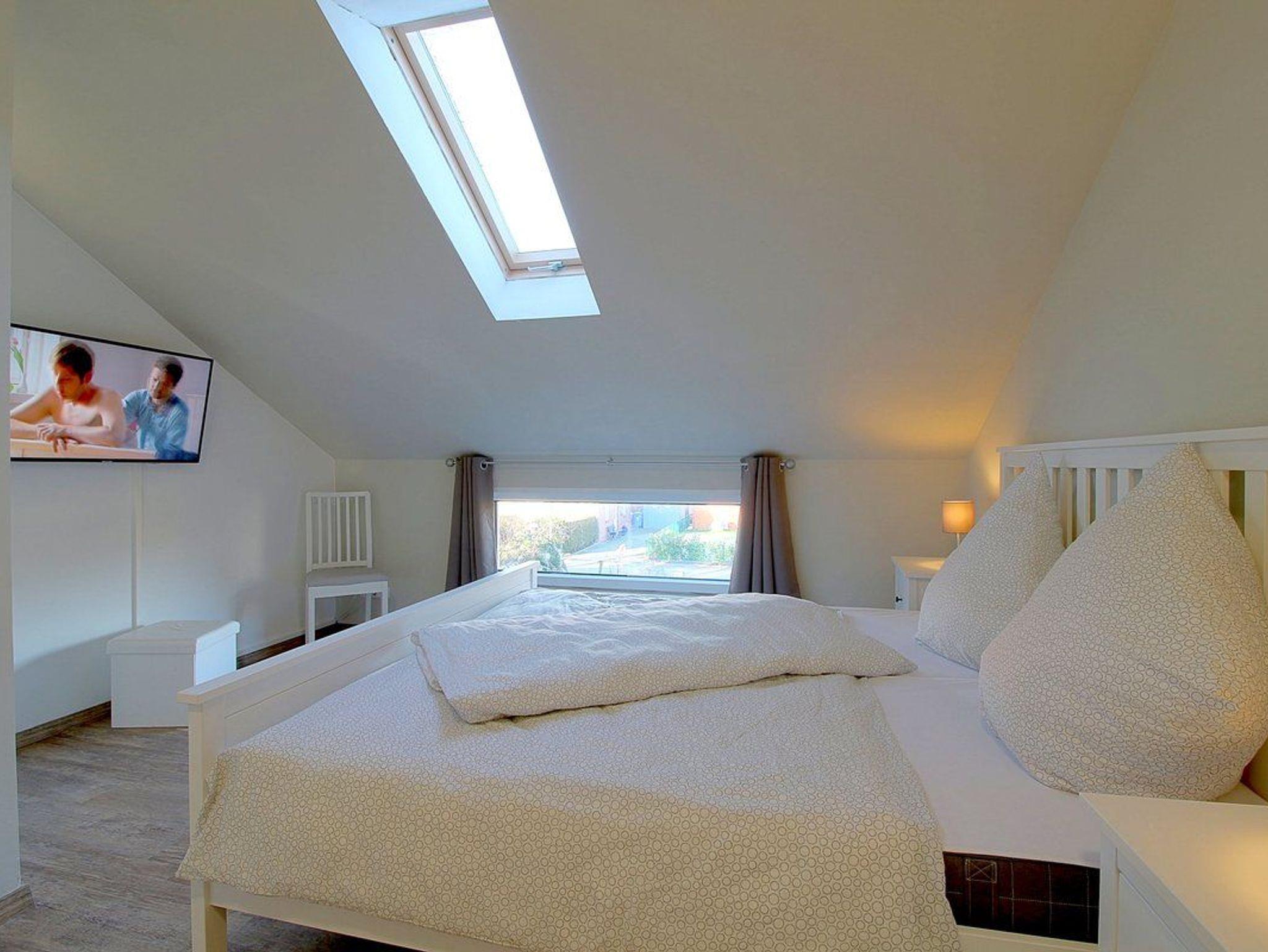 Im Obergeschoss befinden sich zwei Schlafzimmer, eins mit Doppelbett (1,80 x 2,00 m) und TV, sowie ein Schlafzimmer mit zwei Einzelbetten ( 0,90 x 2,00 m) und ebenfalls TV.