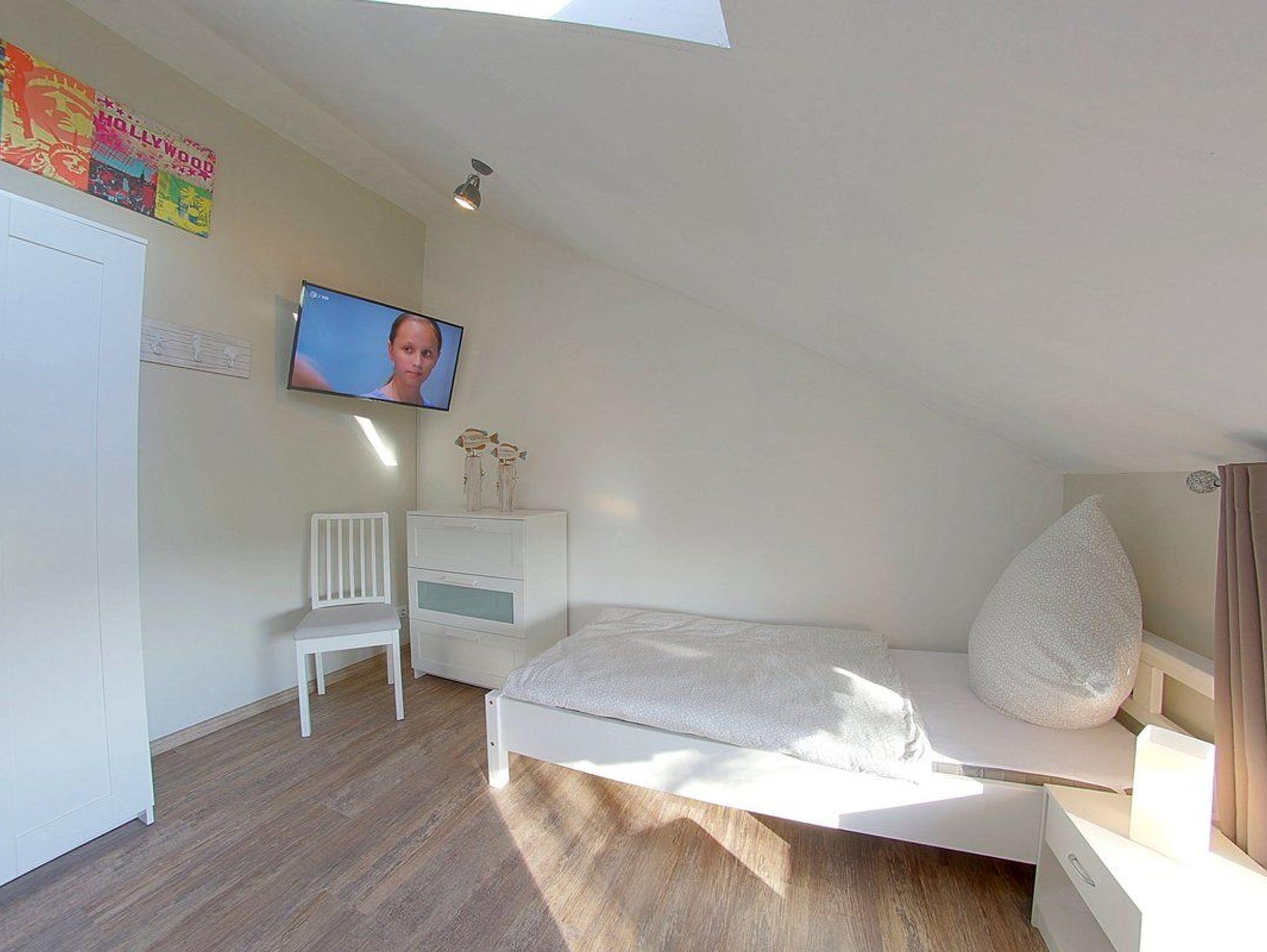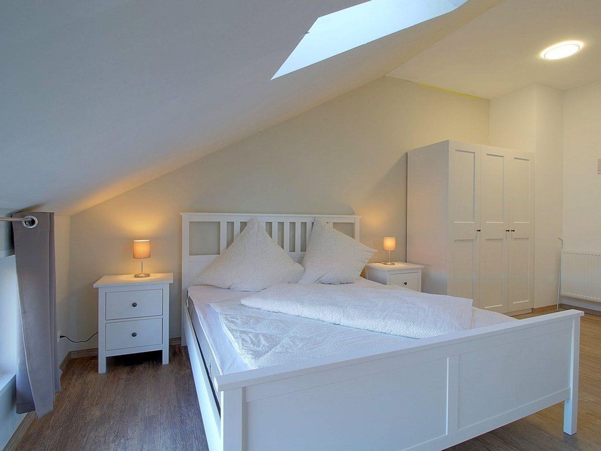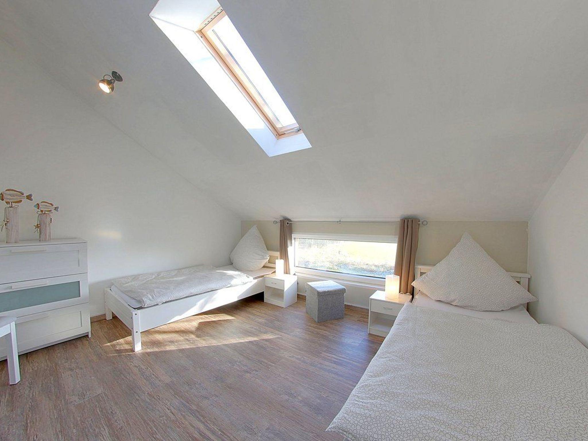 Im Obergeschoss befinden sich zwei Schlafzimmer, eins mit Doppelbett (1,80 x 2,00 m) und TV, sowie ein Schlafzimmer mit zwei Einzelbetten ( 0,90 x 2,00 m) und ebenfalls TV.