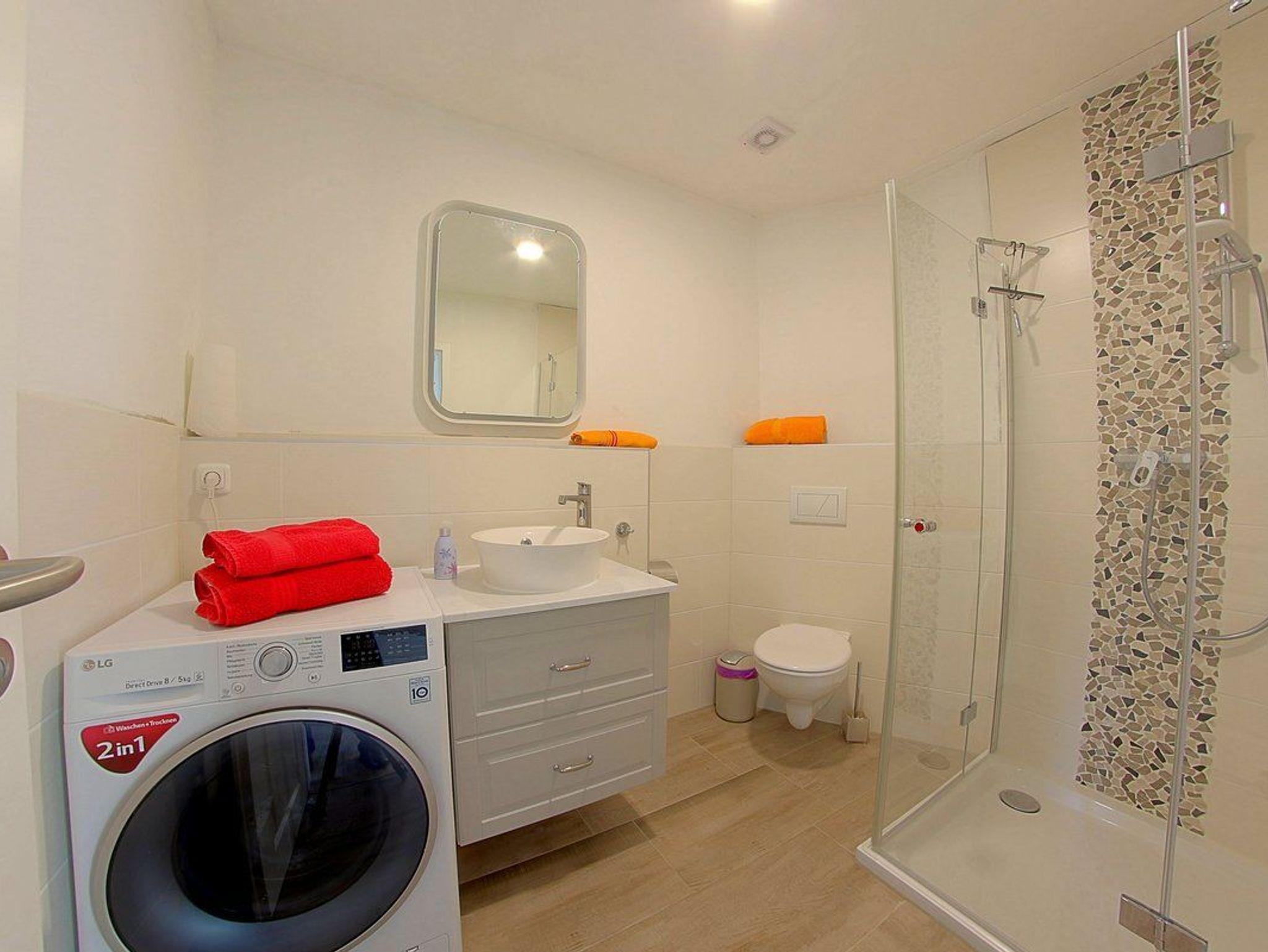 Ein helles, modernes Duschbad mit Waschtrocker steht Ihnen ebenfalls im Erdgeschoss zur Verfügung und im Obergeschoß ein separates WC.