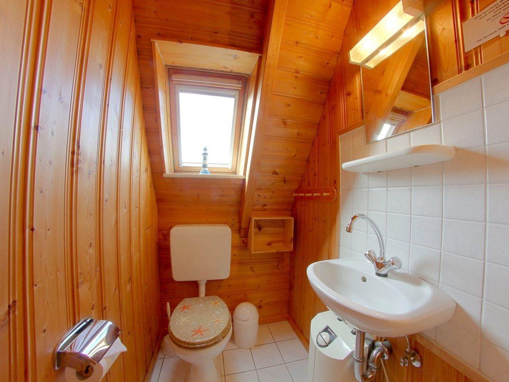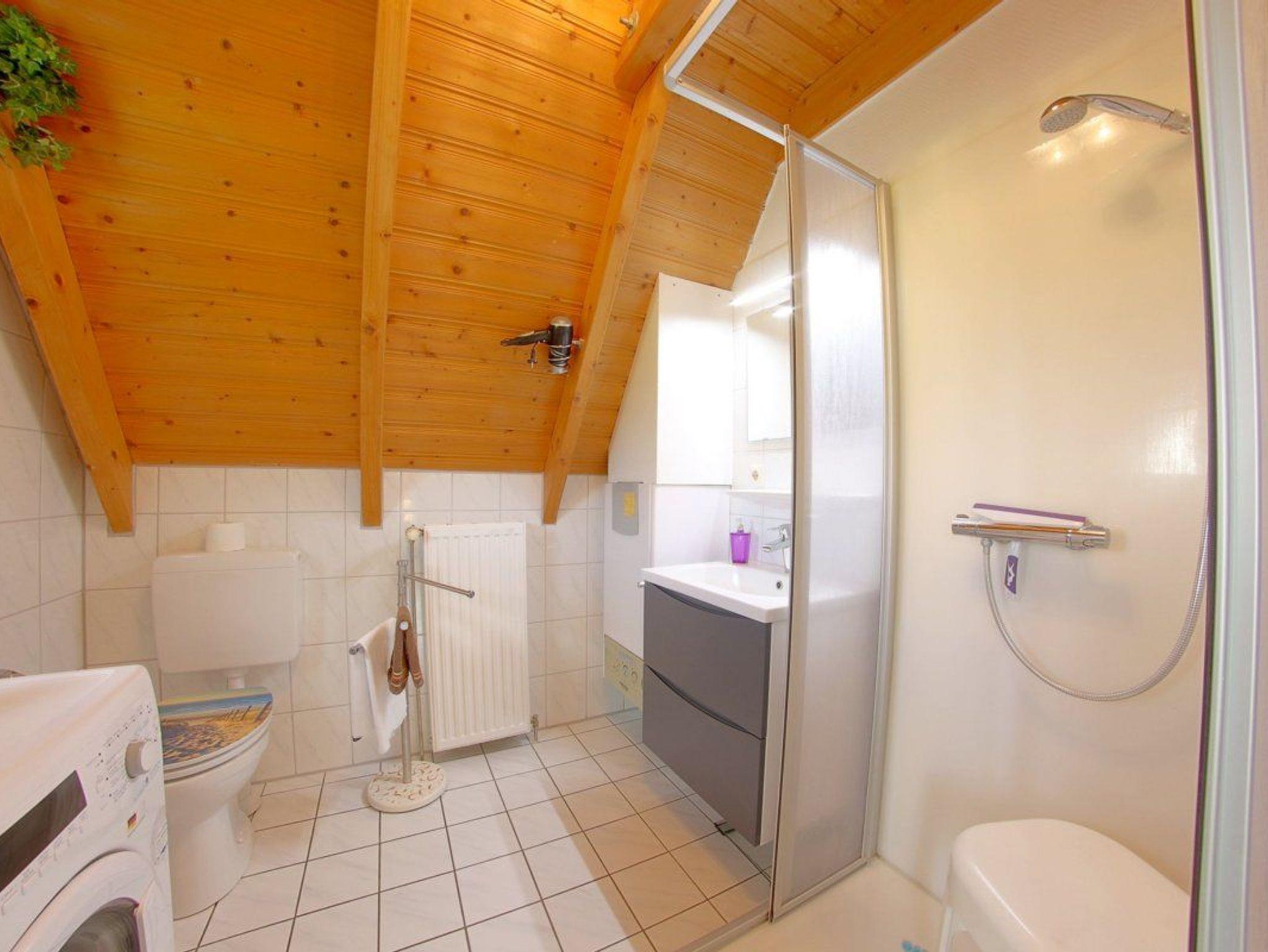Im Erdgeschoss befinden sich das Bad mit Dusche u. Hocker, ein Schlafzimmer mit 2 Einzelbetten (nicht verschiebbar), und der offen gestaltete Wohn- u. Essbereich mit Küche.