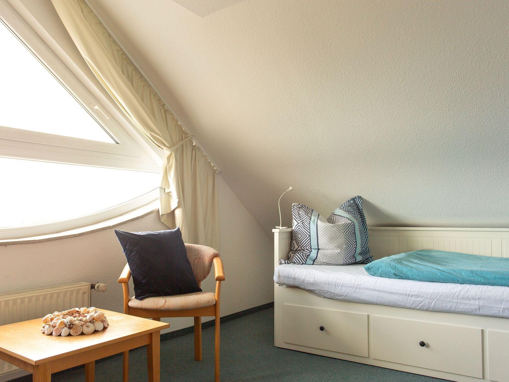 Im Obergeschoss befindet sich ein Bett, welches zu einem Doppelbett umgebaut werden kann.