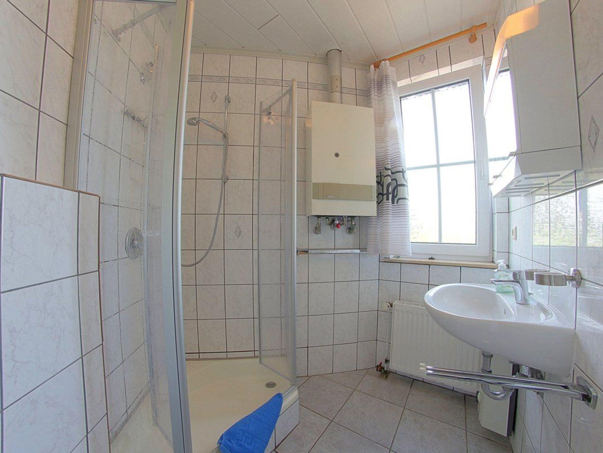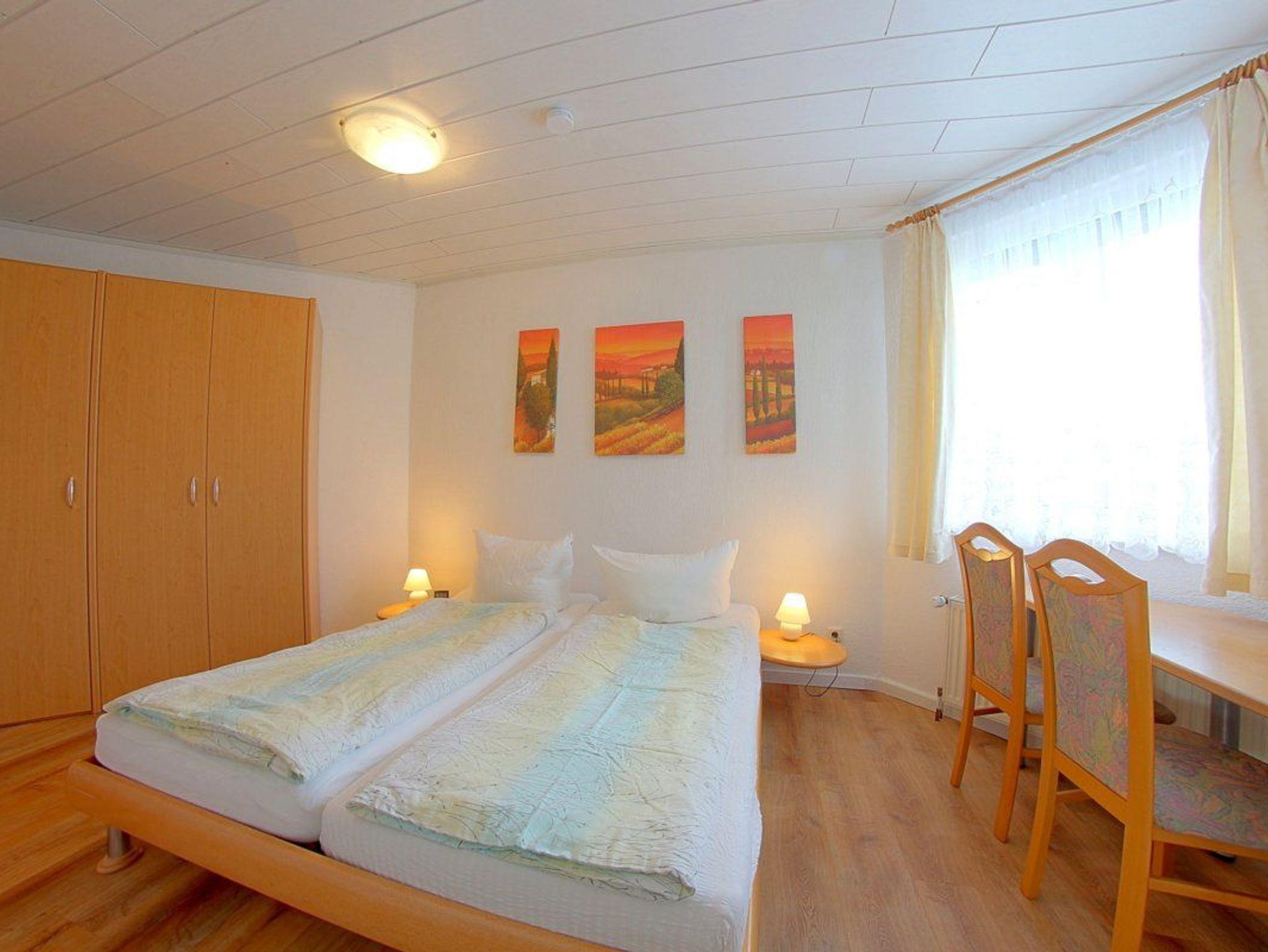 Ein Schlafzimmer mit Doppelbett und geräumigem Kleiderschrank, sowie ein Duschbad mit WC ebenfalls im Erdgeschoss.