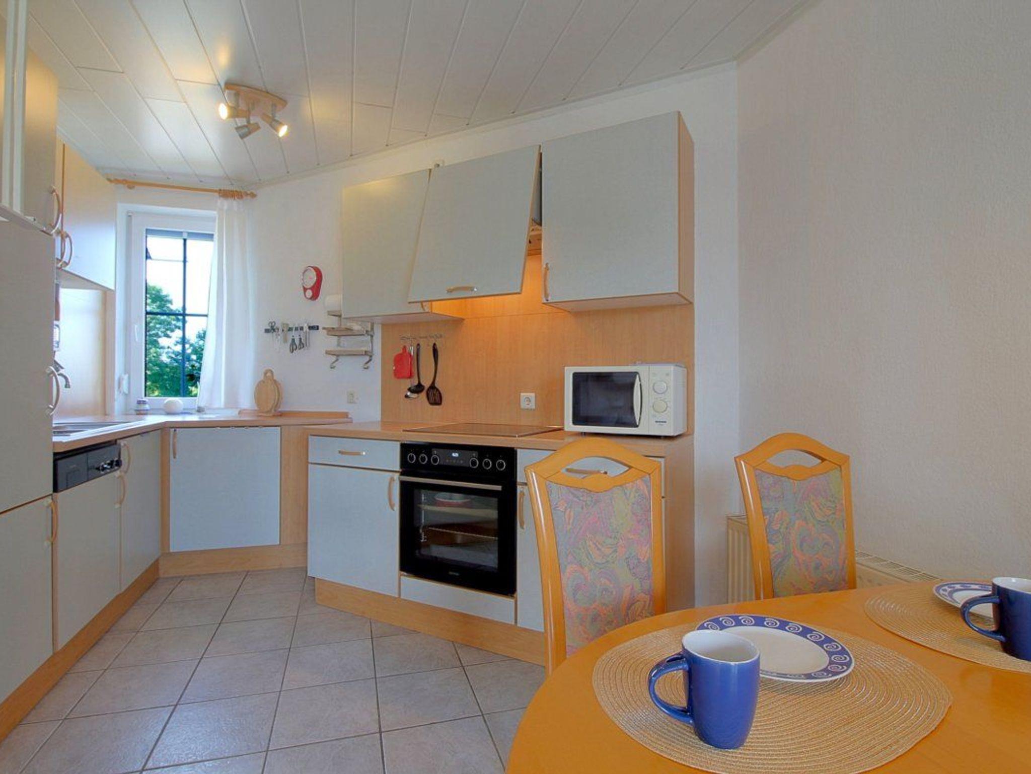 Die offene Küche mit E-Herd mit Backofen, Kühlschrank mit Gefrierfach, Kaffeemaschine, Toaster, Mikrowelle, Geschirrspüler, Waschmaschine und komplettem Geschirr lädt zum kochen ein.