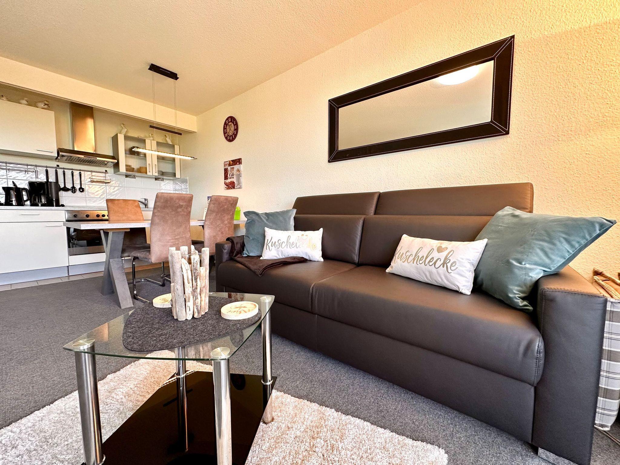 Die modern eingerichtete Ferienwohnung lädt zum Wohlfühlen ein. Geschmackvoll eingerichtet ist der Wohn-/Essbereich mit komplett ausgestatteter Küchenzeile. Im Wohnzimmer befindet sich eine bequeme Schlafcouch, auf der eine erwachsene Person oder 2 Kinder Platz finden, ein Esstisch und 4 Stühle, Sideboard und Fernseher.[nbsp] Im Schlafzimmer befindet sich ein Doppelbett sowie ein Kleiderschrank und ein Fernseher, auf dem man über WLAN Filme schauen kann. . Das moderne Badezimmer hat eine Dusche, WC und Waschbecken. Auf dem Balkon stehen zwei Stühle und ein Tisch.