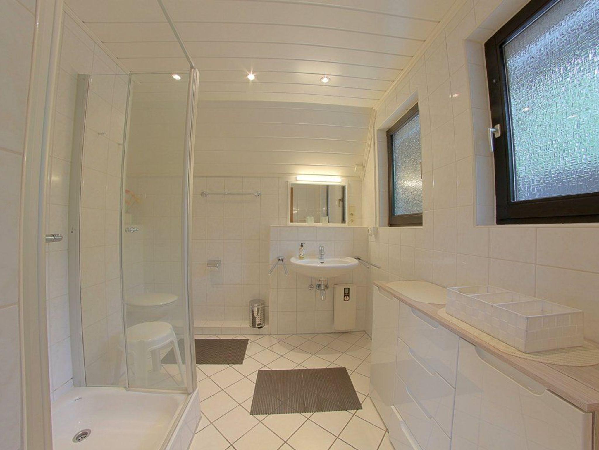 Das helle Duschbad mit Fenster und Rollo befindet sich ebenfalls im Erdgeschoss.