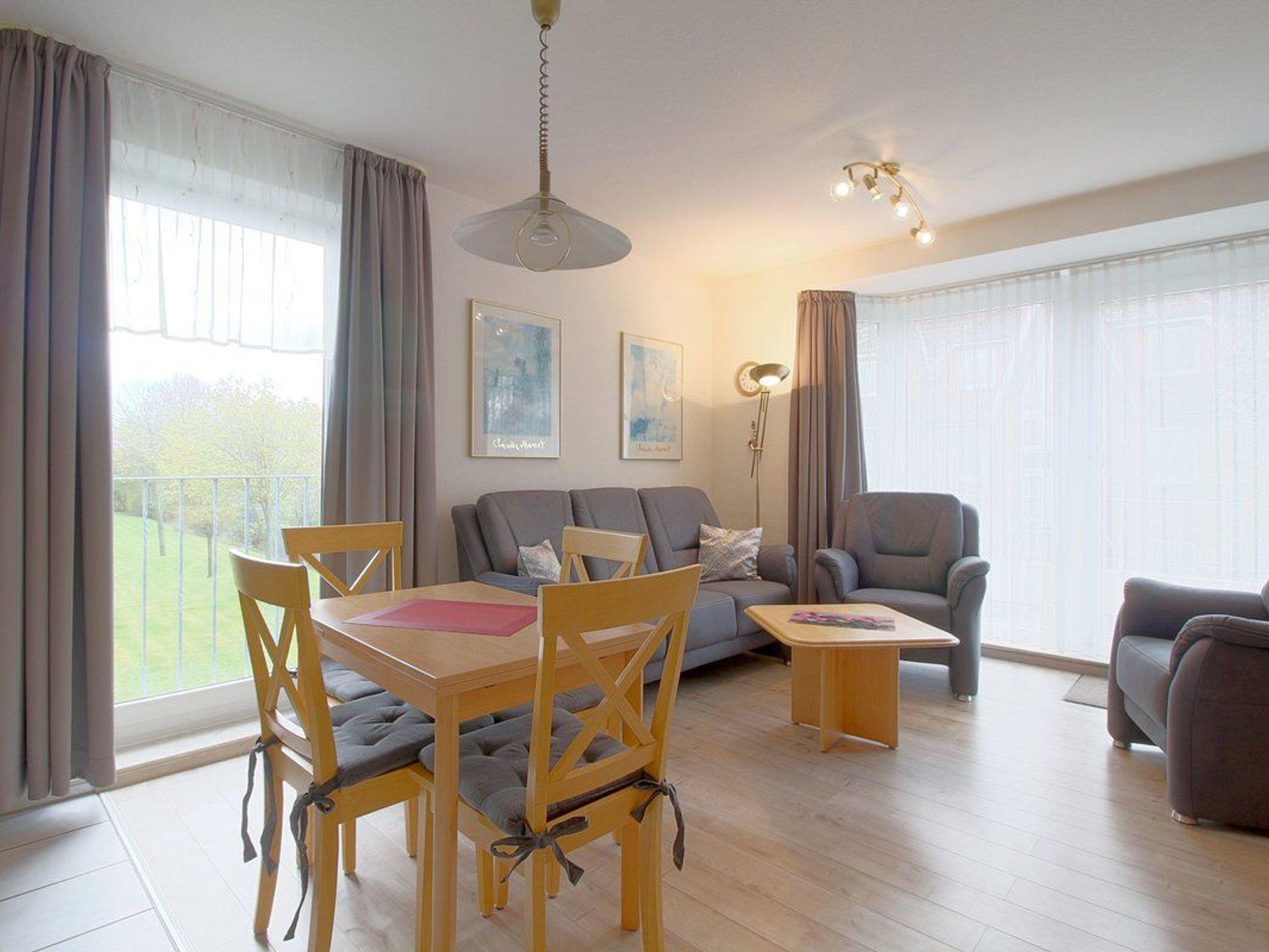 Die Küche ist gut eingerichtet, alles was der Hobbykoch braucht steht bereit. Von der Kaffeemaschine bis zum Toaster ist alles vorhanden. Das Wohnzimmer ist modern und bequem eingerichtet. Auch hier fehlt nichts! Fernseher und Radioanlage vorhanden. Die Ferienwohnung hat einen Süd-West-Balkon mit Tisch und Gartenmöbeln, sowie Sonnenschirm. Kostenloses W-Lan