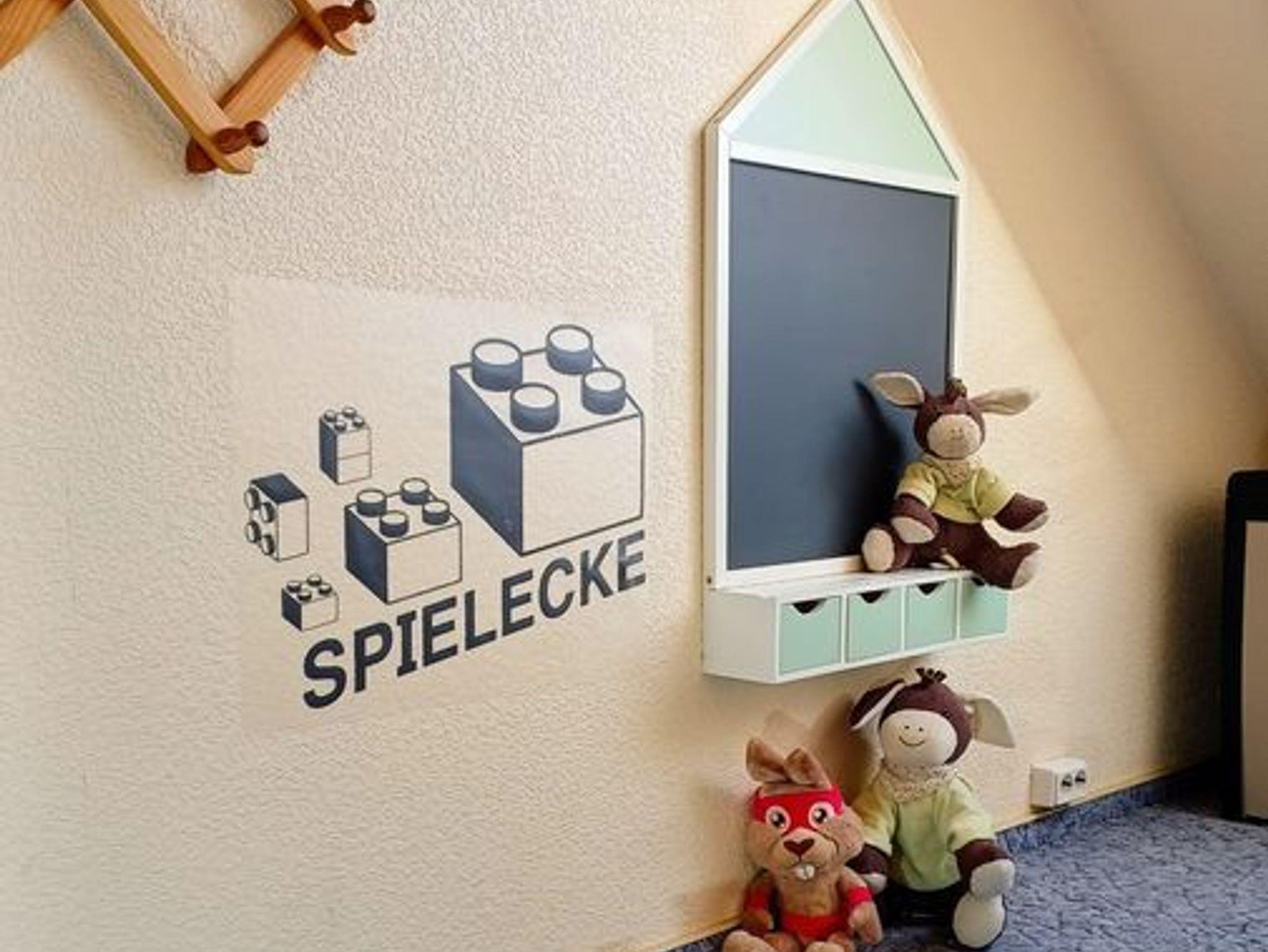 Ein Kinderreisebett und ein Kinderhochstuhl stehen bereit.