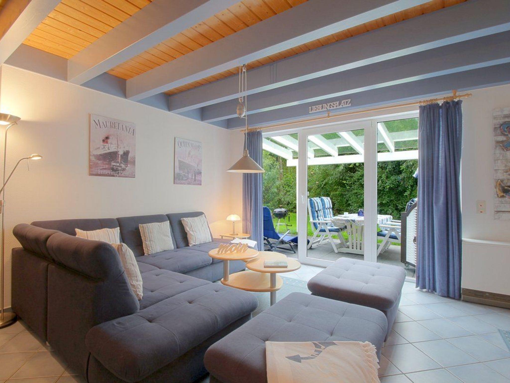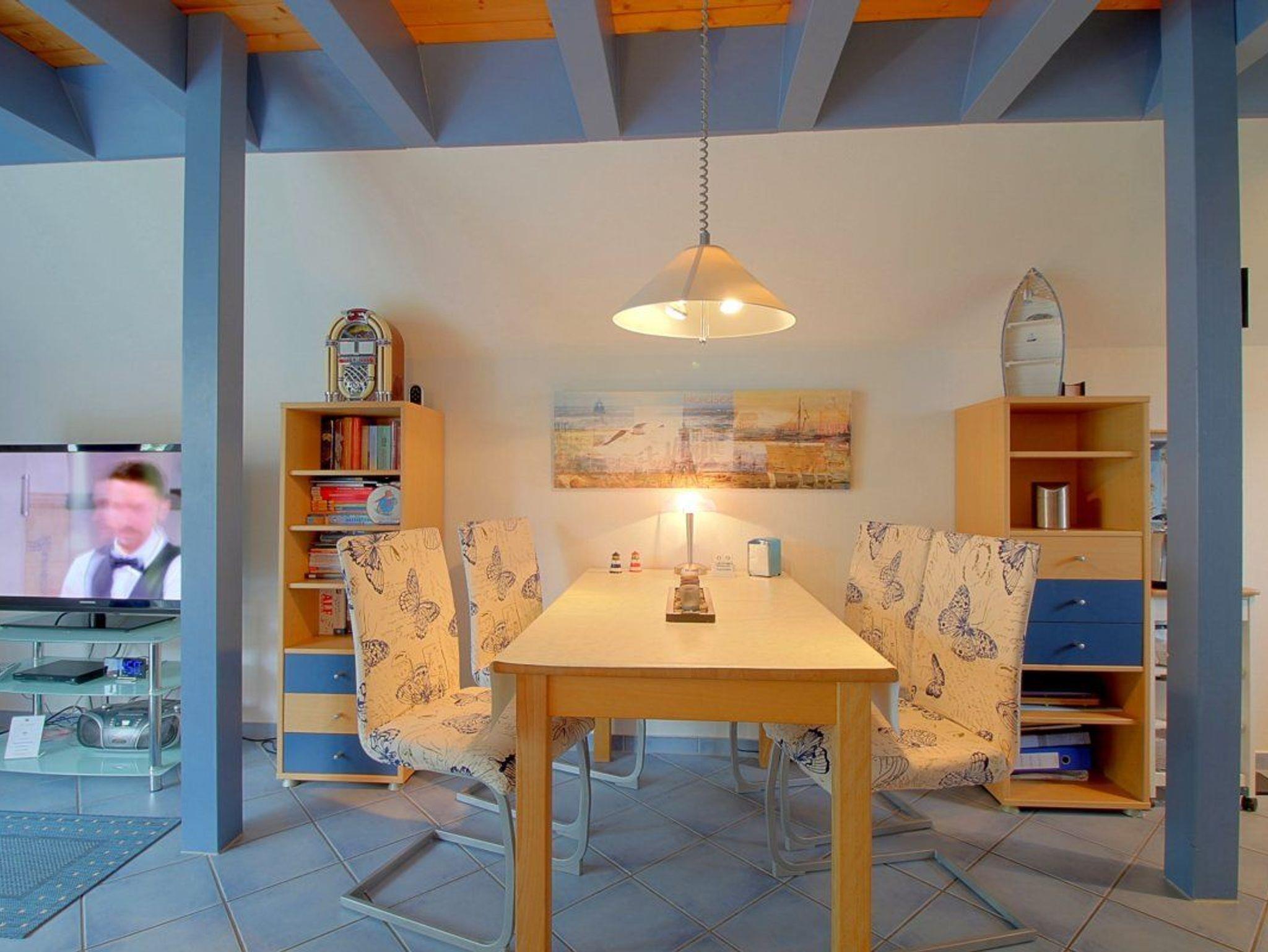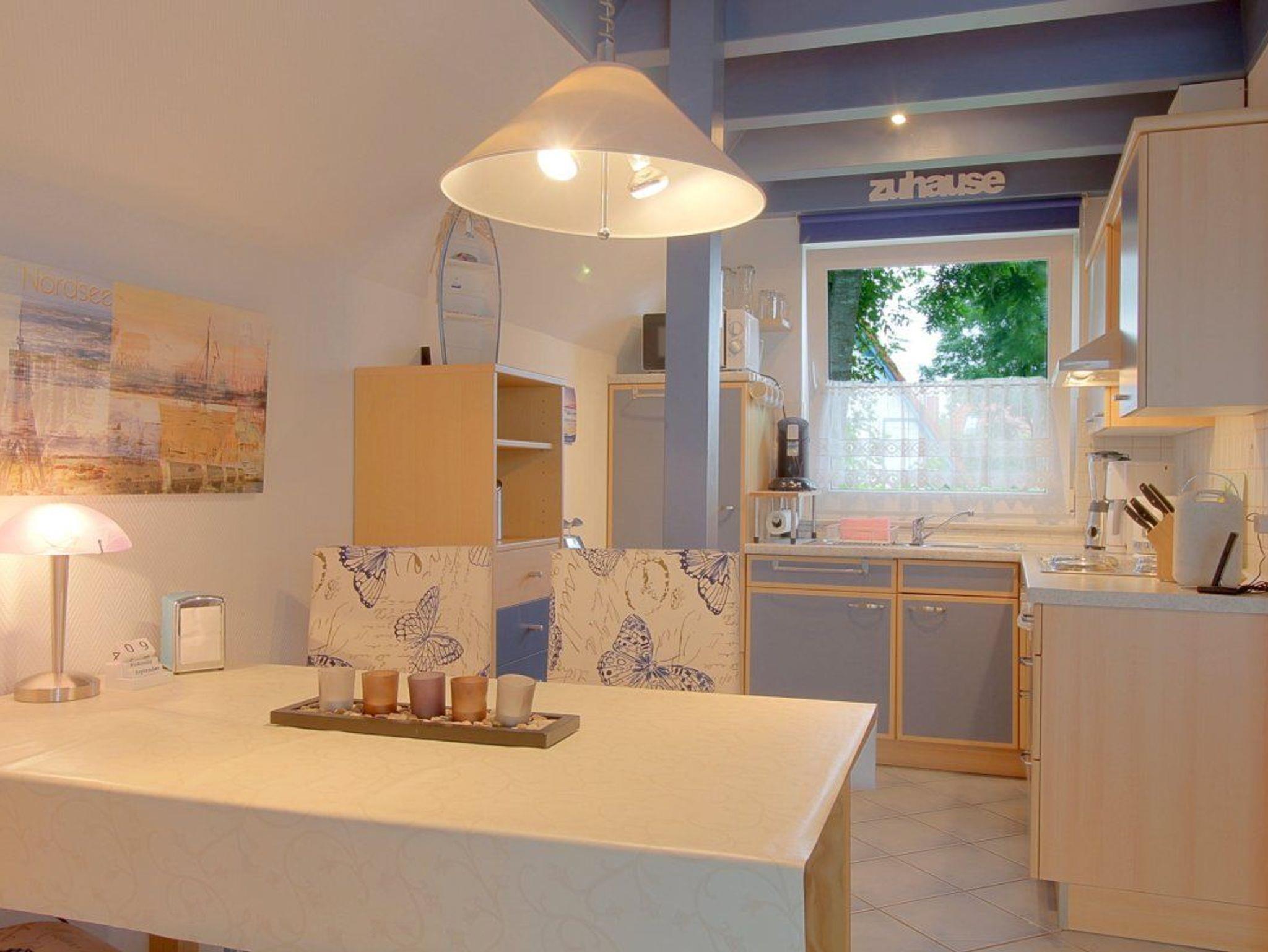 Friesisch eingerichtetes Haus für den Nordseeurlaub. Im Erdgeschoss gibt es einen offenen Wohnbereich mit Flat-TV, Essplatz und Küche mit komplett ausgestatteter Einbauküche mit Geschirrspüler. Vom Wohnraum aus geht es direkt auf die überdachte, sonnige Terrasse.