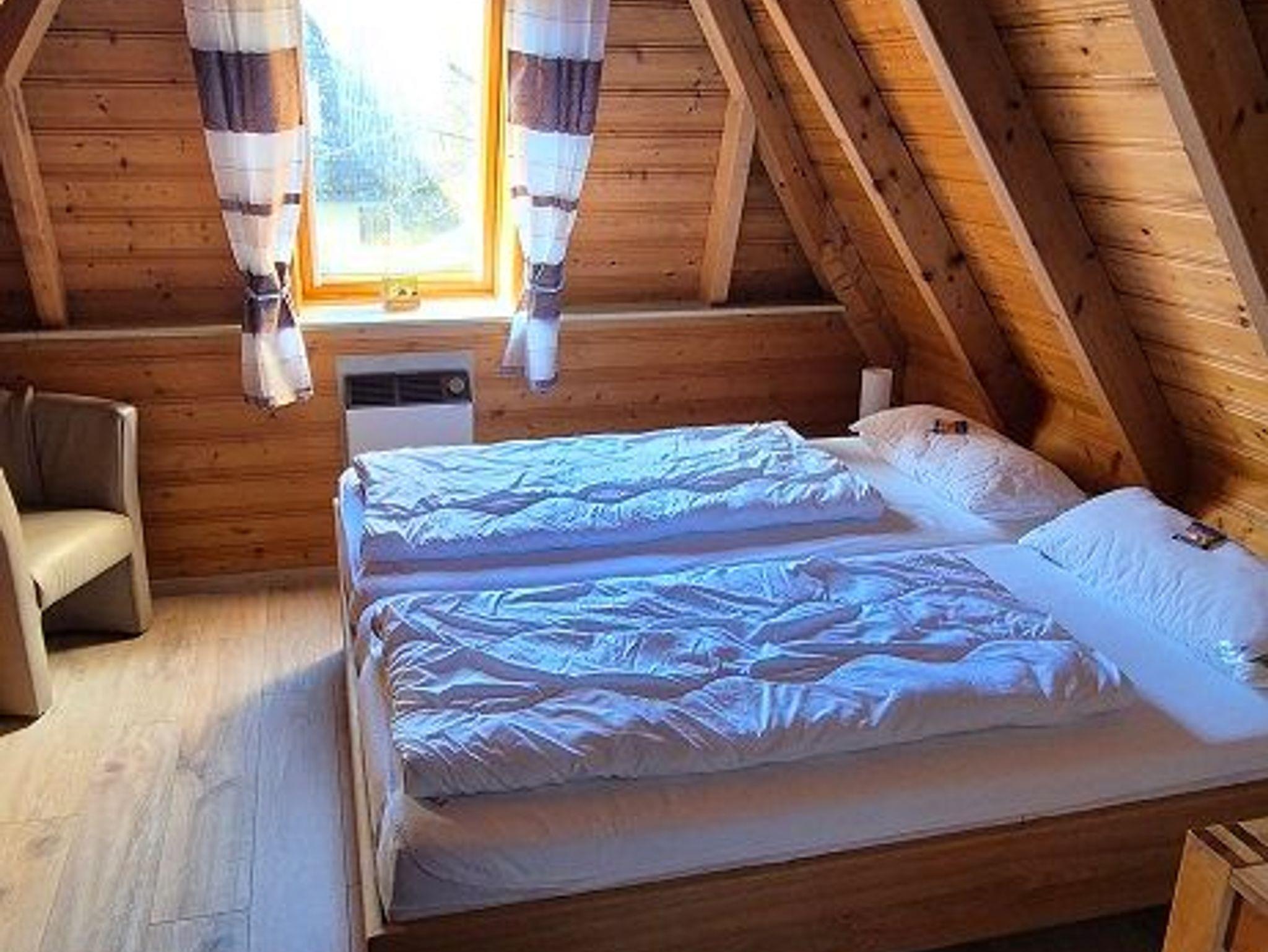 Im Obergeschoss befindet sich ein Schlafzimmer mit Doppelbett, feststehendem Kinderbett, Herrendiener, Spiegel und TV Gerät.