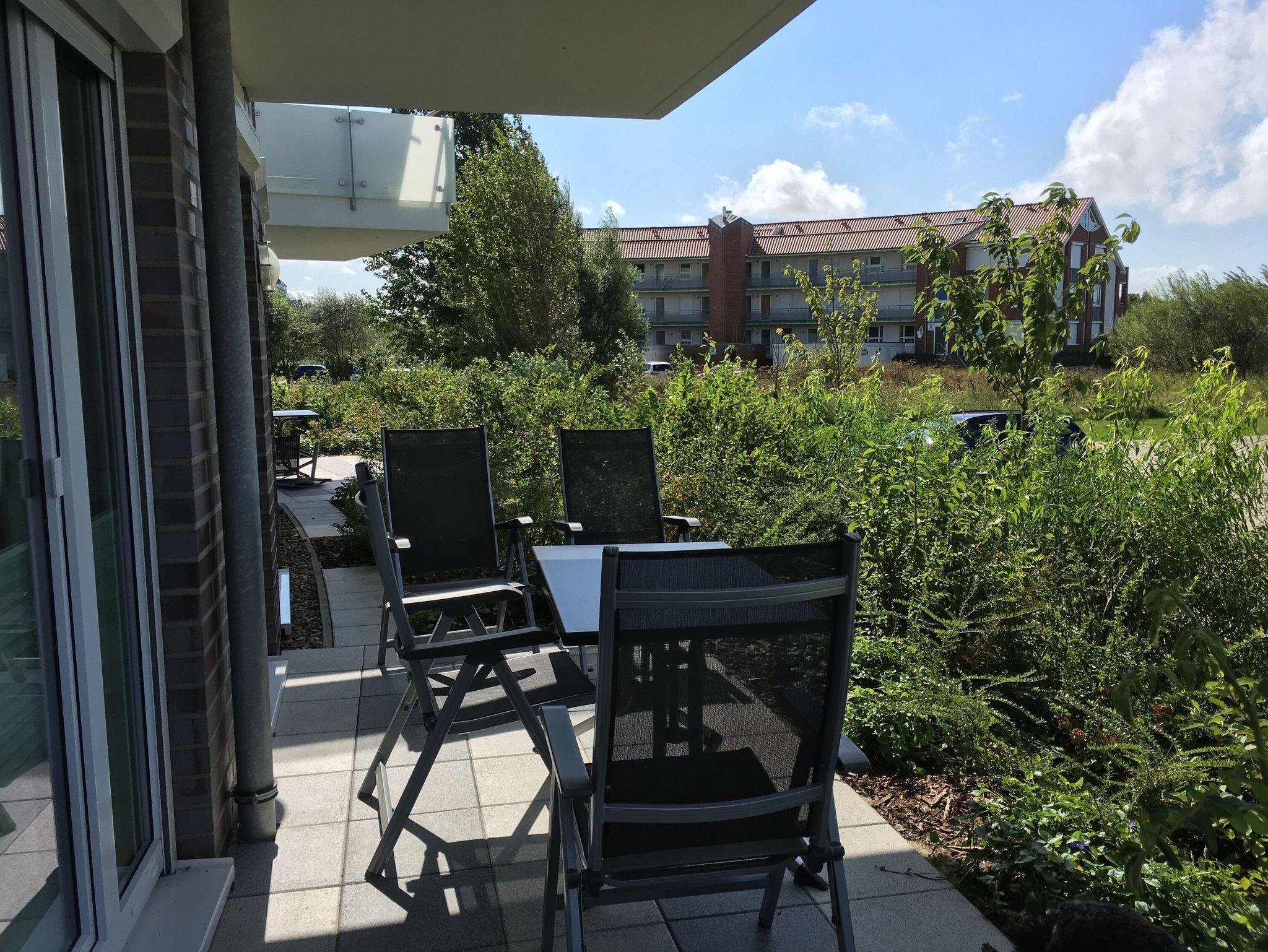 Genießen Sie die frische Luft auf der Terrasse mit Blick zum Parkplatz.