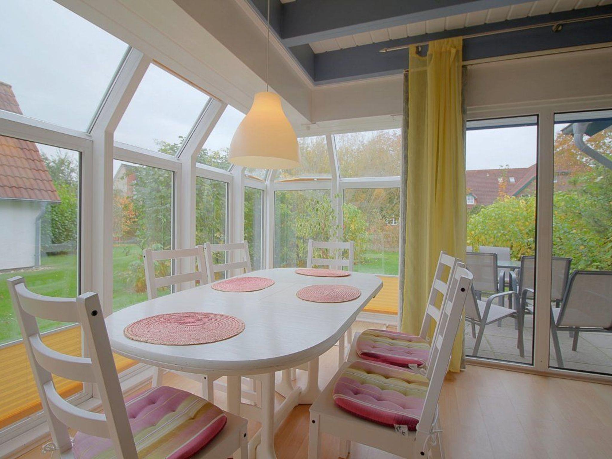 Im offenen Wintergarten sind der Essplatz mit Kinderhochstuhl und ein Ruhesessel untergebracht. Hier können Sonne und Regen genossen werden.