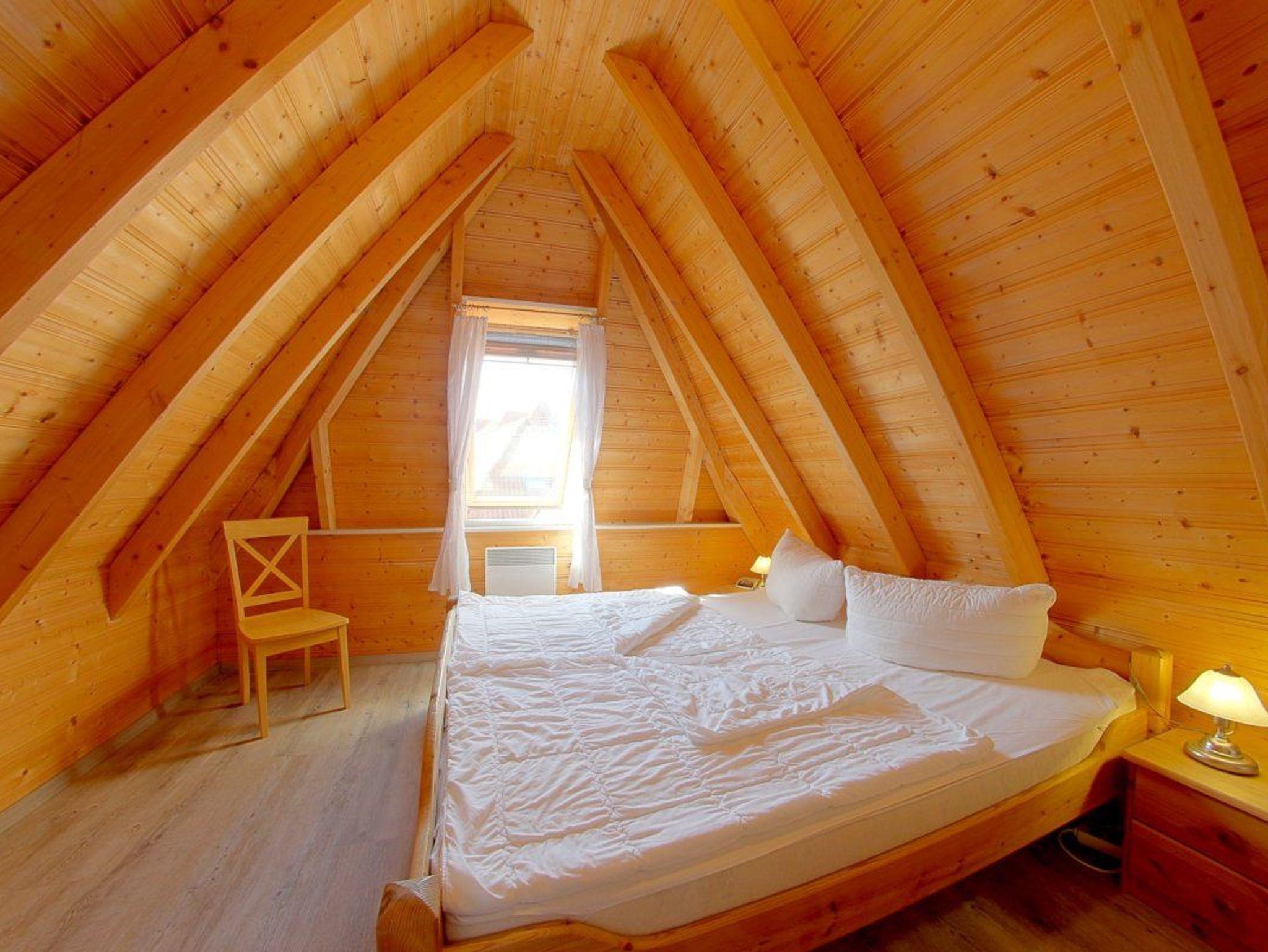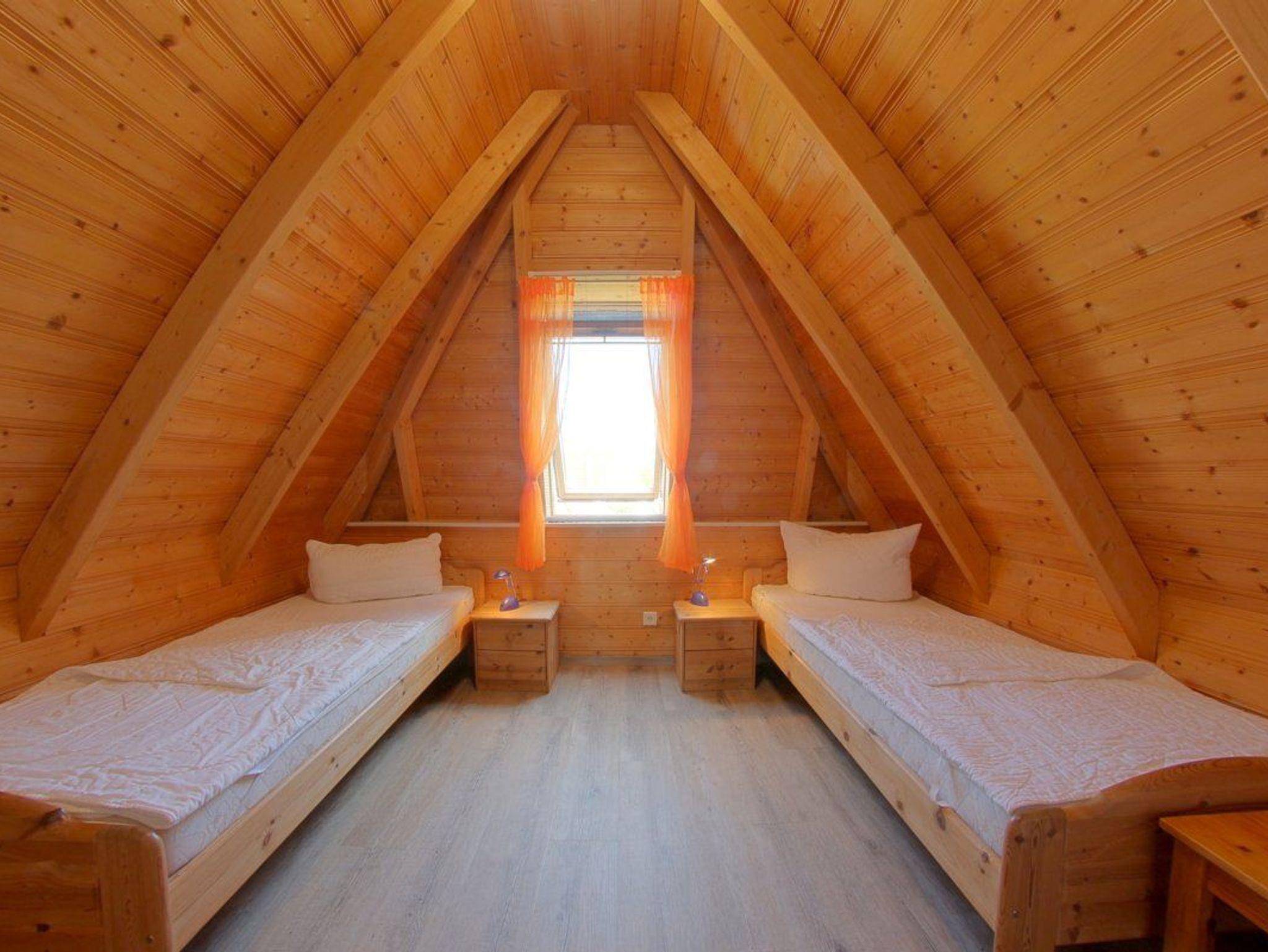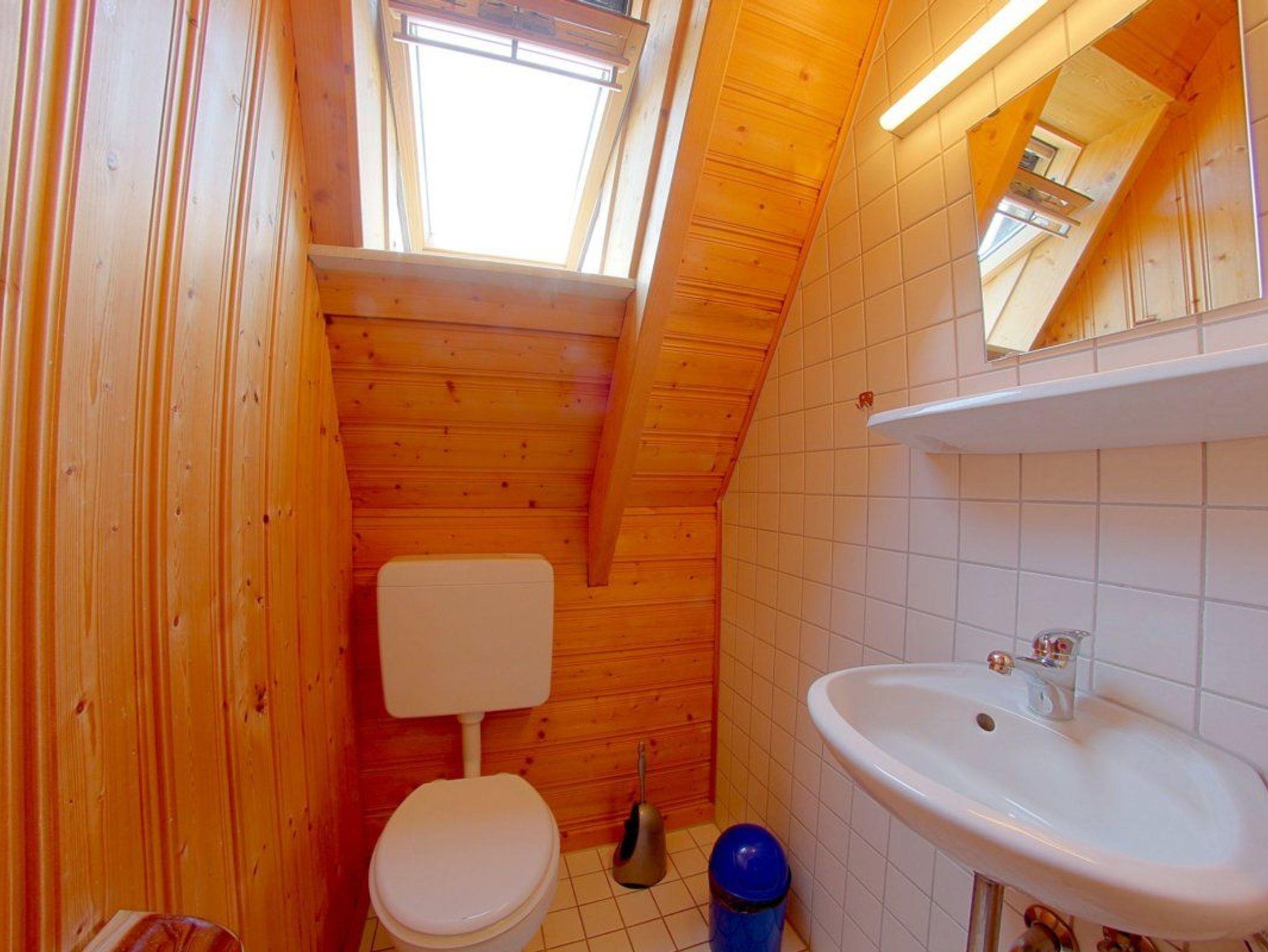 Im Obergeschoss befinden sich zwei weitere Schlafzimmer mit wischbaren Böden und ein WC mit Waschbecken. Ein Schlafzimmer mit Doppelbett und ein weiteres Schlafzimmer mit 2 Einzelbetten.
