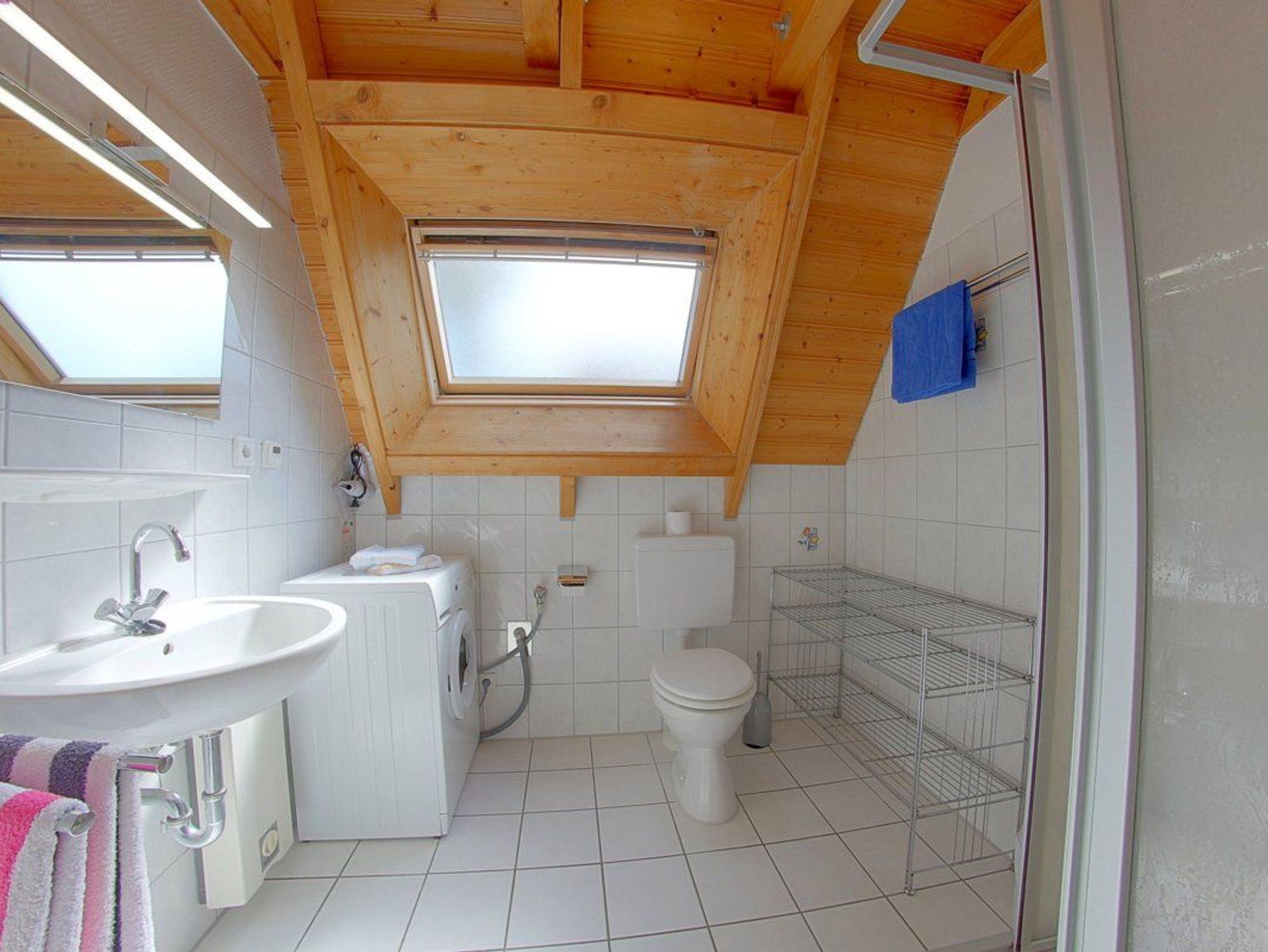 Im Erdgeschoß gibt es ein Schlafzimmer mit zwei Einzelbetten und ein helles Duschbad mit Fußbodenheizung und Waschmaschine.