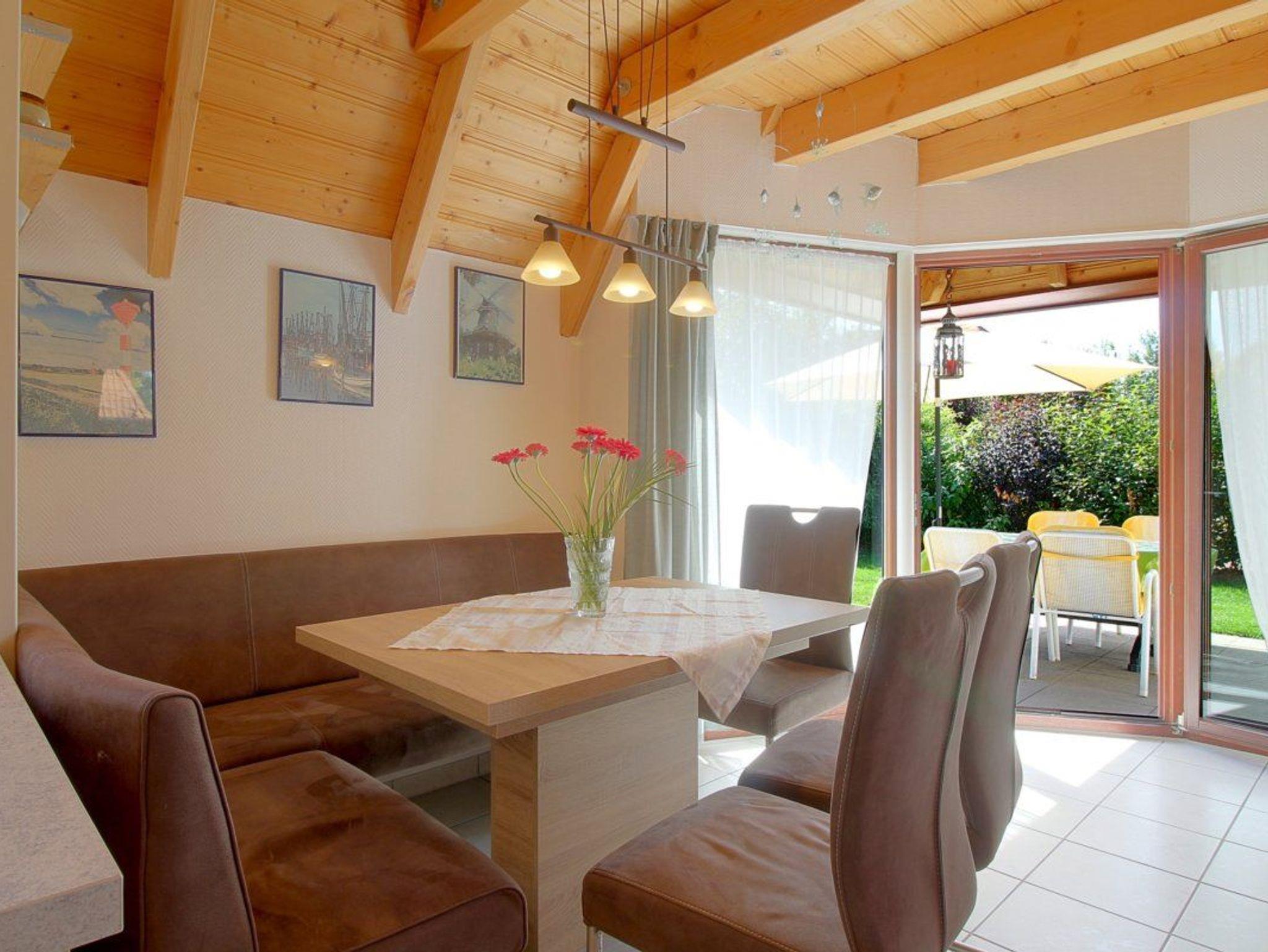 Im gefliesten Wohnbereich gibt es einen offenen Wohnbereich mit Kamin und großem großen Flat-TV, Essplatz und Küche mit komplett ausgestatteter moderner Einbauküche. Von hier aus geht es auf die Terrasse mit Abstellraum.