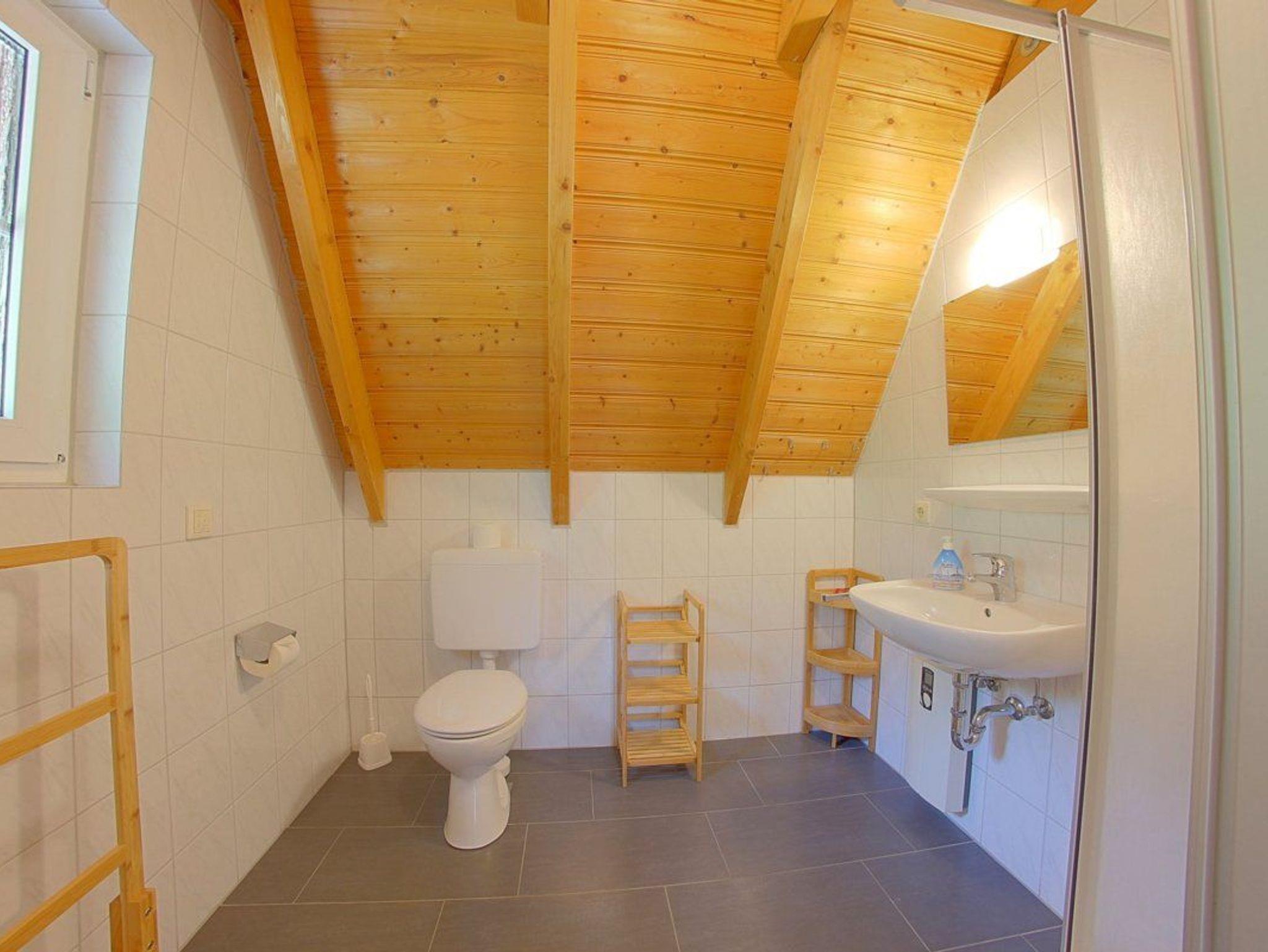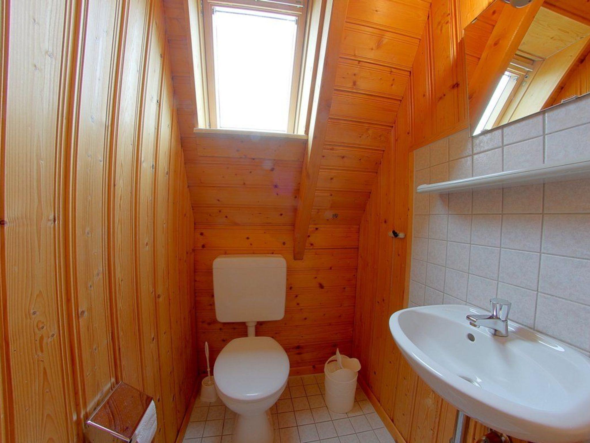 Im oberen Bereich befinden sich das Elternschlafzimmer mit Doppelbett, sowie ein weiteres Schlafzimmer mit Einzelbetten. Schlafzimmer mit Laminatböden. Ein Babyreisebett für die ganz kleinen Gäste und ein Hochstuhl stehen im Haus bereit. Ein WC befindet sich ebenfalls oben.