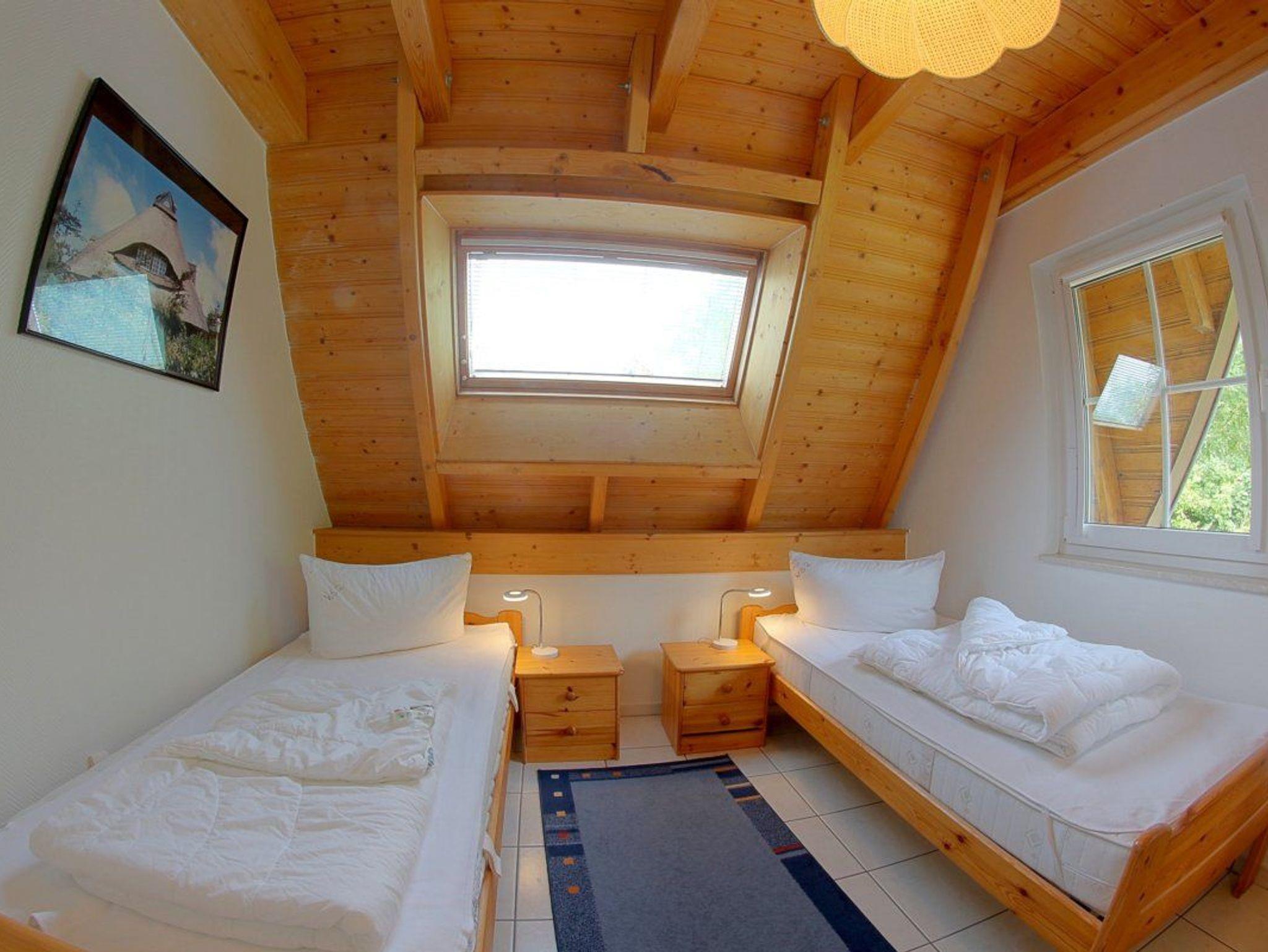 Ein Schlafzimmer mit 2 Einzelbetten und das helle Duschbad mit WC ist ebenfalls im Erdgeschoss.