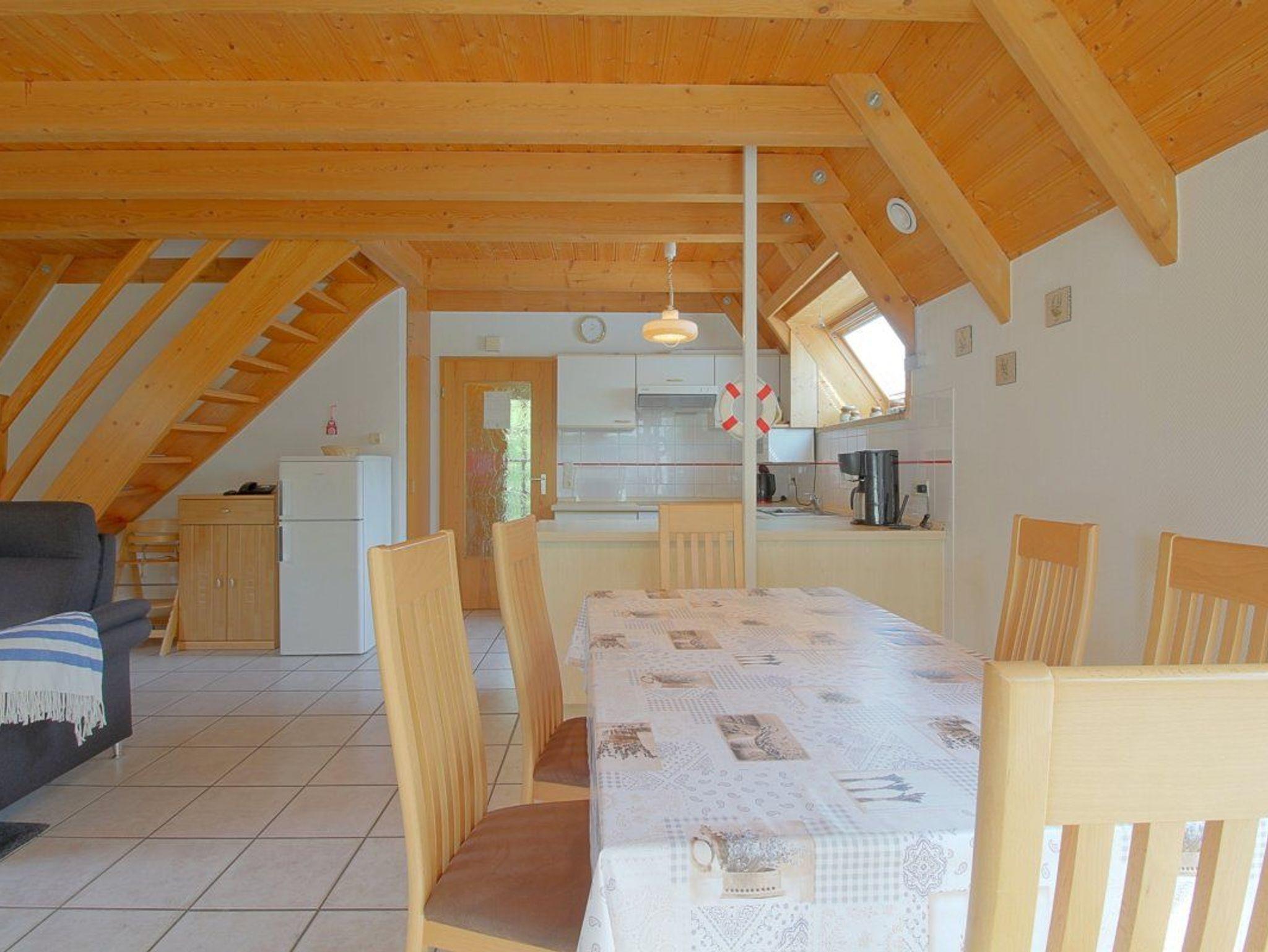 Im komplett gefliesten Erdgeschoss gibt es den offenen Wohn-, Küchen und Essbereich mit bequemen Sitzmöbeln, Flachbild TV und Küche mit Backofen, Mikrowelle, Geschirrspüler und Pött und Pann.