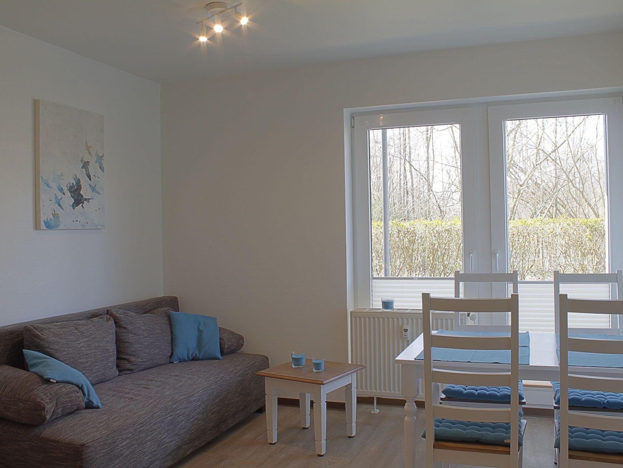 Komfortabel ausgestattete Ferienwohnung im Erdgeschoss mit 1 Schlafraum mit Doppelbett (1,60 x 2,00 m), 2. Schlafzimmer, 1 Einzelbett (0,90 x 2,00 m) mit Ausziehbett und 1 Babyreisebett. Küchenzeile und Wohnraum mit Ausgang zur gemütlichen Terrasse. Die Wohnung ist mit Vinylbelag ausgelegt und daher auch für Allergiker geeignet