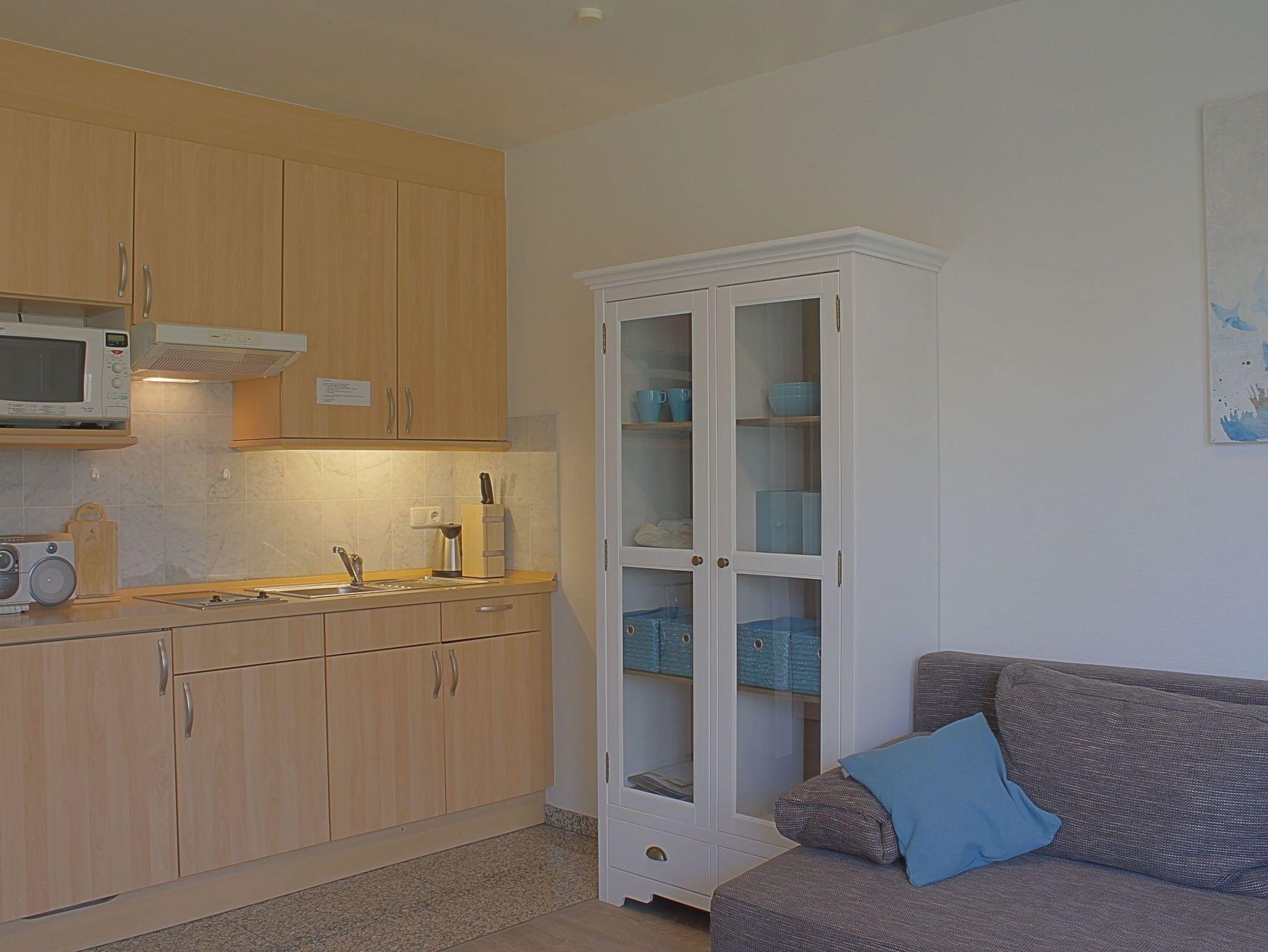 Die Küchenzeile ist mit allem eingerichtet, was man so braucht. Von der Kaffeemaschine bis zum Toaster ist alles vorhanden.