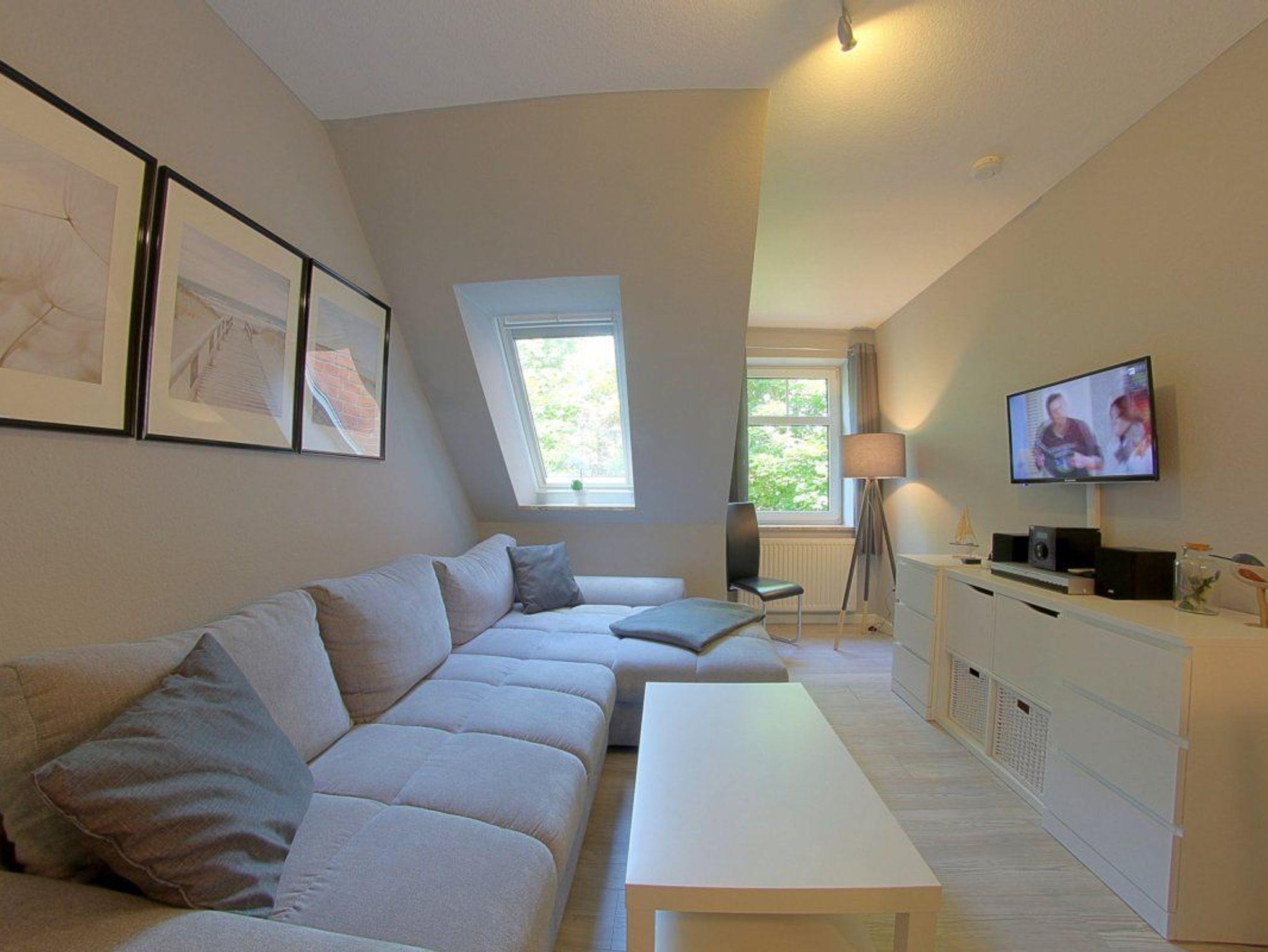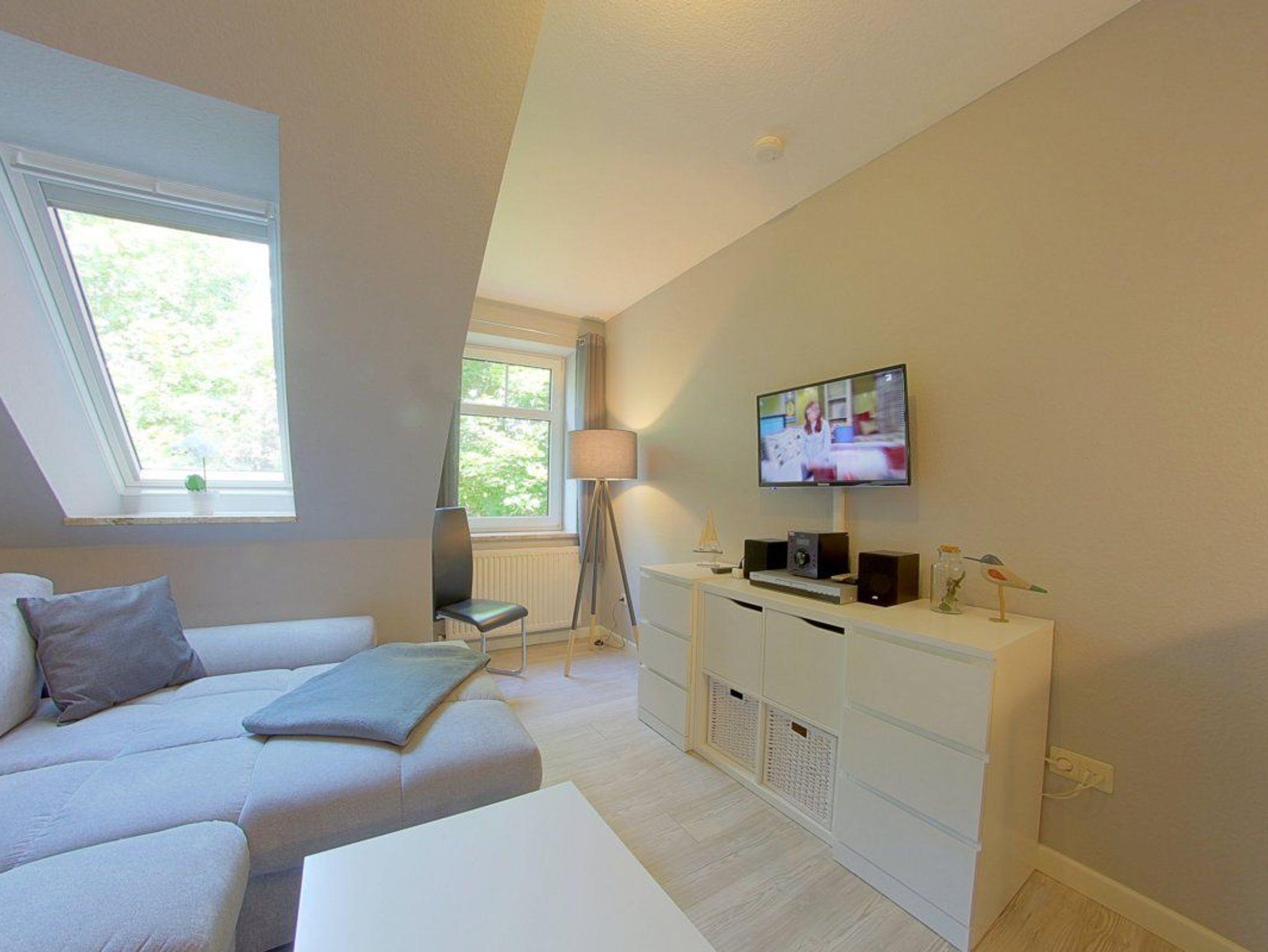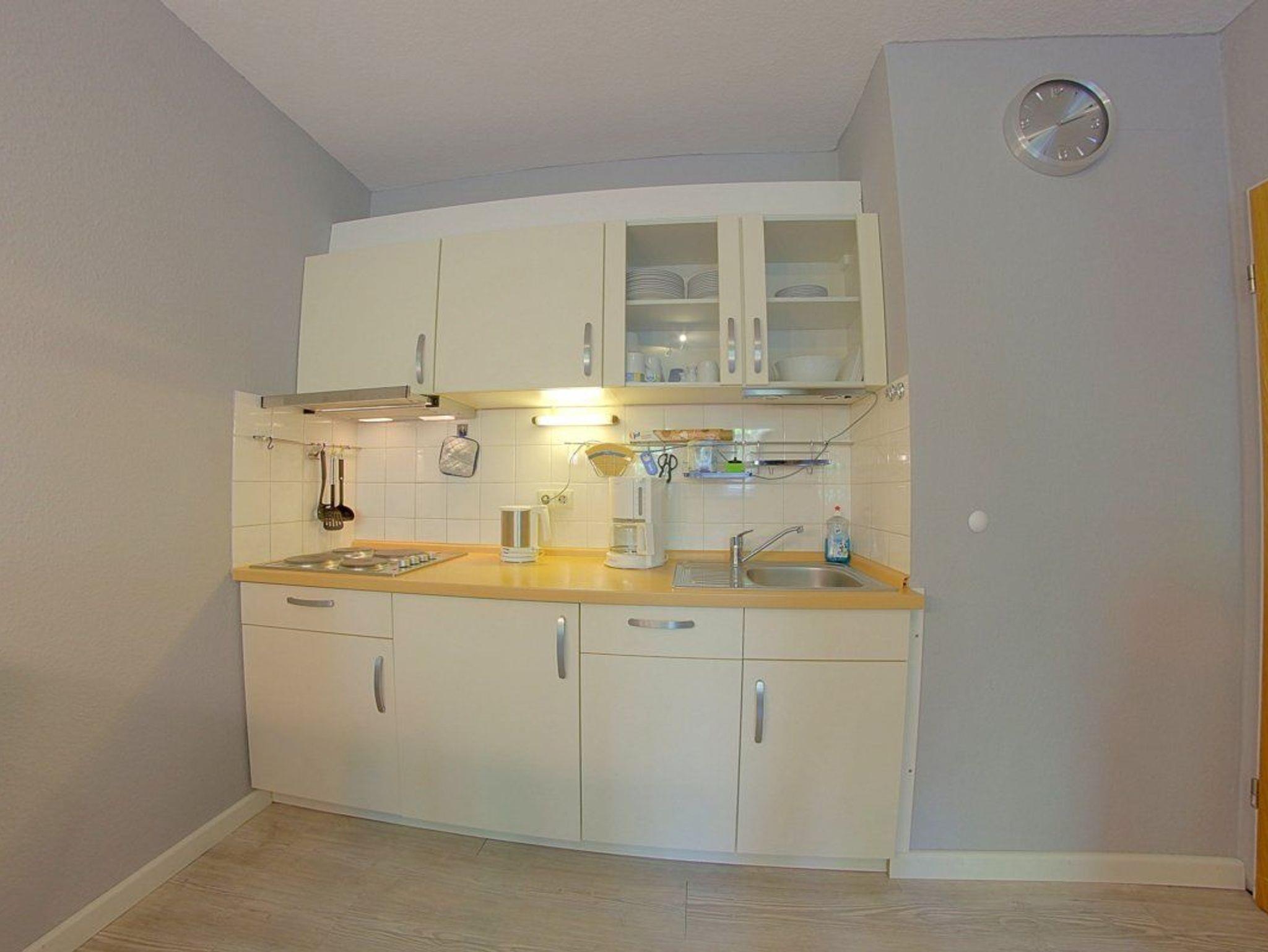 Die Wohnung verfügt über einen offenen Wohn-, Ess- und Küchenbereich mit großer Sitzlandschaft mit Schlaffunktion (140 x 200 ), TV und kostenloses WLAN. Die Küche ist komplett ausgestattet inklusive Geschirrspüler. Ein Kinderhochstuhl steht für die kleinen Gäste bereit
