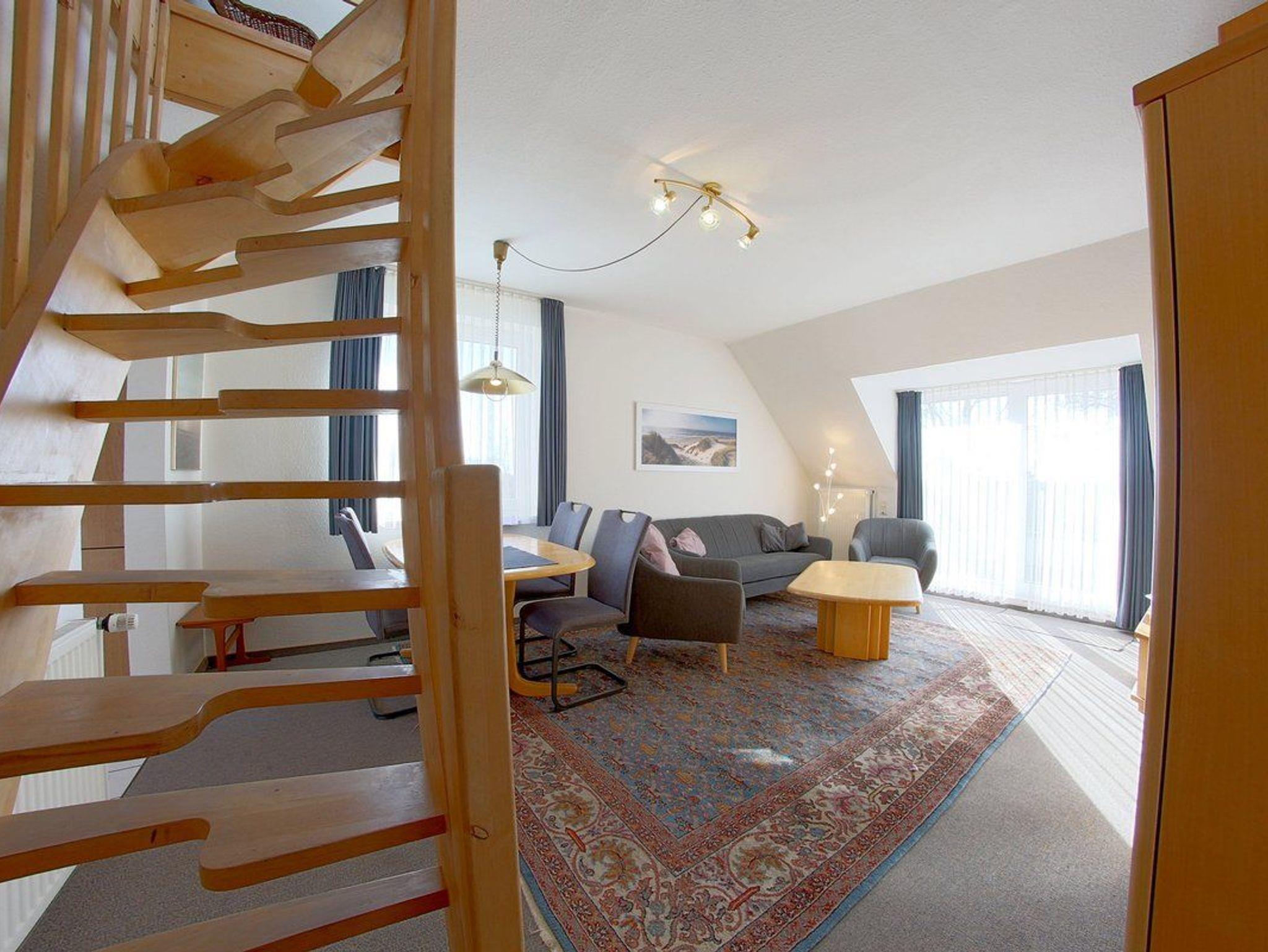 Ein heller Wohnraum mit Essplatz und Ausgang zum sonnigen Balkon, sowie eine Treppe zum 2. Schlafzimmer im Dachgeschoss für die Kinder sorgen für genügend Platz.