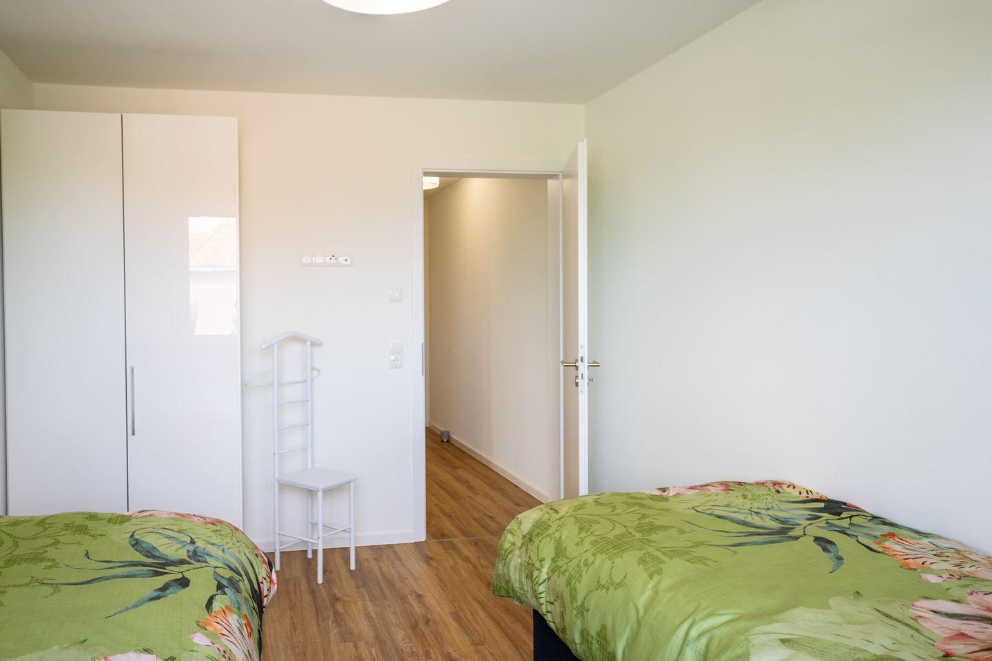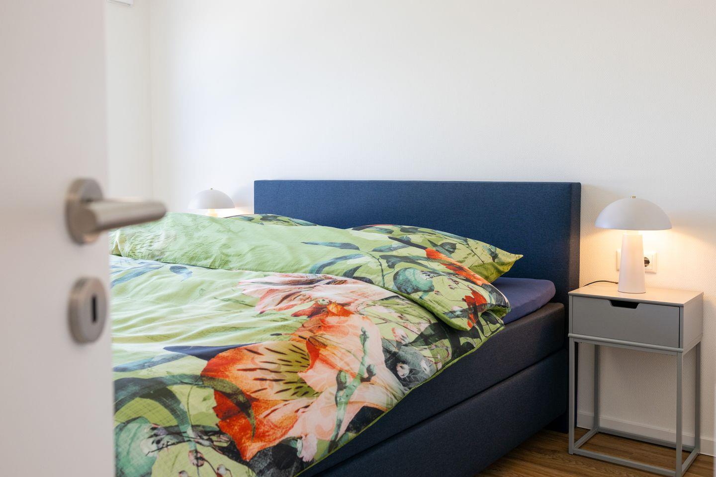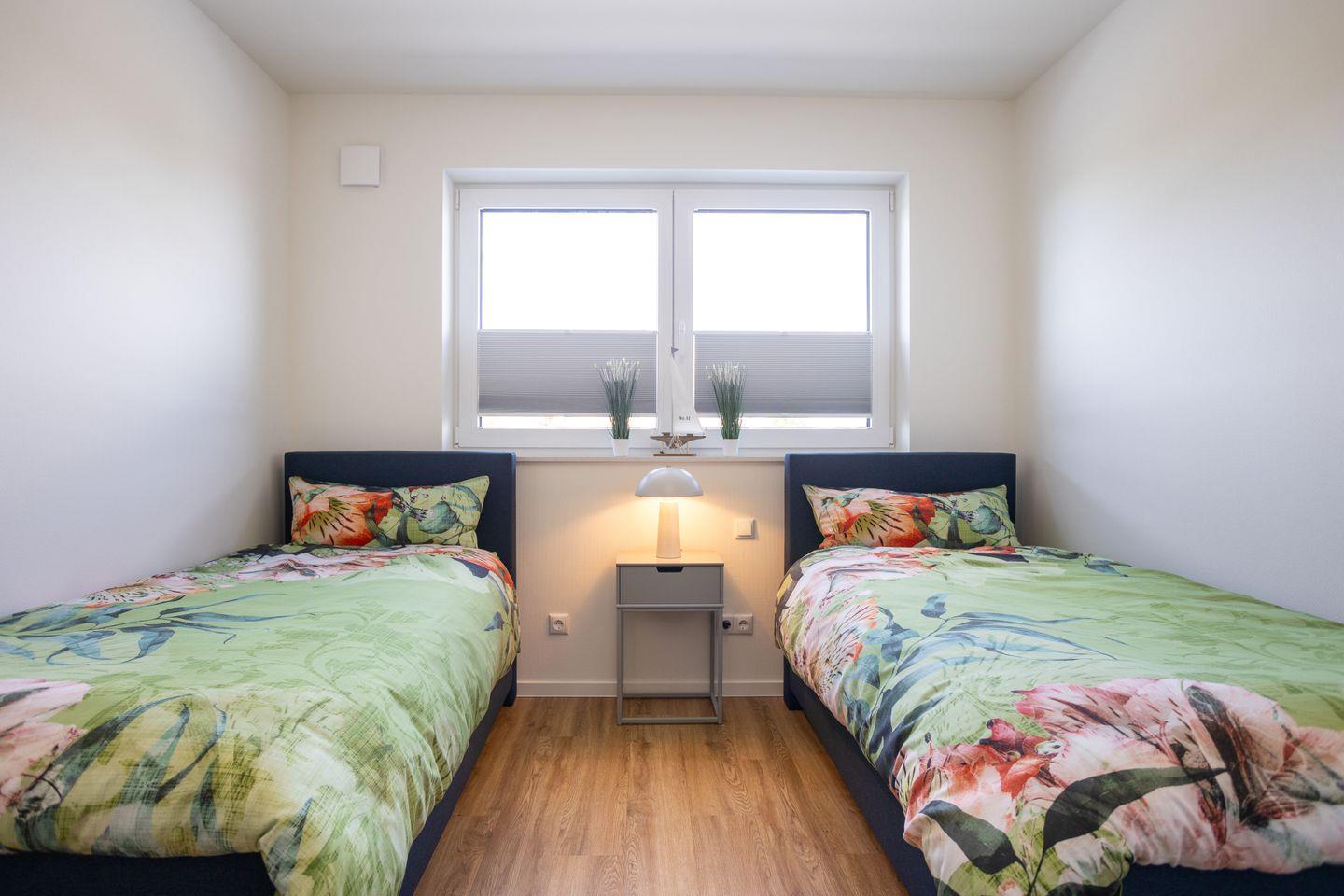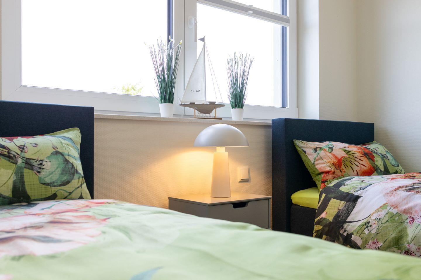Das Penthouse bietet zwei separate Schlafzimmer: Im ersten befindet sich ein gemütliches Doppelbett, im zweiten zwei Einzelbetten – ideal für Familien oder Freunde. Beide Schlafräume sind mit Kleiderschrank und Rollläden ausgestattet und sorgen für eine erholsame Nachtruhe.