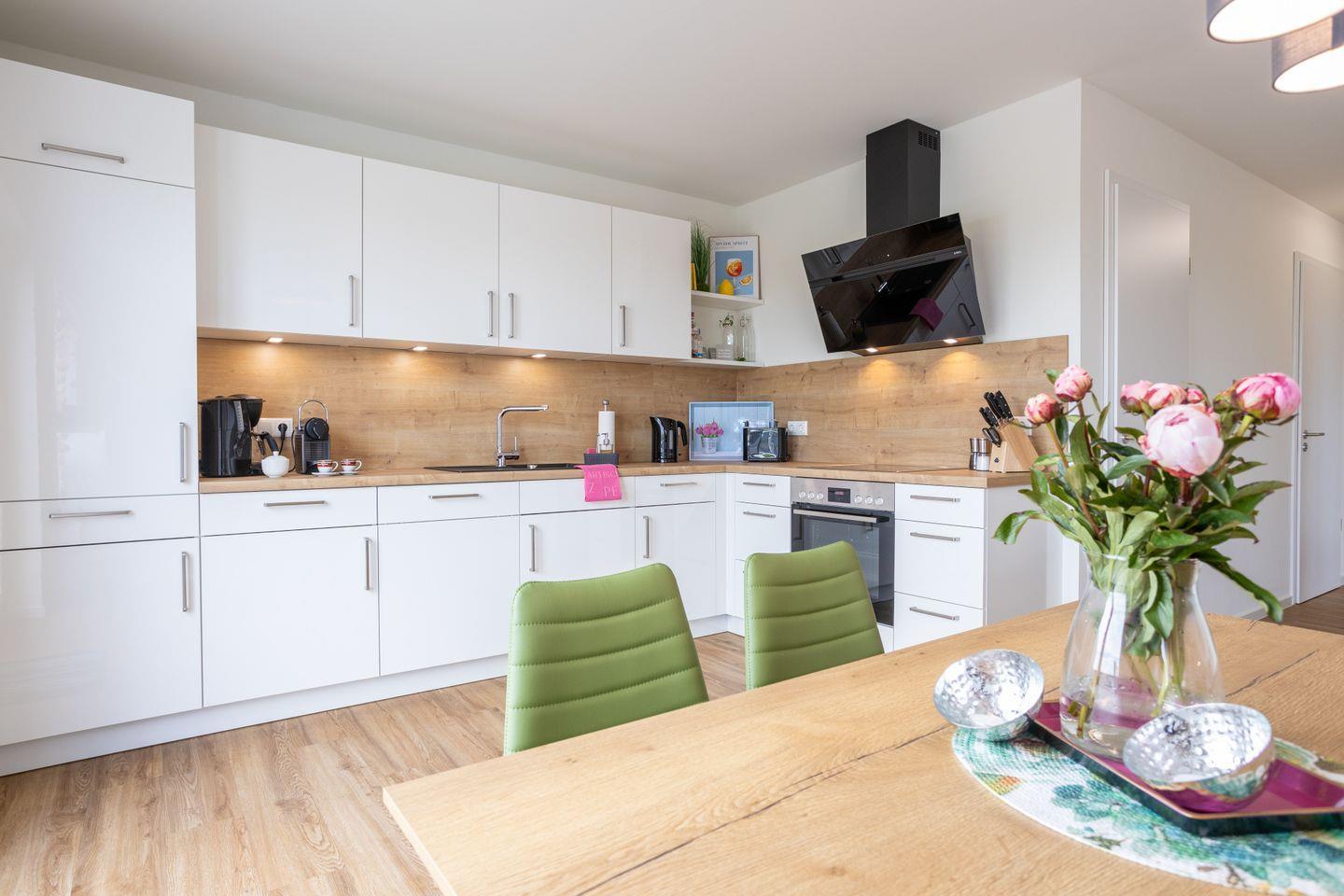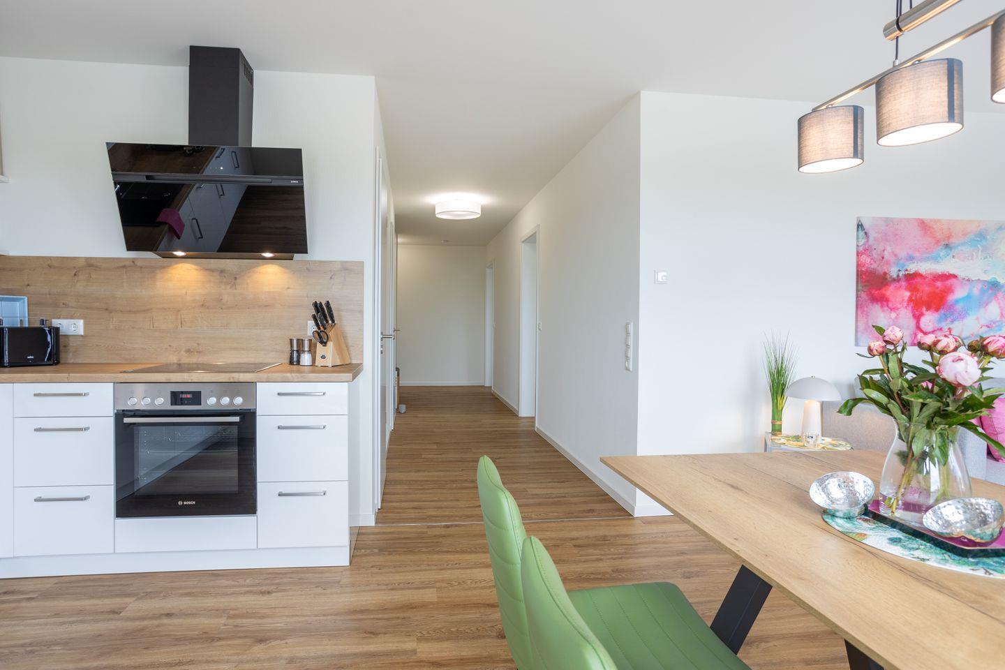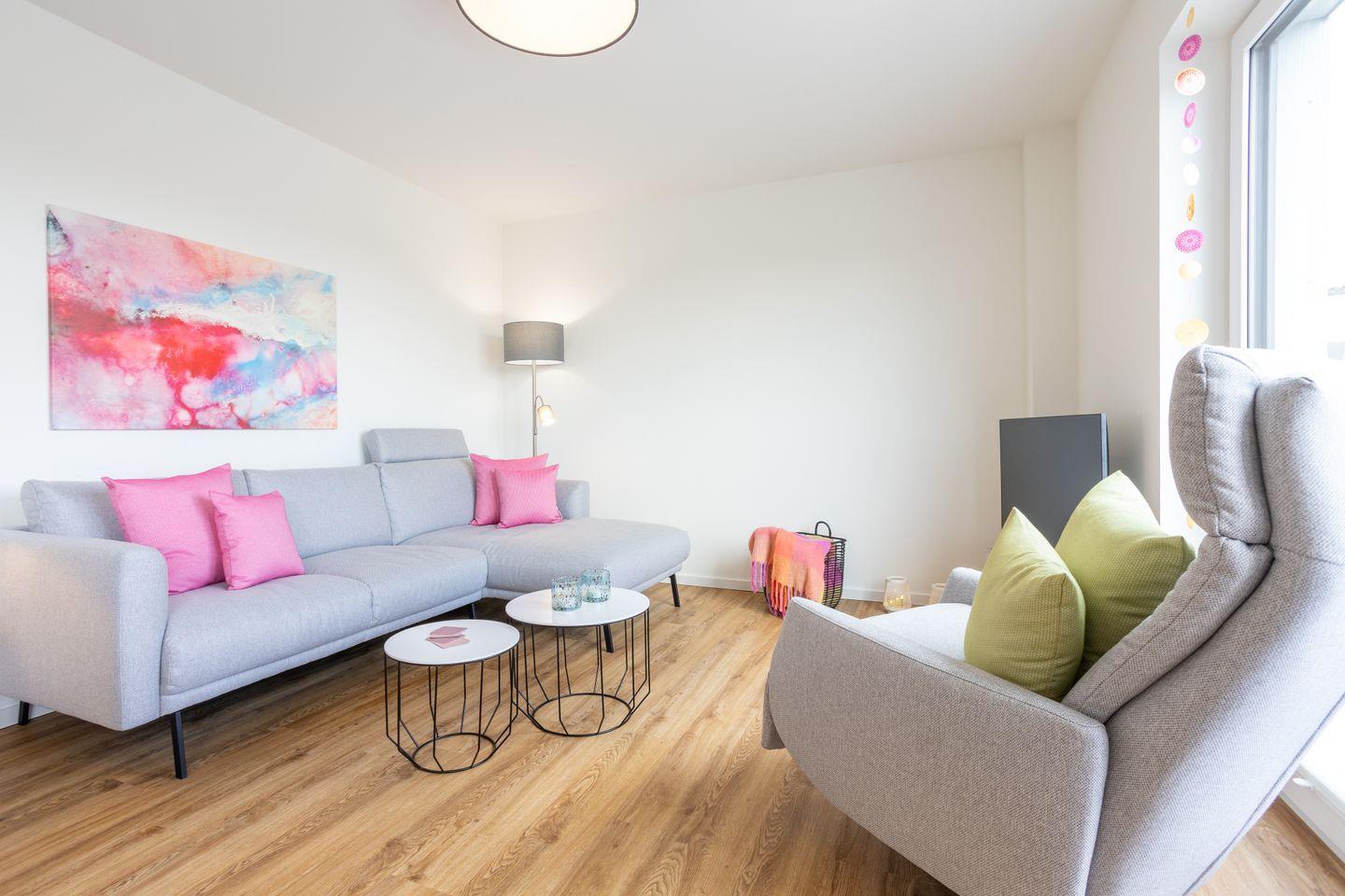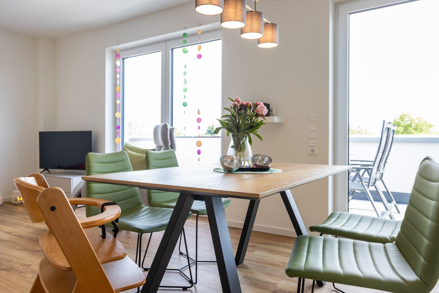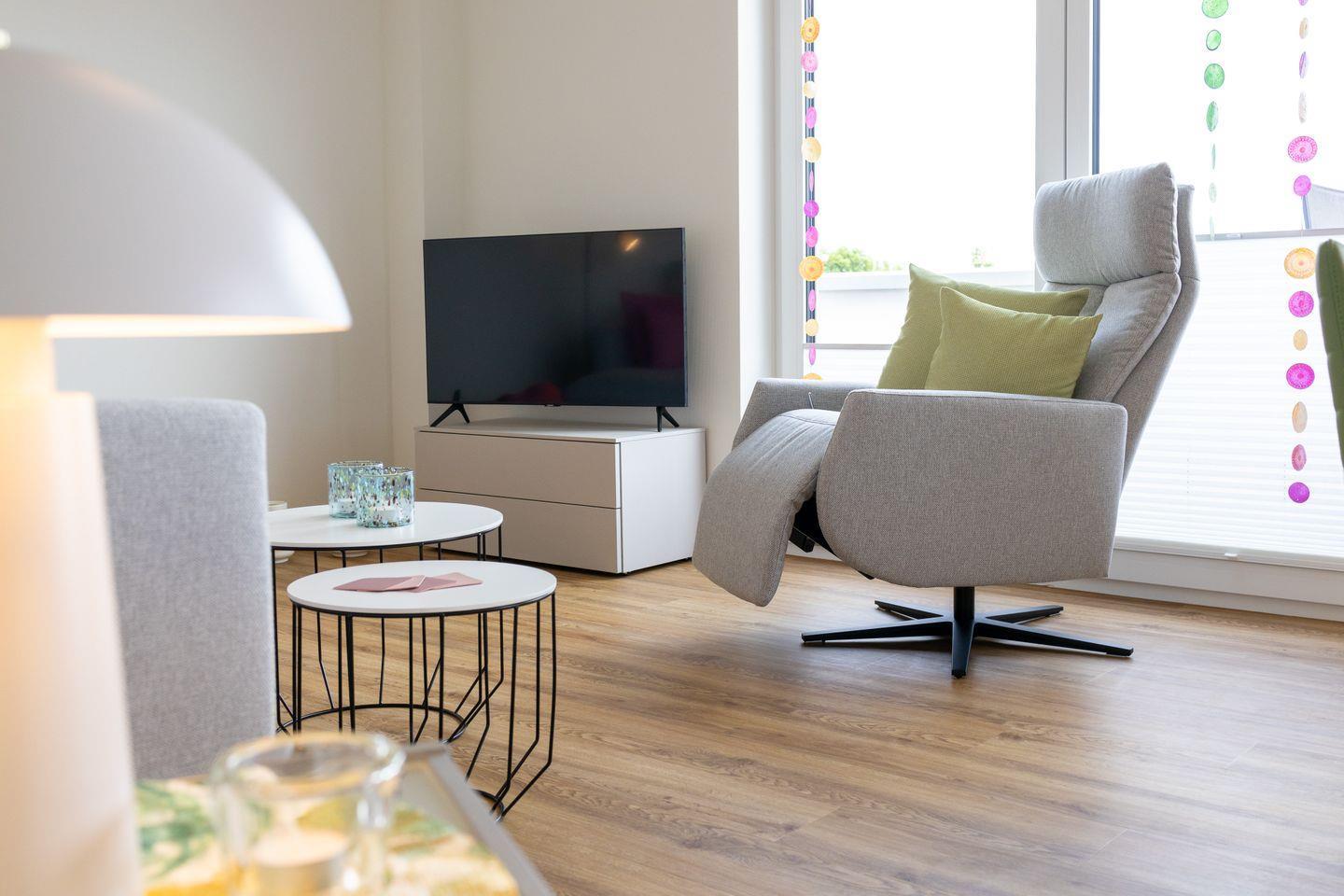 Im Wohnbereich erwartet dich eine freundliche Kombination aus Komfort und Design: ein großes Sofa, ein Flachbild-TV und ein Esstisch mit Platz für gemeinsame Mahlzeiten. Durch die großen Fenster gelangst du direkt auf den Balkon, wo du die Sonne und den weiten Ausblick genießen kannst.