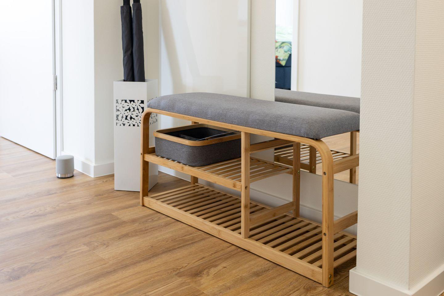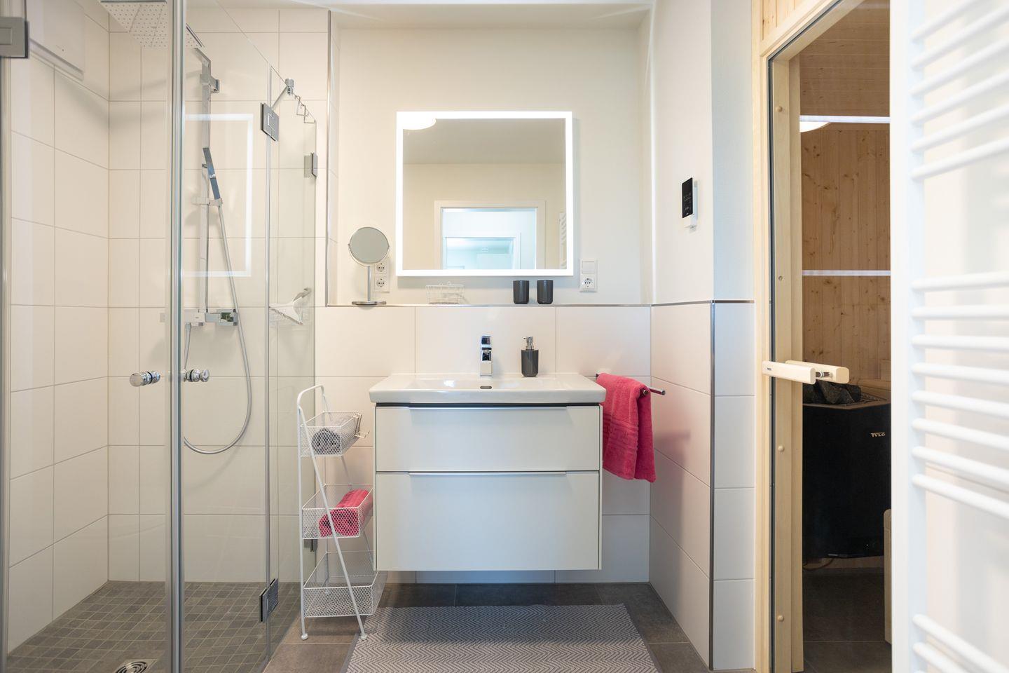 Das moderne Bad ist mit einer ebenerdigen Dusche, einem Waschbecken mit Spiegel und einem WC ausgestattet. Ein Fenster sorgt für Tageslicht und gute Belüftung. Hier kannst du dich nach einem Tag am Meer herrlich erfrischen.