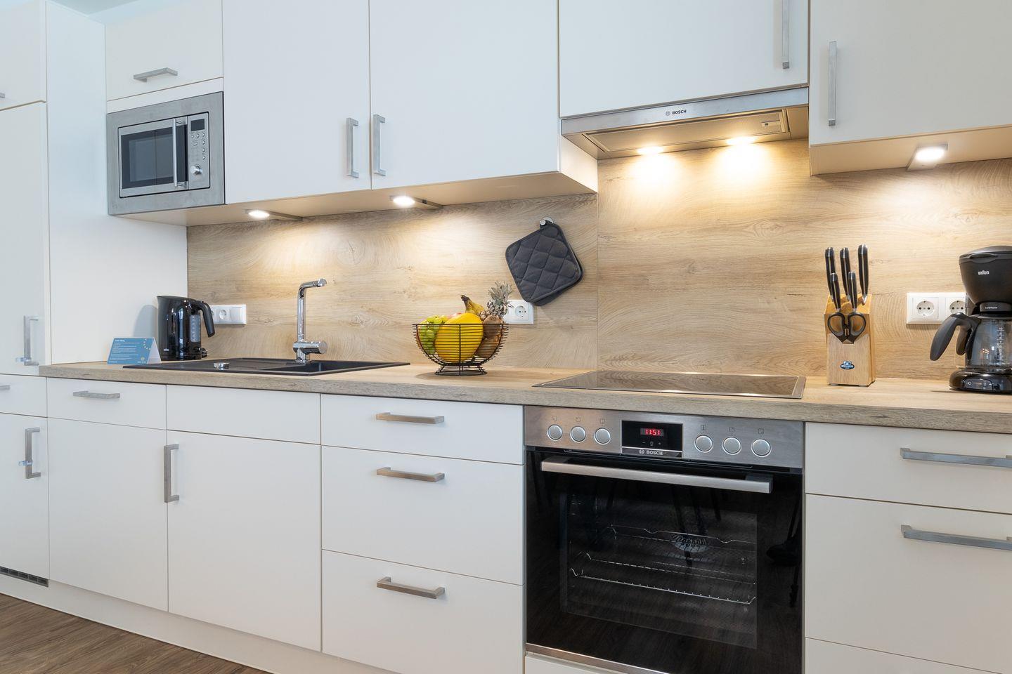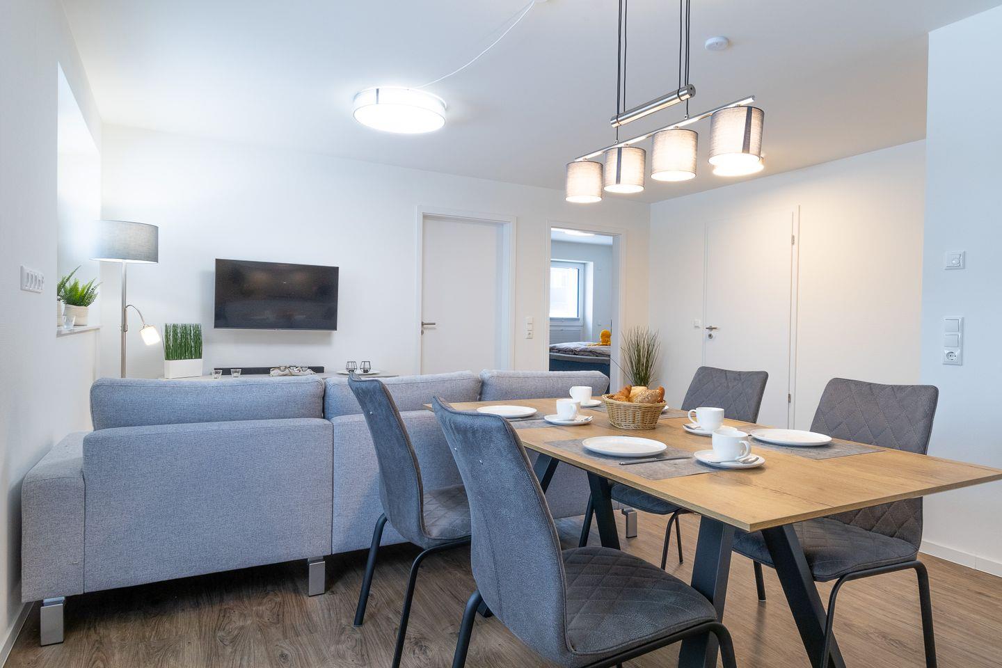 Der helle Wohnbereich bietet eine gemütliche Couch, Smart-TV und Zugang zur großen Terrasse mit Blick ins Grüne. Hier genießt du dein Frühstück oder einen entspannten Abend. Die offene Küche ist komplett ausgestattet und lädt zu gemeinsamen Mahlzeiten ein.