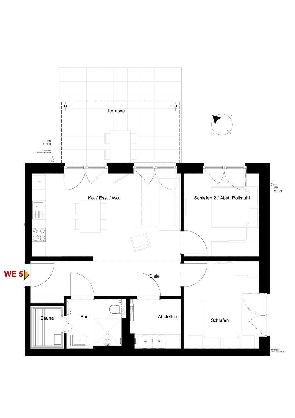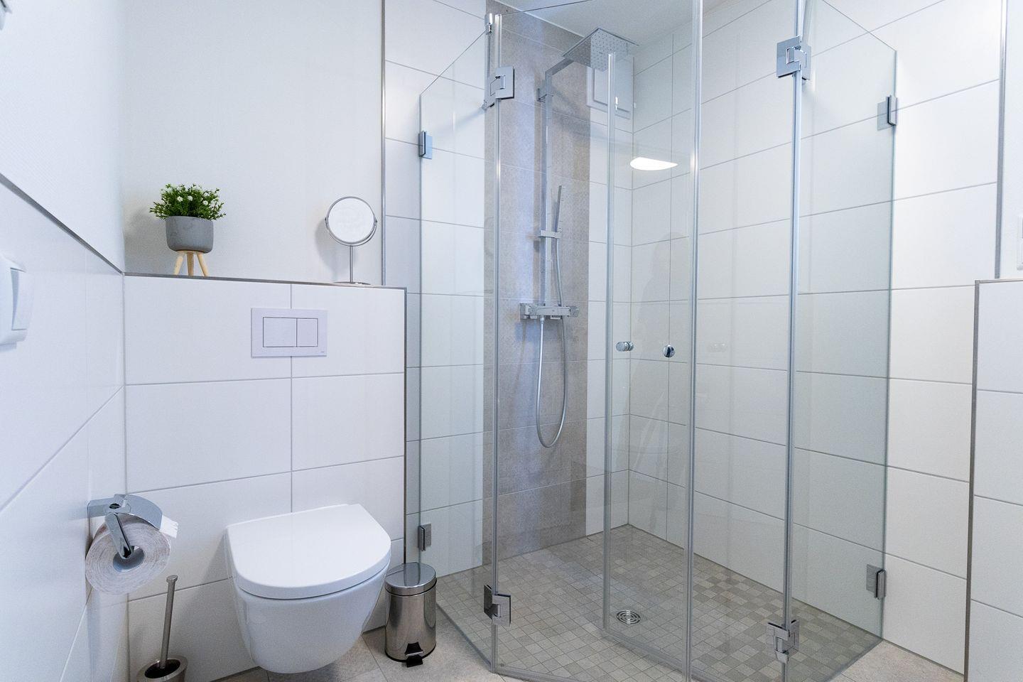 Dich erwartet ein modernes Bad mit ebenerdiger Dusche, privater Sauna, Handtuchwärmer und Waschmaschine.