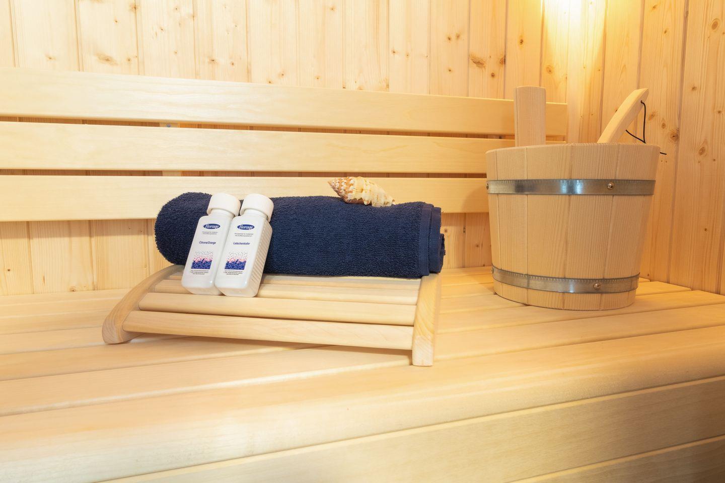 Das moderne Badezimmer ist deine private Wohlfühloase – mit bodentiefer Dusche und exklusiver Sauna für entspannende Momente nach einem Tag am Meer.