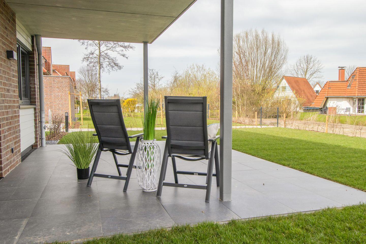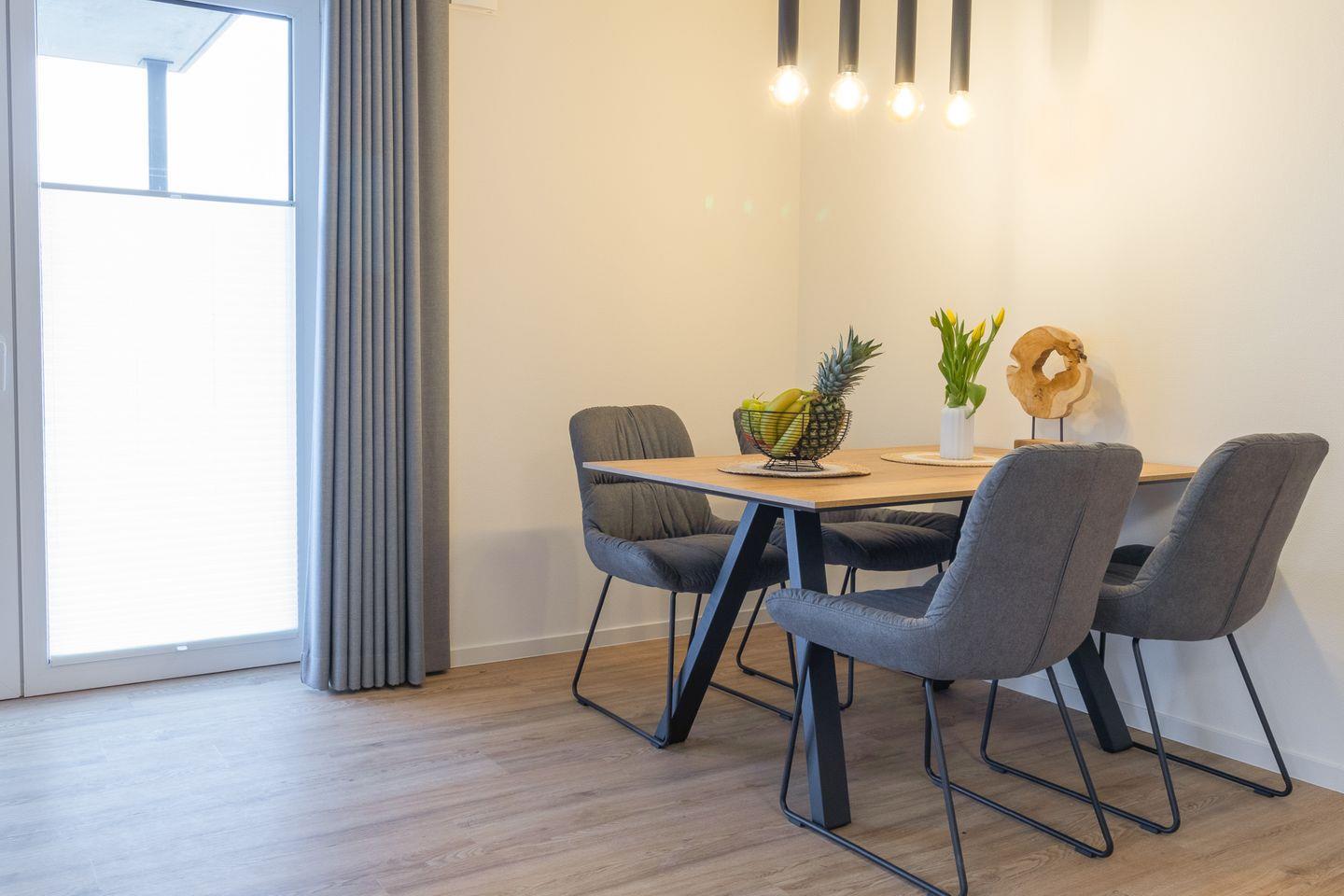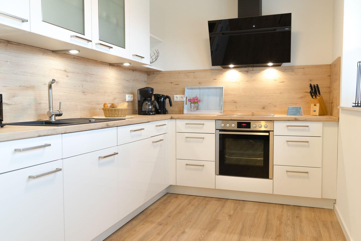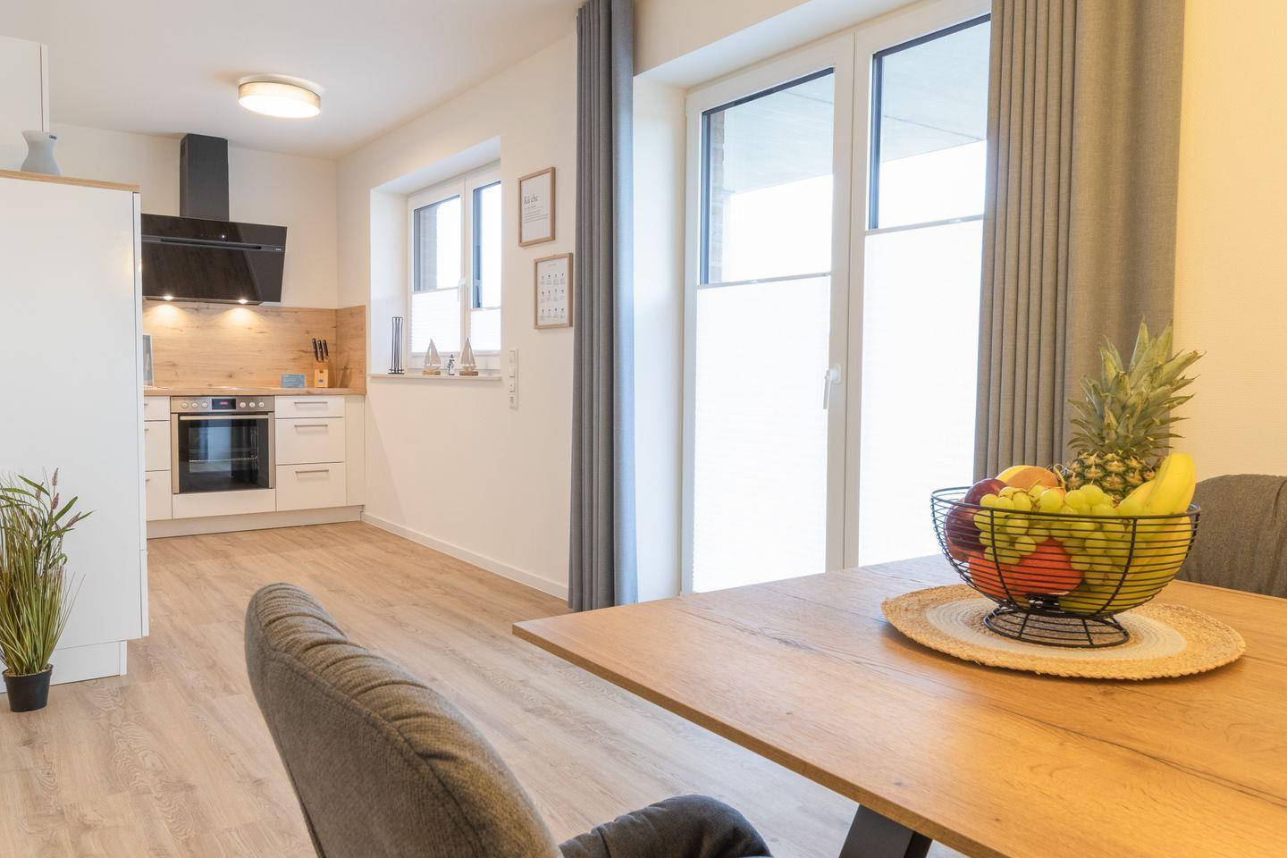 Im offenen Wohnbereich mit Schlafsofa, Relaxsessel und bodentiefen Fenstern kannst du dich wunderbar entspannen. Die angrenzende, voll ausgestattete Küche mit Essplatz lädt zu gemeinsamen Mahlzeiten ein. Von hier gelangst du direkt auf die möblierte Terrasse mit kleinem Garten – perfekt für sonnige Stunden an der frischen Seeluft.