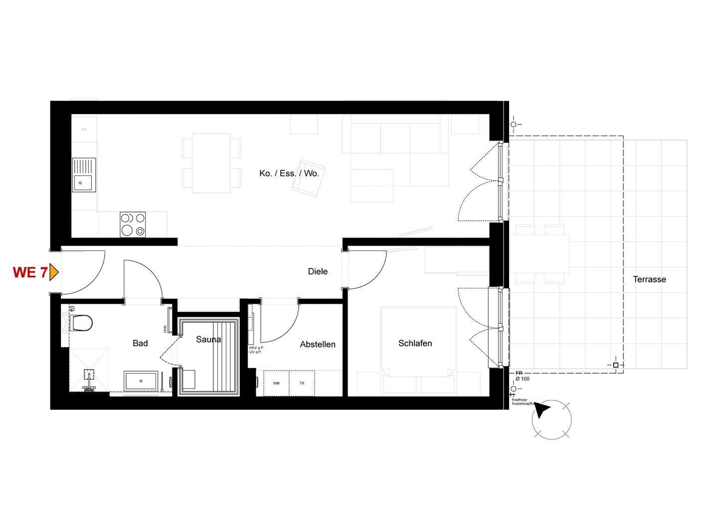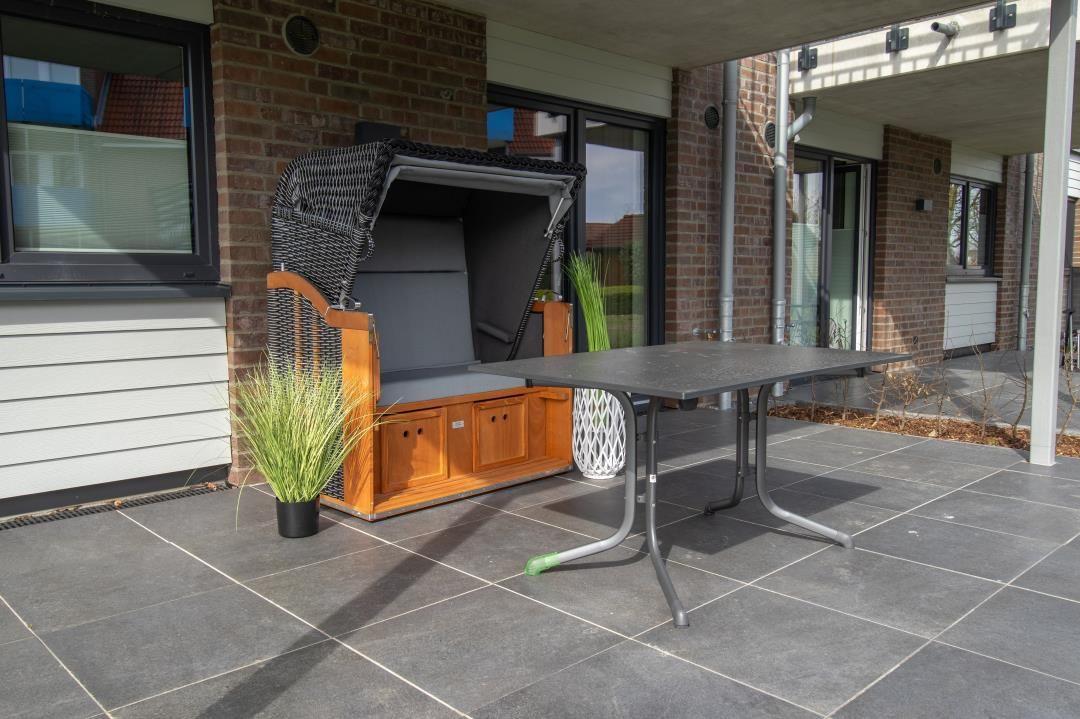 Der offen gestaltete Wohnbereich mit Couch, Essplatz und voll ausgestatteter Küche lädt zum Verweilen ein. Durch die bodentiefen Fenster gelangst du direkt auf die private Terrasse – ideal für ein Frühstück an der frischen Luft oder einen Sonnenuntergang bei Nordseewind.