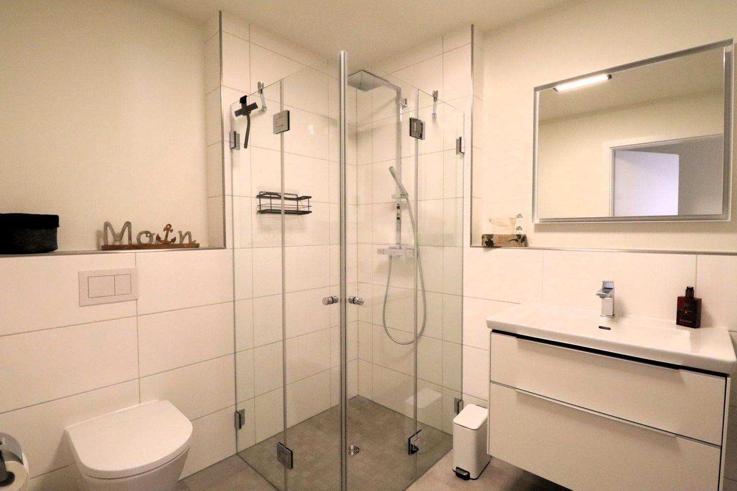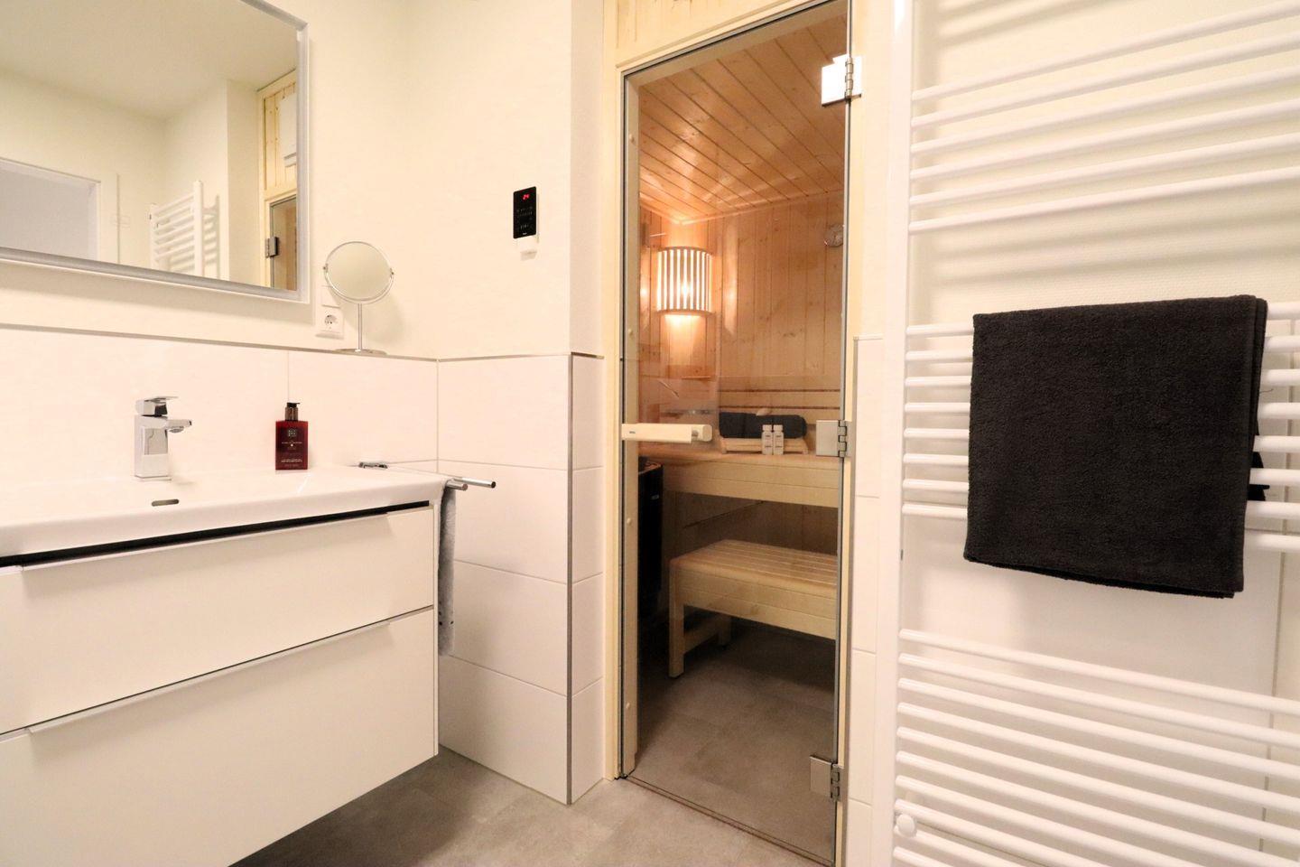 Das modern gestaltete Bad ist mit einer ebenerdigen Dusche ausgestattet. Ein echtes Highlight ist die private Sauna – ideal für entspannte Abende nach einem Spaziergang am Meer oder einem Ausflug ins Watt.