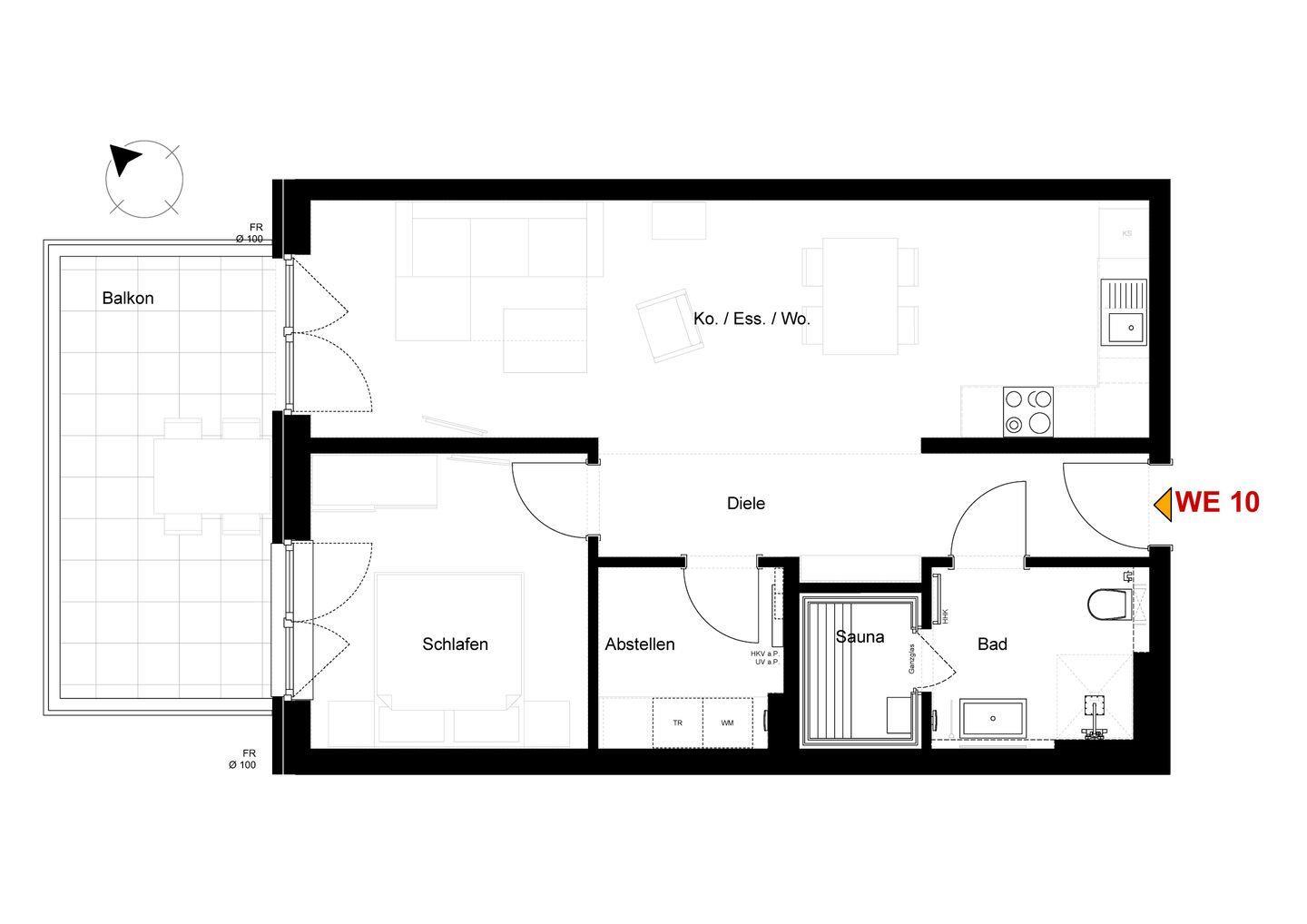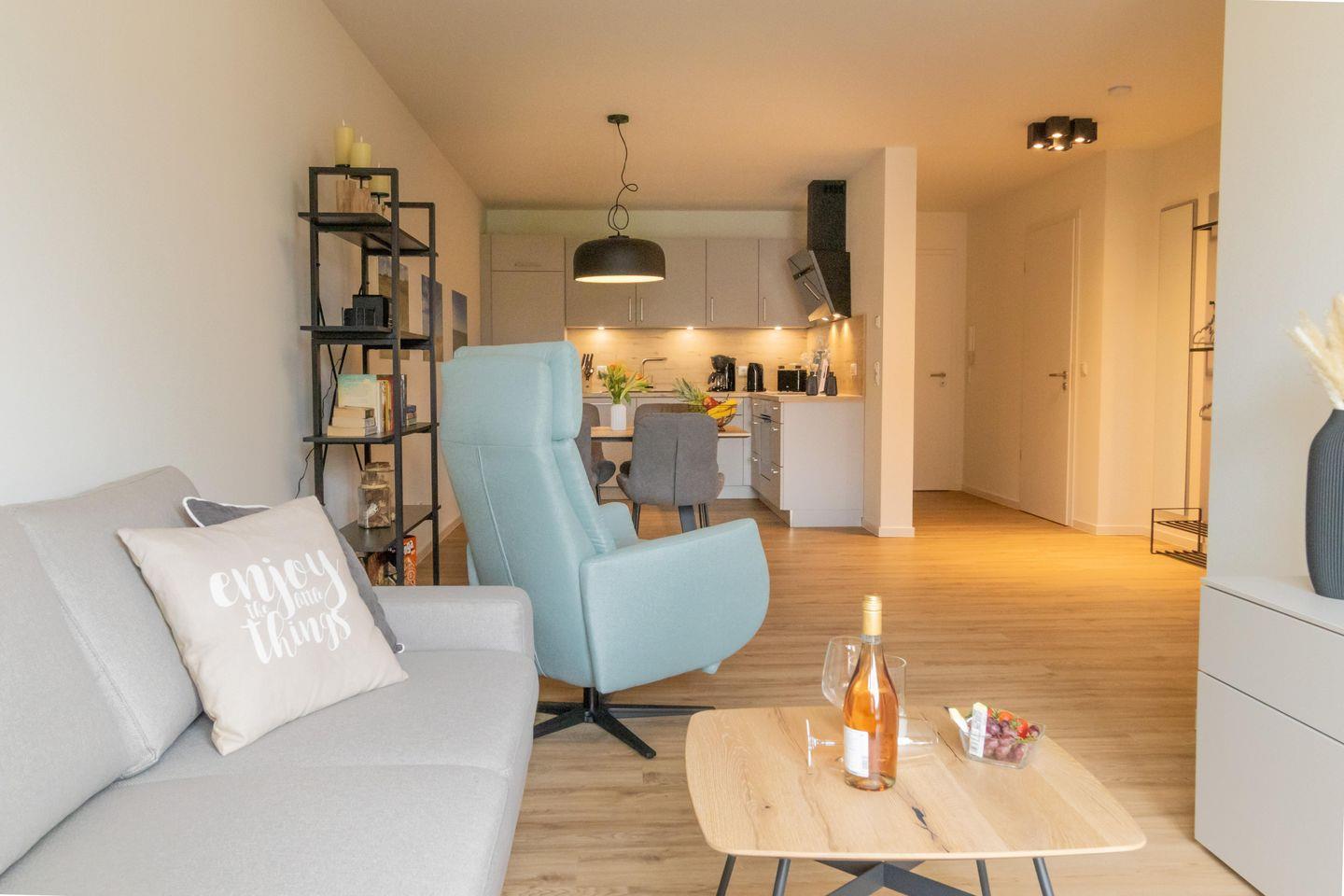 Der großzügige Wohnbereich mit Schlafcouch bietet viel Platz zum Entspannen. Bodentiefe Fenster sorgen für lichtdurchflutete Räume, der Balkon lädt zu Frühstück in der Morgensonne oder einem Glas Wein am Abend ein. Die offene Küche ist voll ausgestattet und bietet alles, was ihr für gemeinsame Kocherlebnisse braucht – inklusive Geschirrspüler, Backofen, Kaffeemaschine und mehr.