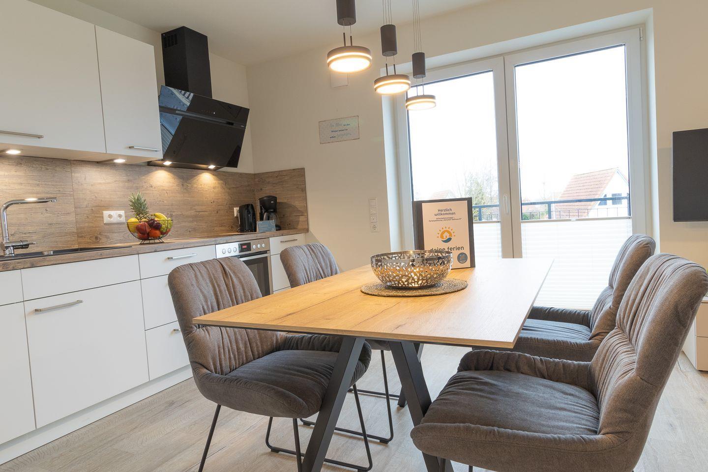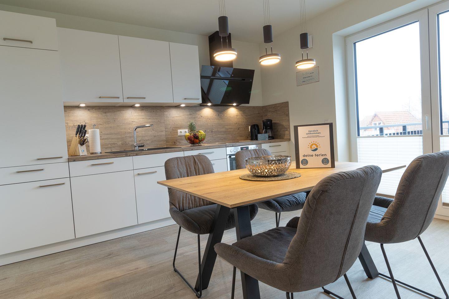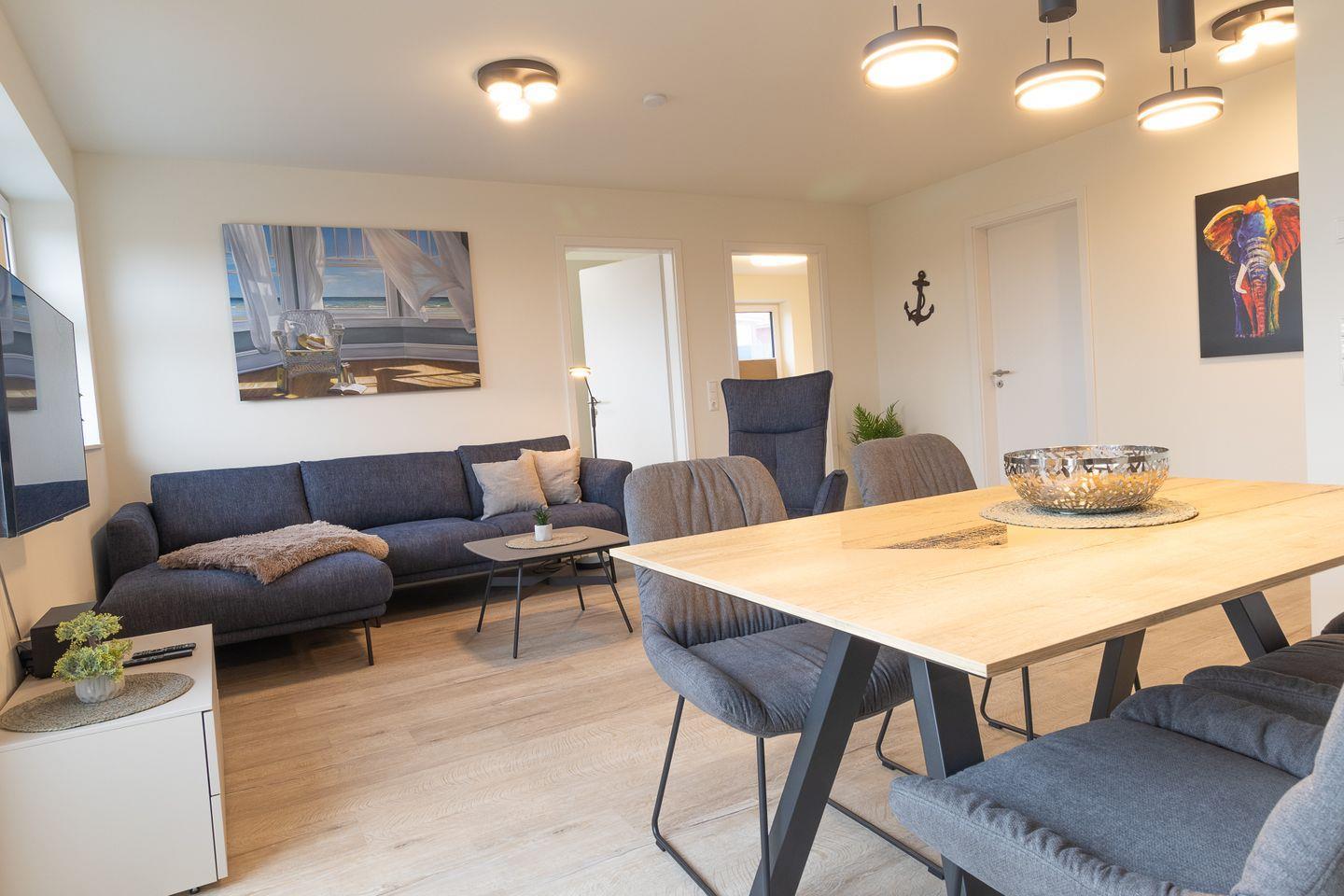 Der lichtdurchflutete Wohnbereich mit bodentiefen Fenstern geht fließend in den Essbereich und die offene Küche über. Hier findest du alles, was du für gemeinsame Kochmomente brauchst – von modernen Geräten bis hin zu einem großen Esstisch für gemütliche Runden. Auf dem angrenzenden Balkon genießt du frische Nordseeluft und sonnige Stunden im Freien.