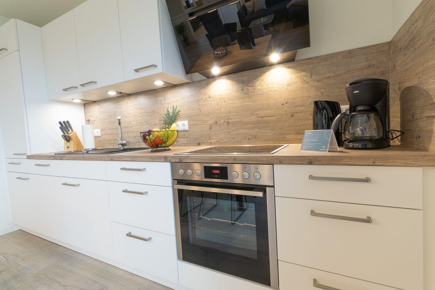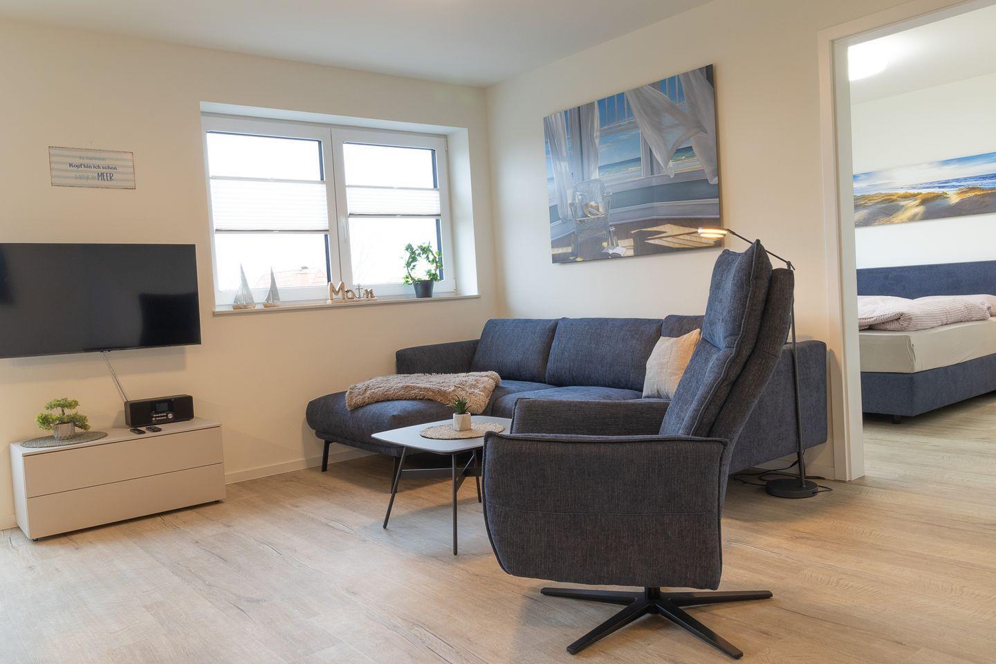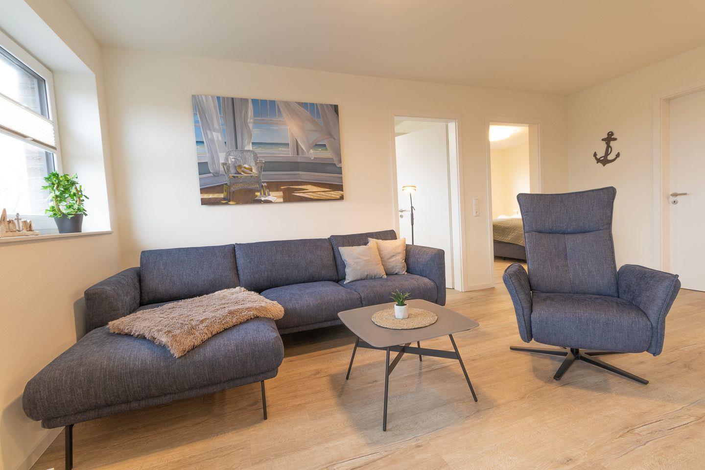 Der lichtdurchflutete Wohnbereich mit bodentiefen Fenstern geht fließend in den Essbereich und die offene Küche über. Hier findest du alles, was du für gemeinsame Kochmomente brauchst – von modernen Geräten bis hin zu einem großen Esstisch für gemütliche Runden. Auf dem angrenzenden Balkon genießt du frische Nordseeluft und sonnige Stunden im Freien.