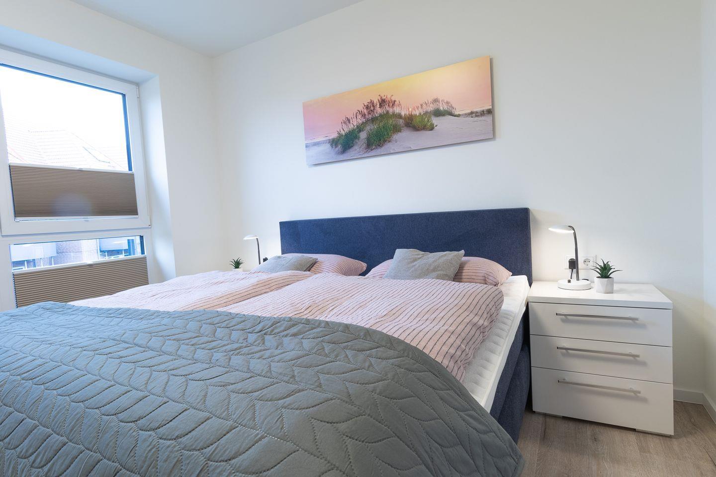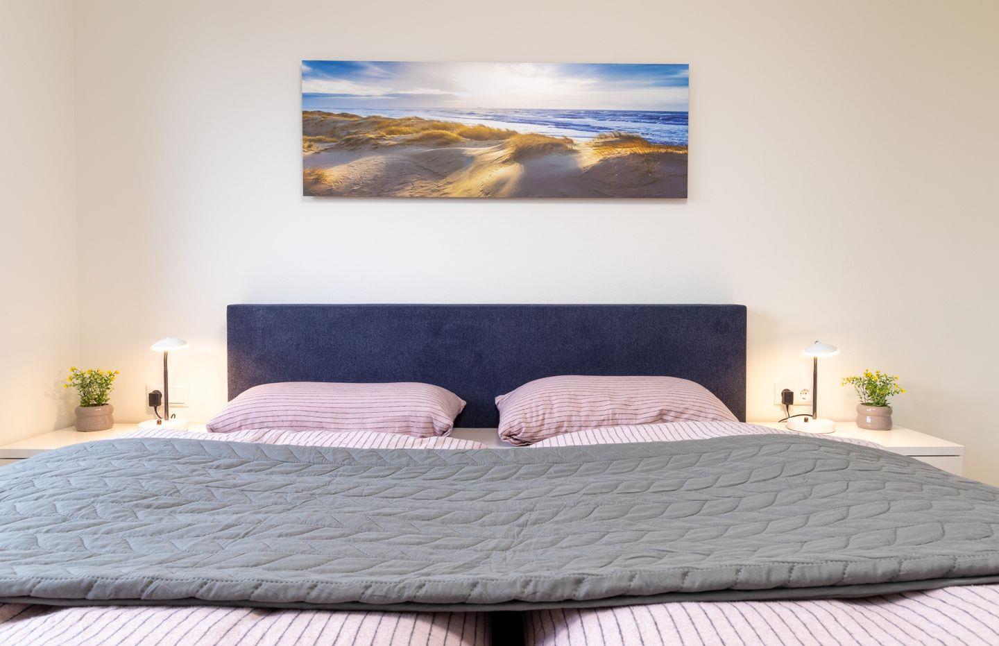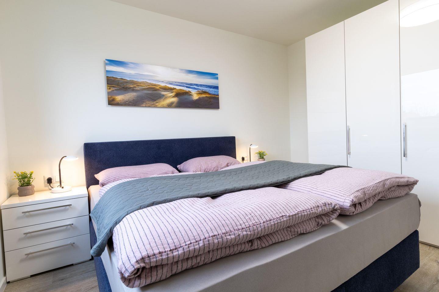 Zwei komfortable Schlafzimmer mit hochwertigen Boxspringbetten sorgen für erholsame Nächte. Verdunkelungsplissees schaffen die passende Schlafatmosphäre, während geräumige Schränke ausreichend Platz für deine Urlaubsgarderobe bieten.